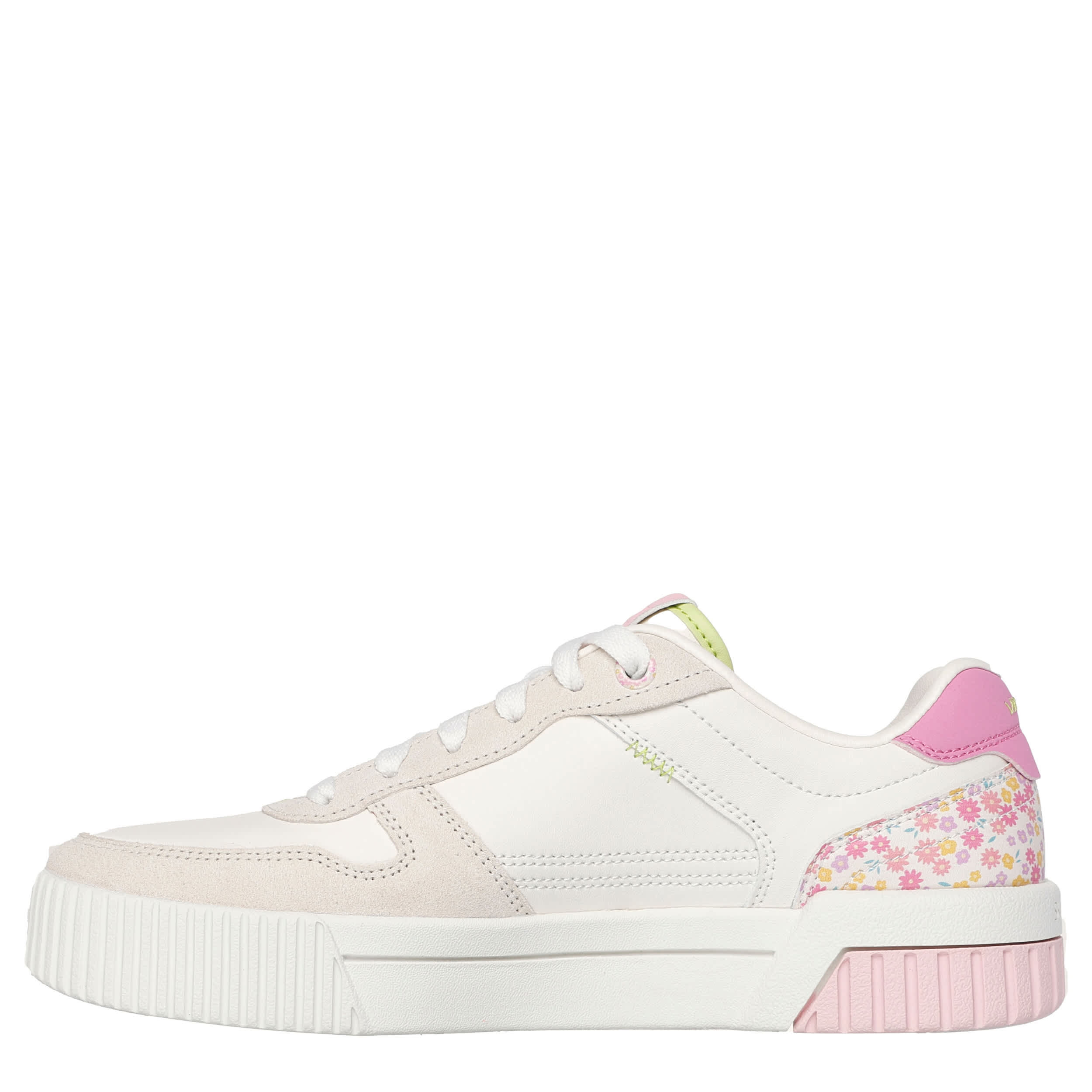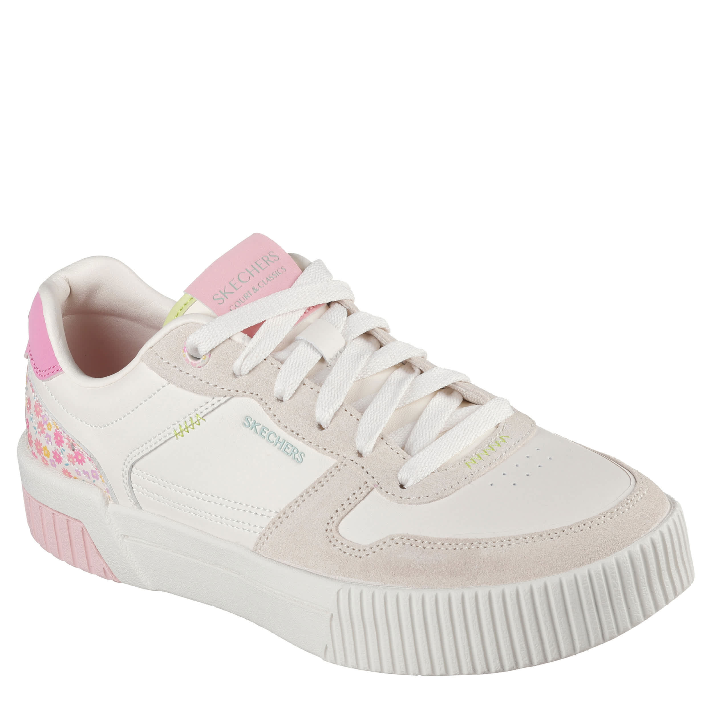 Sleek, graceful style is what the Court Classics Jade - Dainty Florals sneaker from Skechers is all about. Featuring a faux neutral upper with a floral print on the heel for extra flair, this court shoe is just refined enough. The Skechers Air-Cooled Memory Foam® insole cushions every step, while the outsole offers flexible traction.