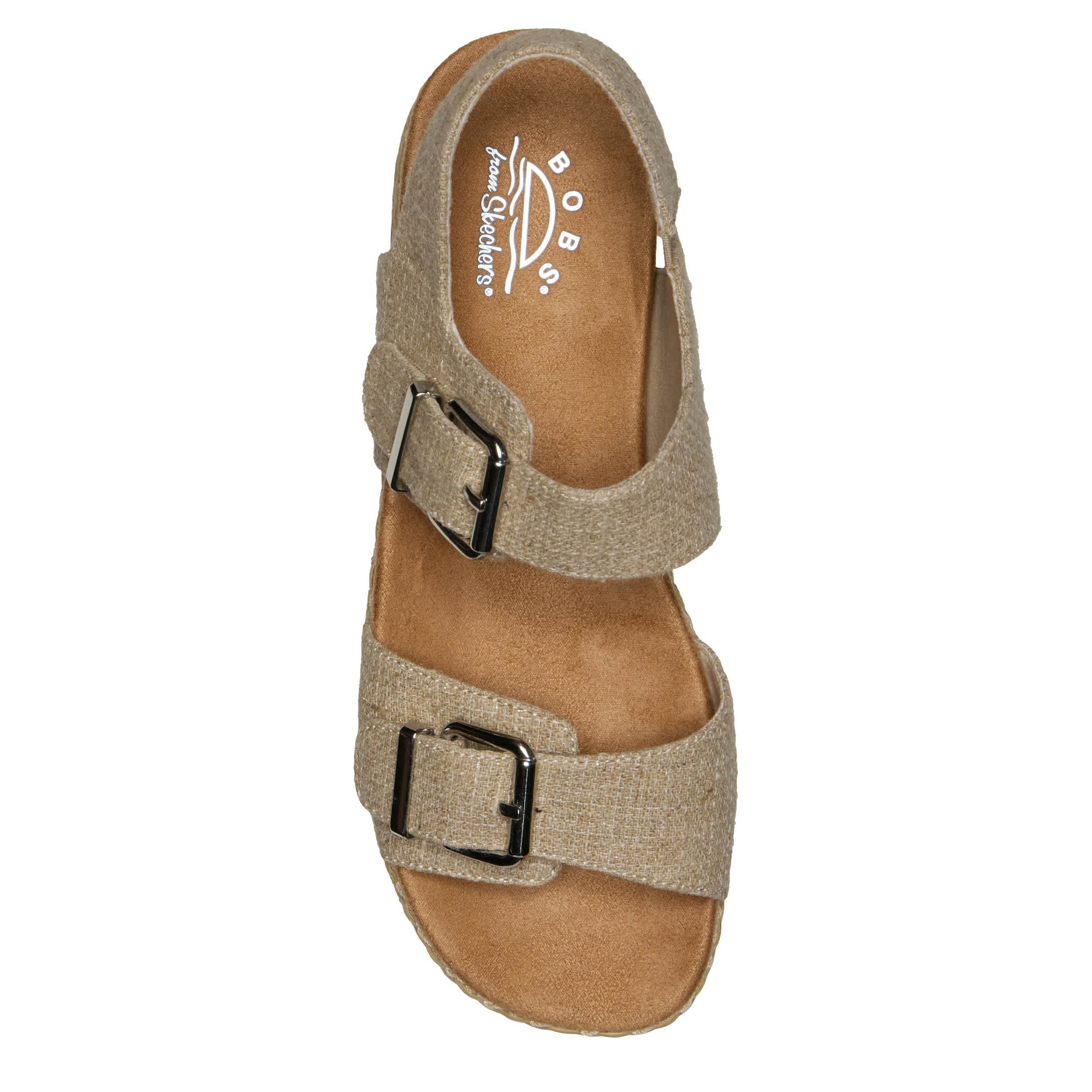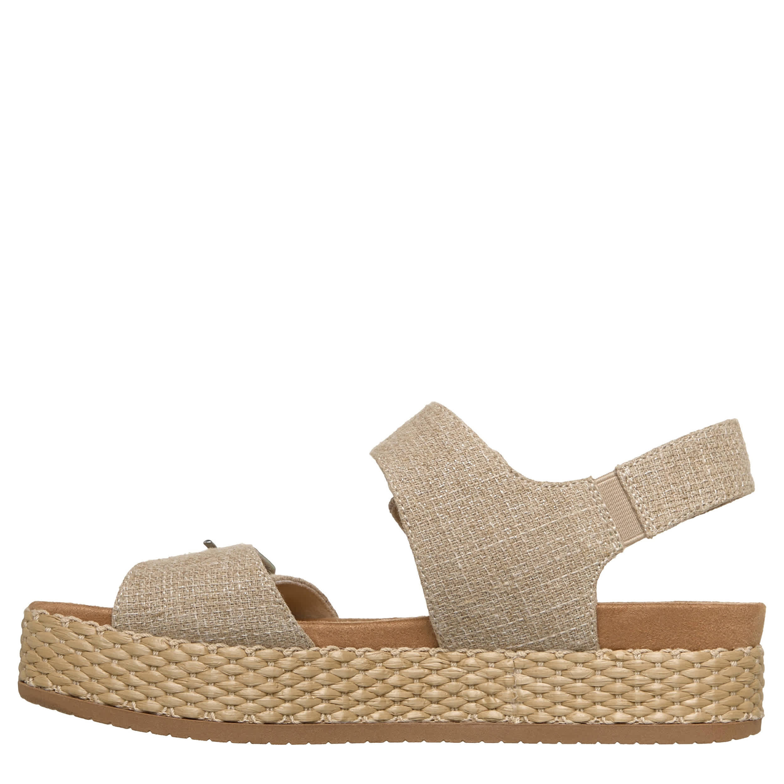 Take your time this summer in the BOBS® from Skechers® Misty Kiss - Summer Stroll sandal. Featuring a sparkle hemp upper with double buckle straps for a secure fit, this slingback sandal is all set for sunny days. The comfy footbed cushions your steps, while the flatform midsole adds stable lift.