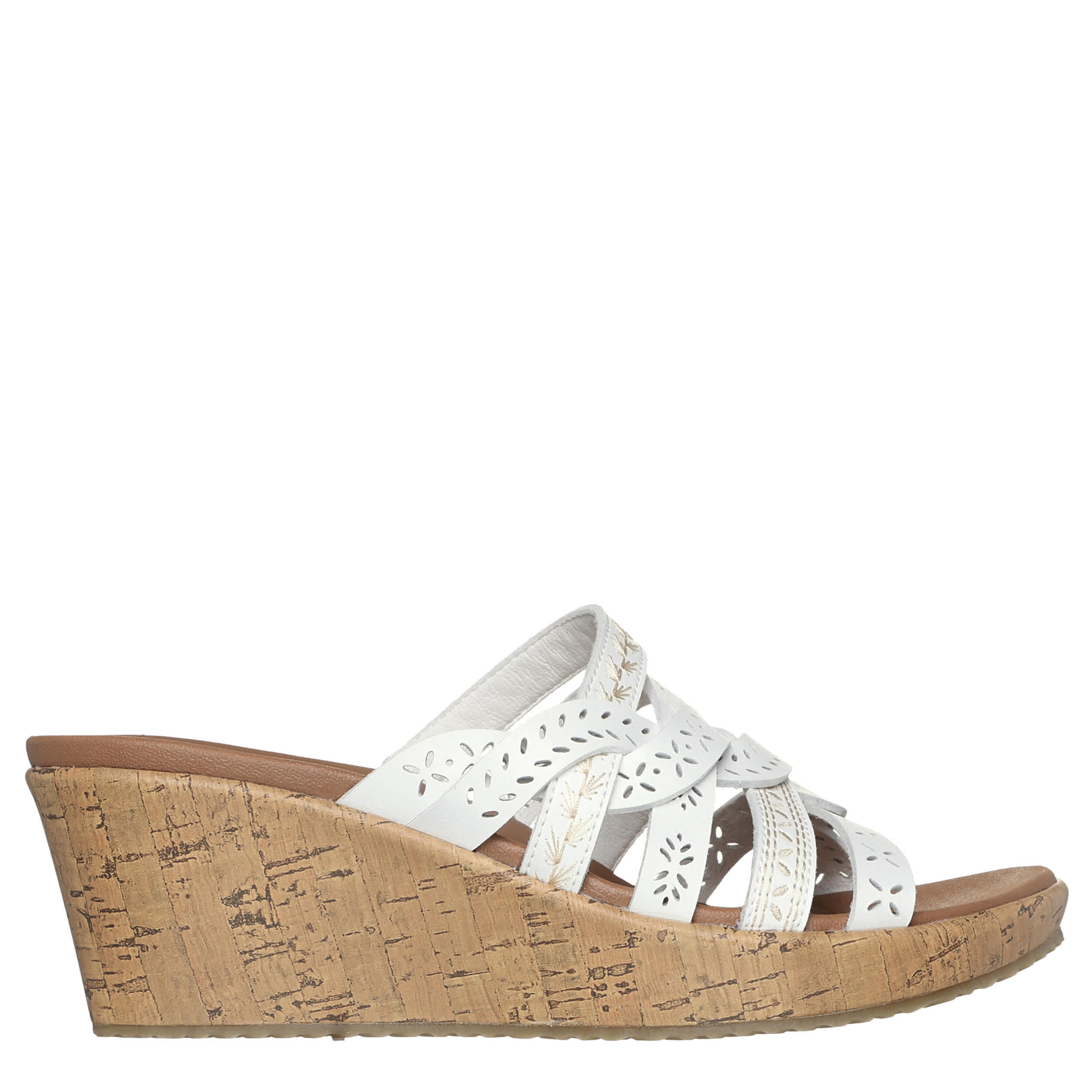 Summer can't come back around fast enough to show off the Beverlee - New Resort women's wedge sandal from Skechers Cali. Featuring a lasercut duraleather upper with interwoven design for extra appeal, this stylish sandal looks amazing with capris or a maxi dress. The Luxe Foam® footbed cushions while the natural cork veneer midsole adds½" of platform height to the wedge heel.