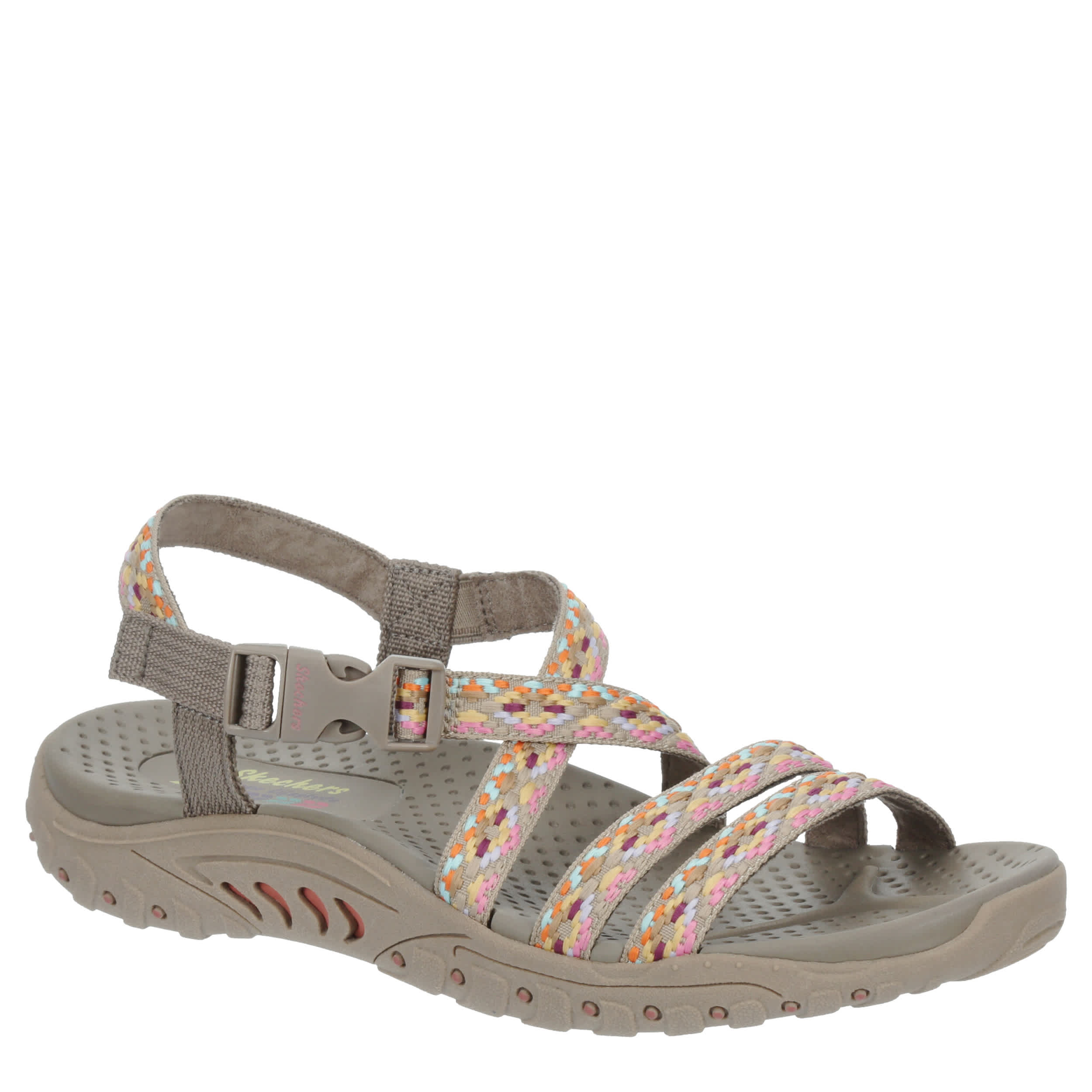 Get back to your warm weather style in the Reggae - Sew Me women's outdoor sandal from Skechers Modern. Featuring a woven nylon web fabric upper with a soothing fabric lining, this boho-designed shoe crosses over your ankle for a secure fit with quick-access buckle. The footbed cradles your foot as well offers arch support and a toe ridge for your comfort.