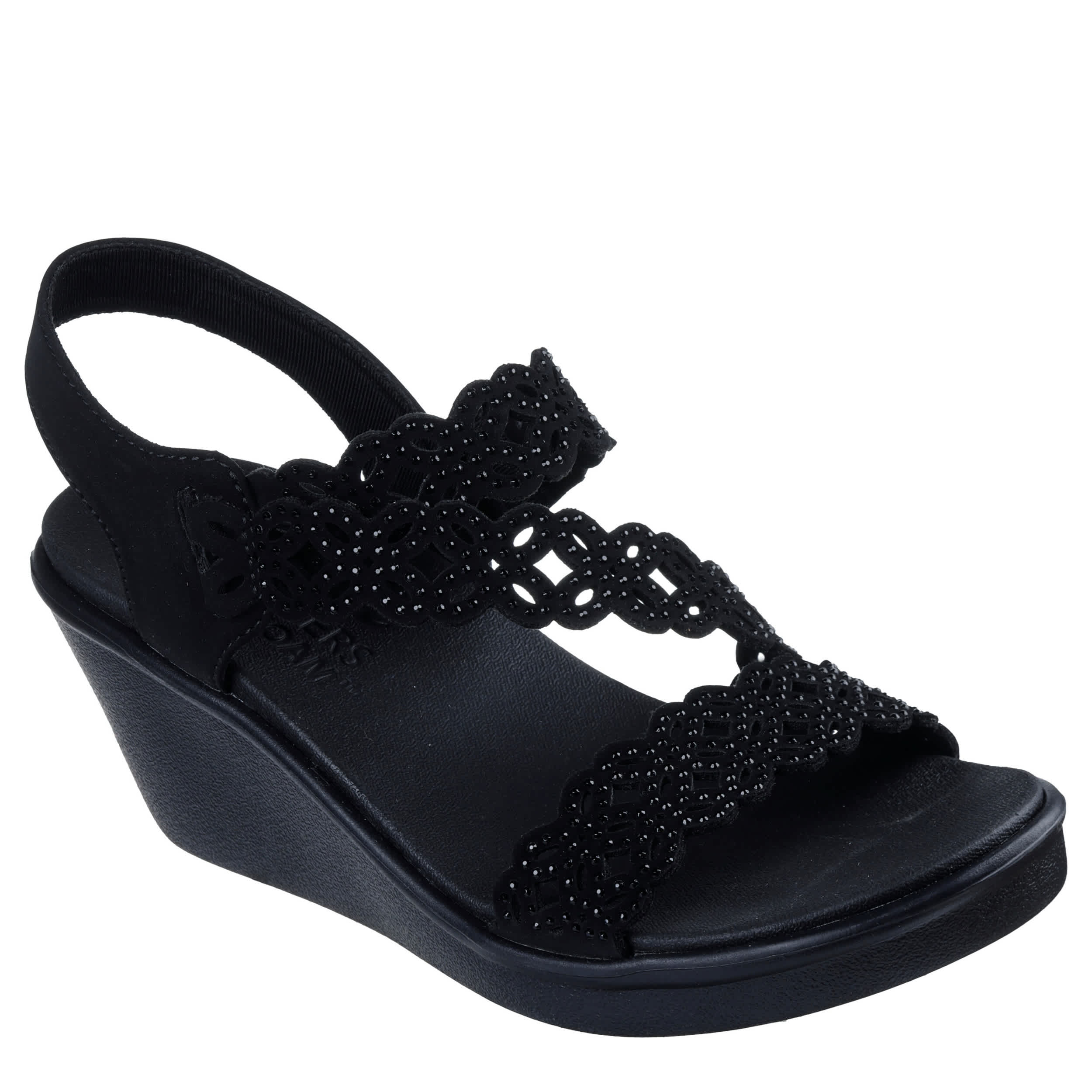 Have fun in the Skechers Cali® Rumble On - Sassier Dayz wedge sandal. With a laser cut upper featuring rhinestone embellishments for extra flair, this vegan slingback is attractive and indeed, even more cheeky. Soft Luxe Foam® cushioning and a high wedge provide glam style with more than enough lift.