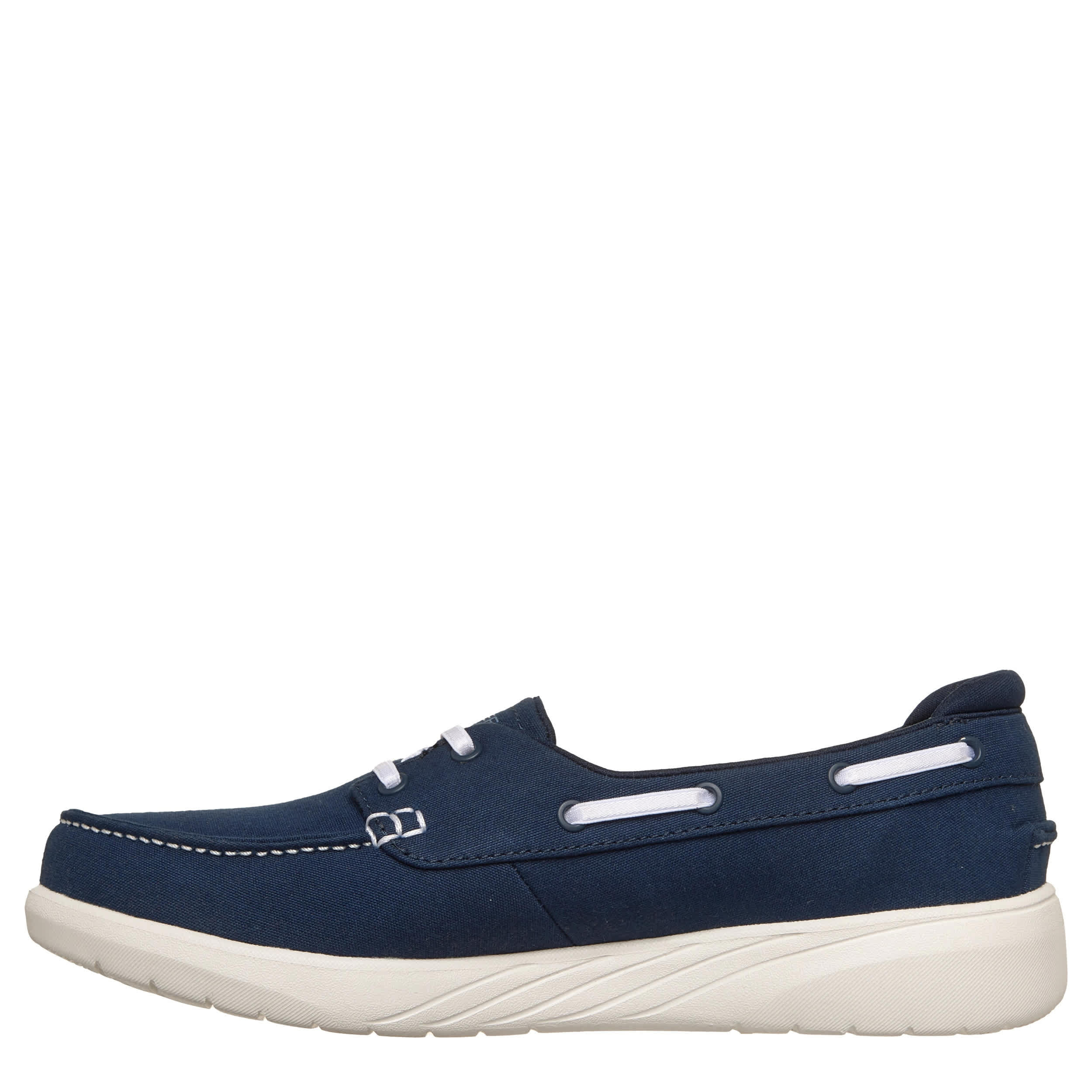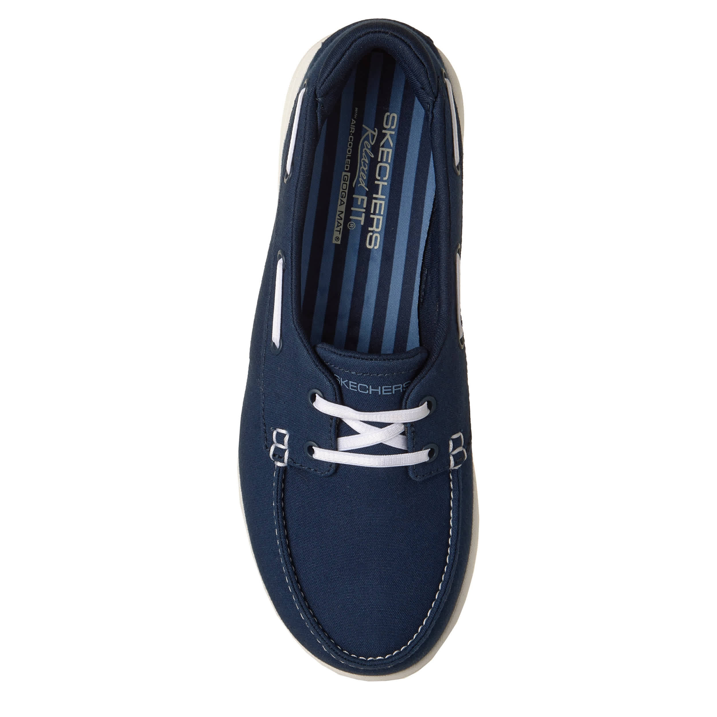 Hit the deck with the Skechers Relaxed Fit®: Flex Adapt - Oceanside women's boat shoe. Featuring a vegan canvas upper with contrast stitching for extra flair, this style is roomy and machine washable for easy maintenance. The high-rebound Skechers Air-Cooled Goga Mat™ insole and lightweight ULTRA GO® cushioning give breezy comfort, while the outsole provides flexible traction everywhere.