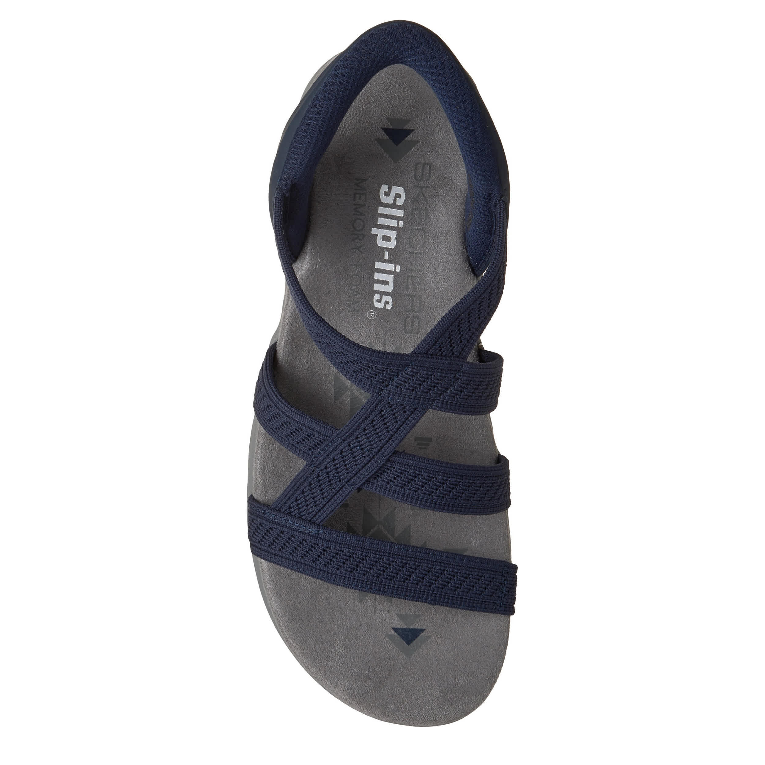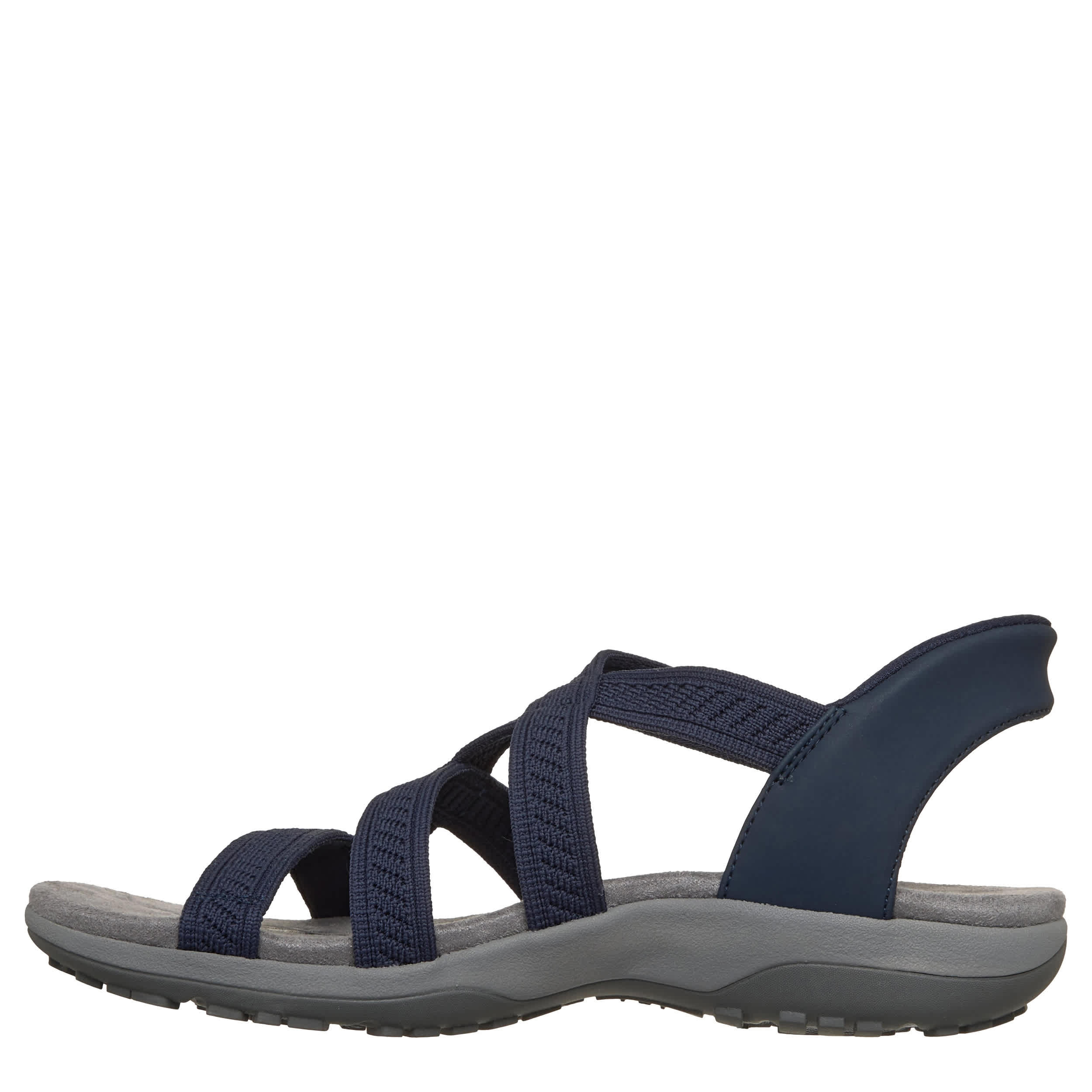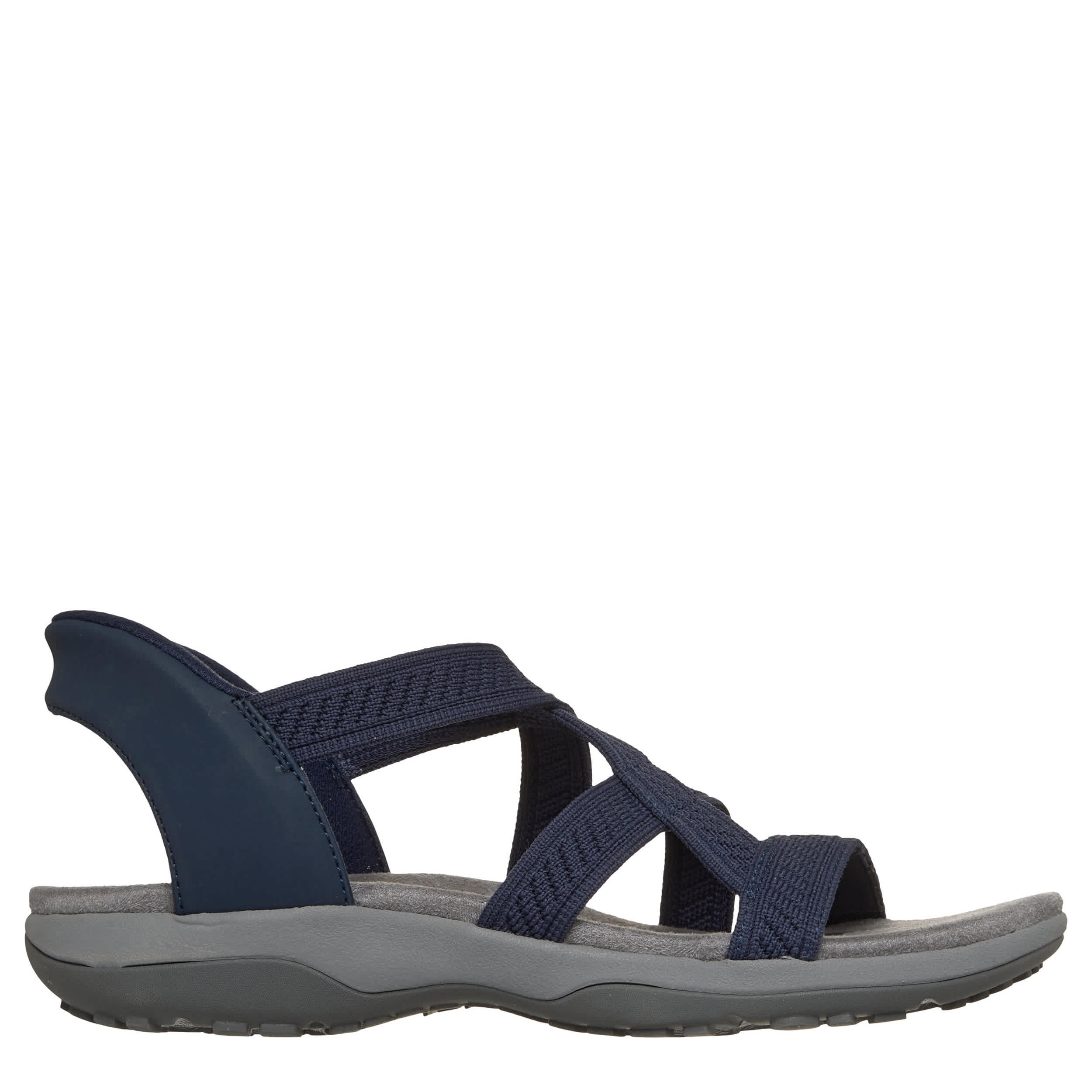 Take your time in the Slip-ins: Reggae Slim - Stretch Flex2 women's sandal from Skechers. With a Stretch Fit® vegan upper featuring the Heel Pillow™ for a padded, secure fit, this Skechers Hands Free Slip-in® has a built-in 1" heel. The contoured footbed cushions every step, while the outsole offers flexible traction.