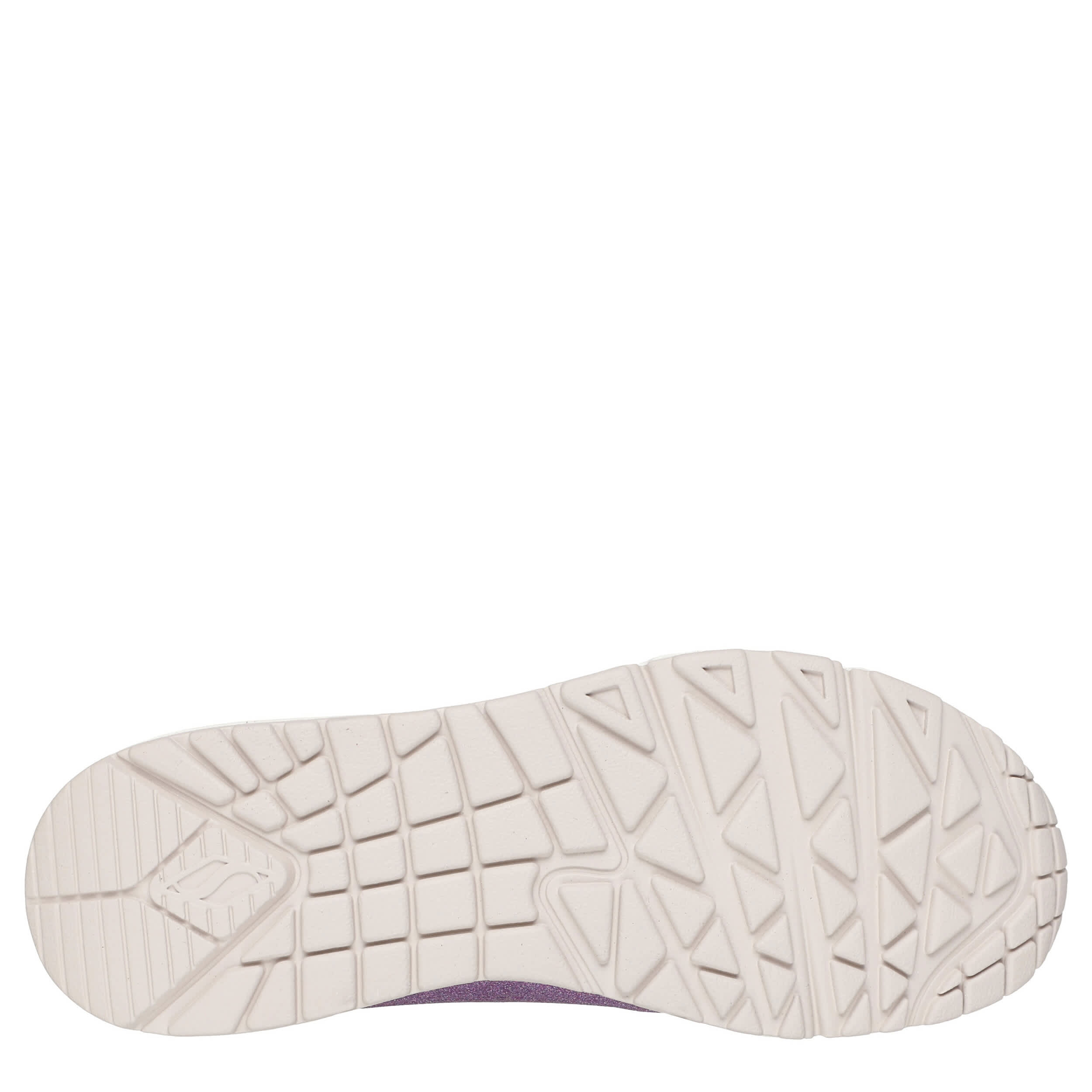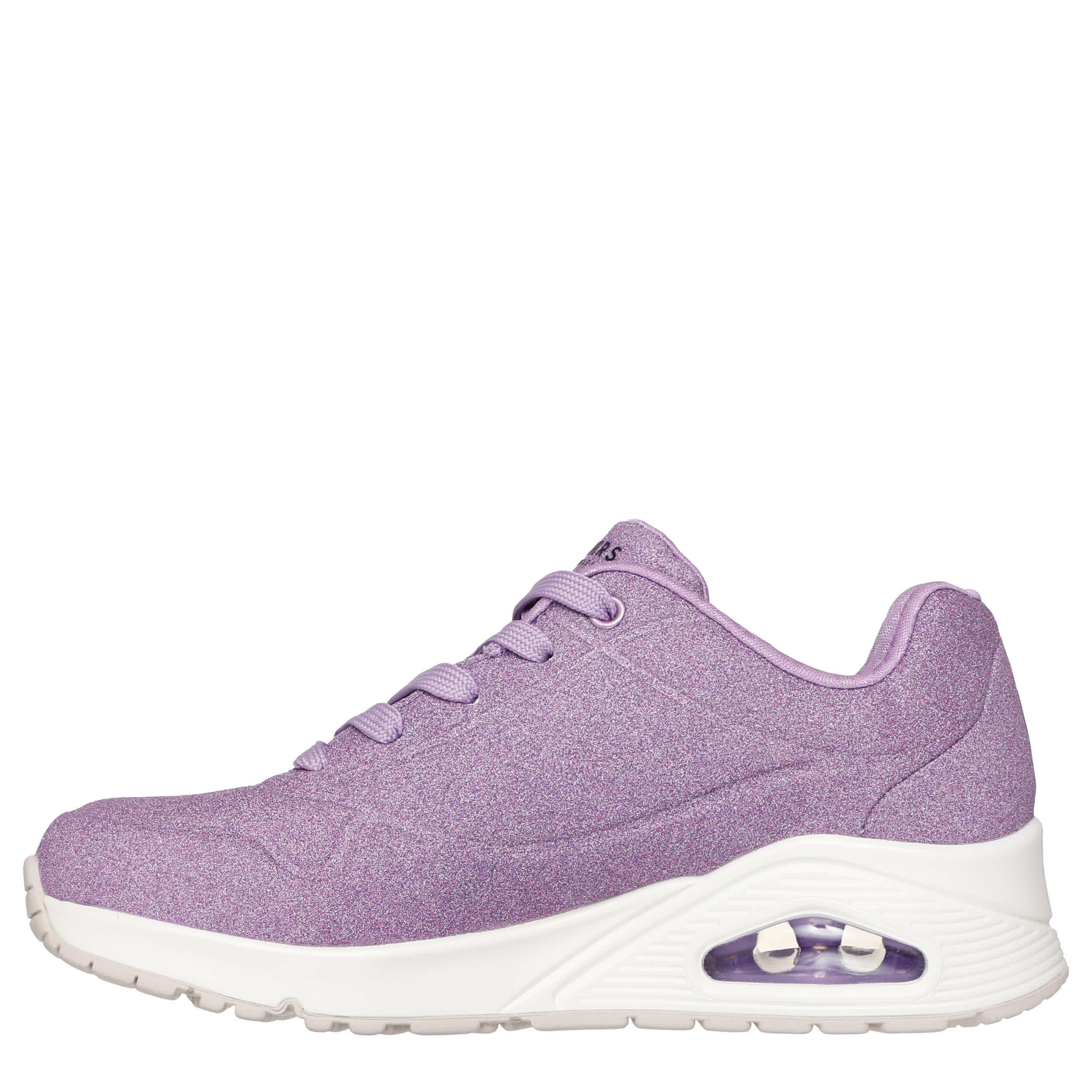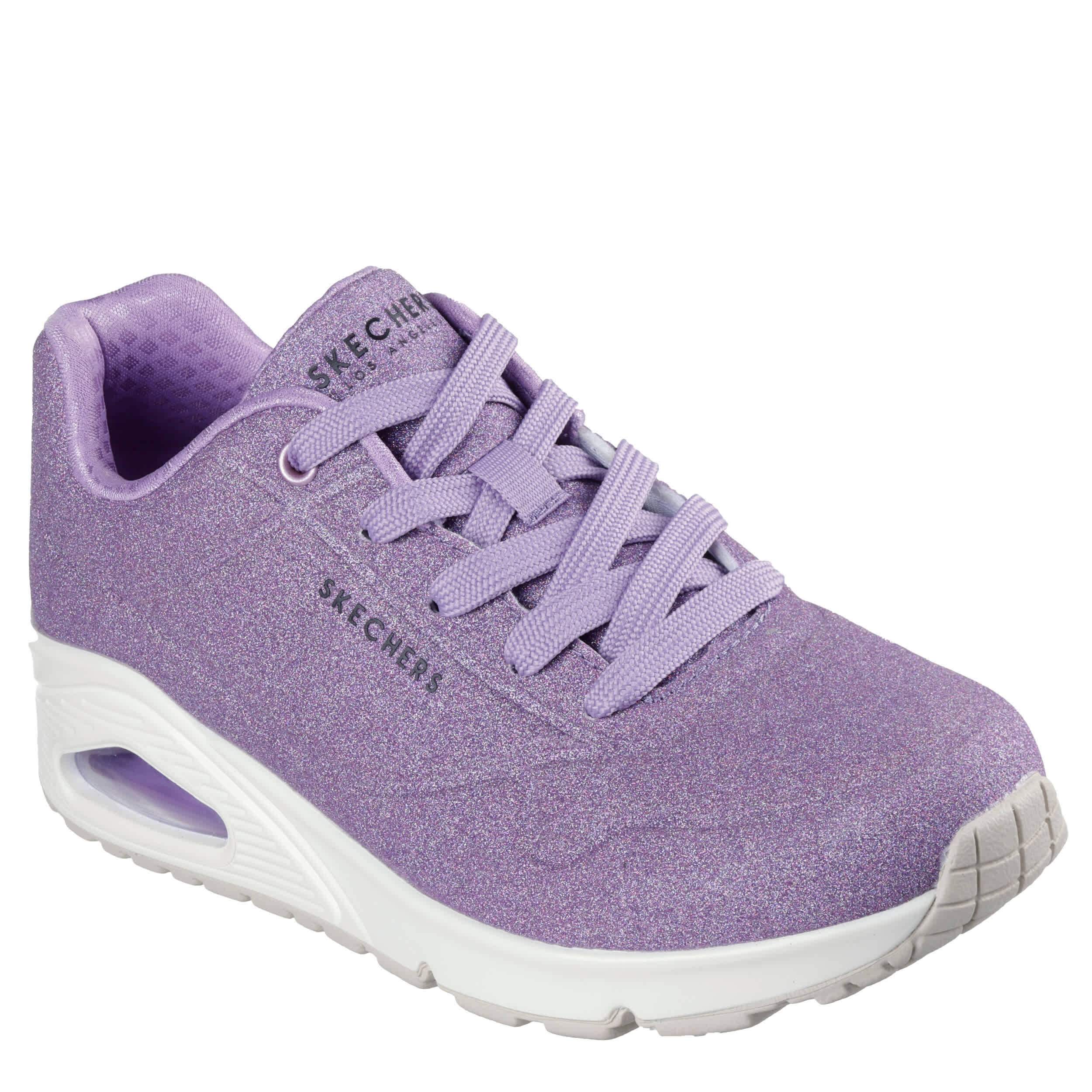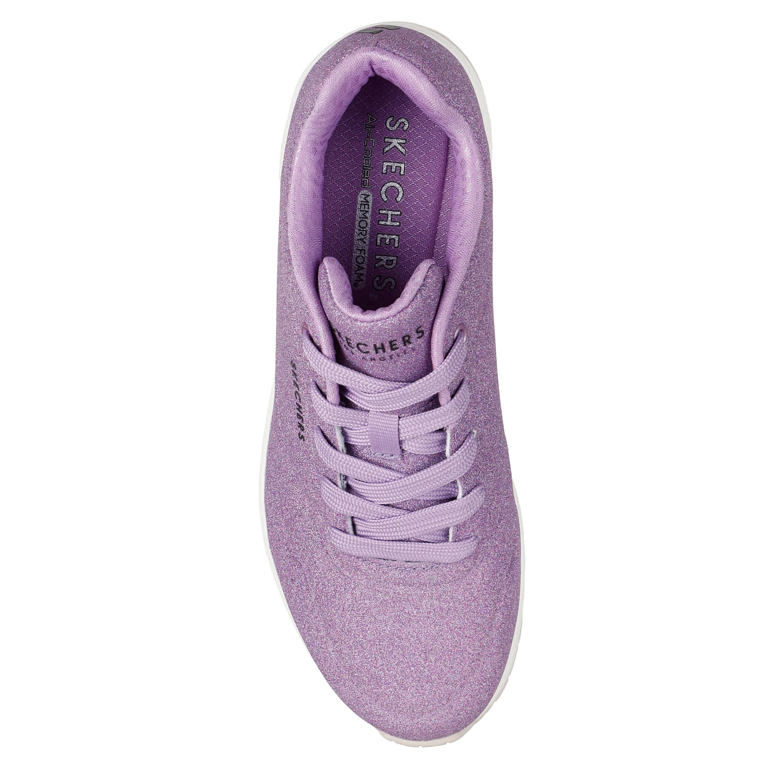 Sparkle for summer, everyday, in the Skechers Street™ Uno - Glitter Bomb sneaker. Featuring a synthetic glitter upper, this lace-up shoe adds a fun pop of shine to your wardrobe. The Skechers Air-Cooled Memory Foam® insole & Skech-Air® midsole cushion every step, while the outsole offers flexible traction.