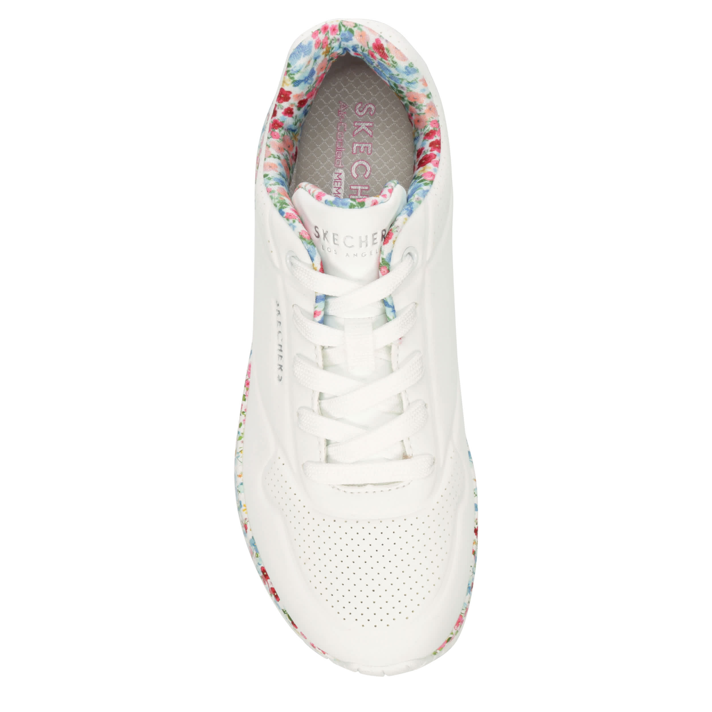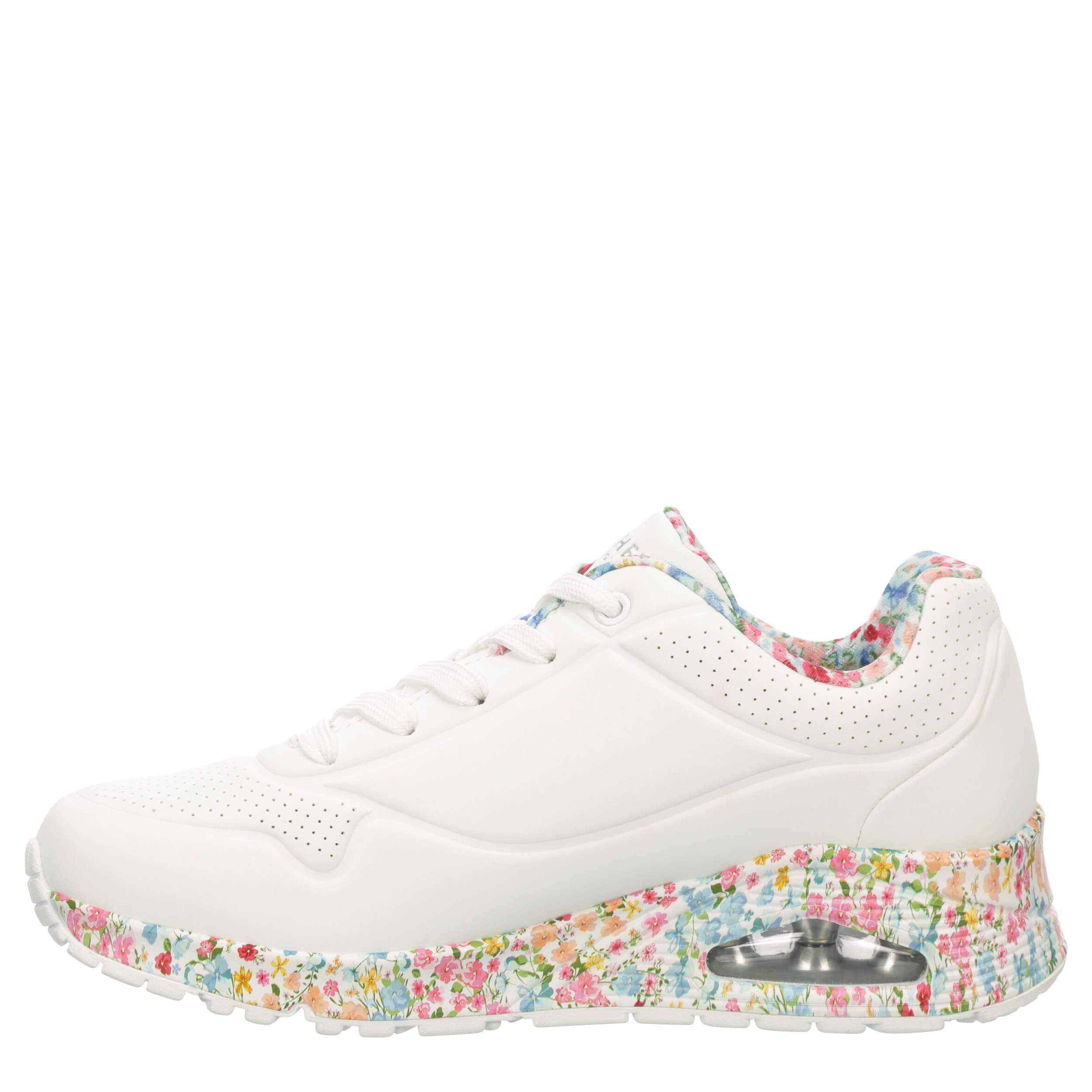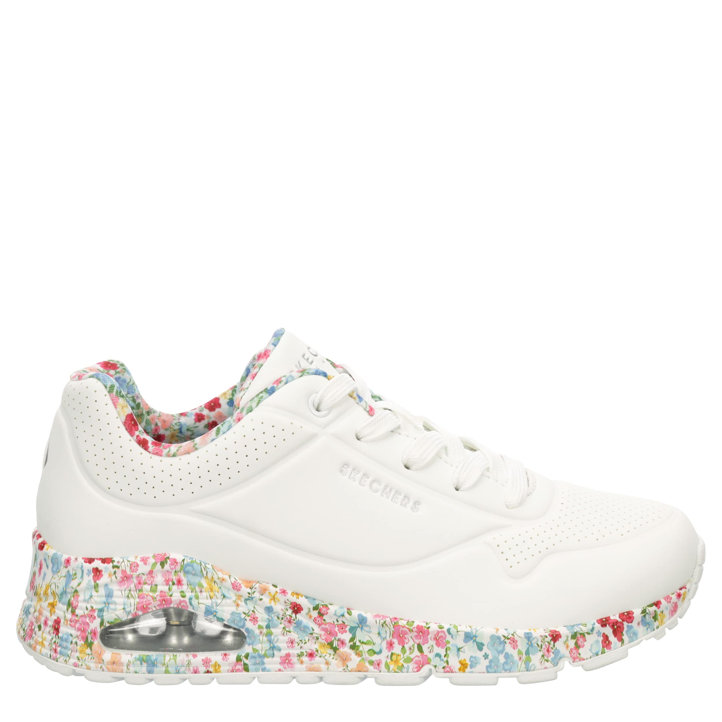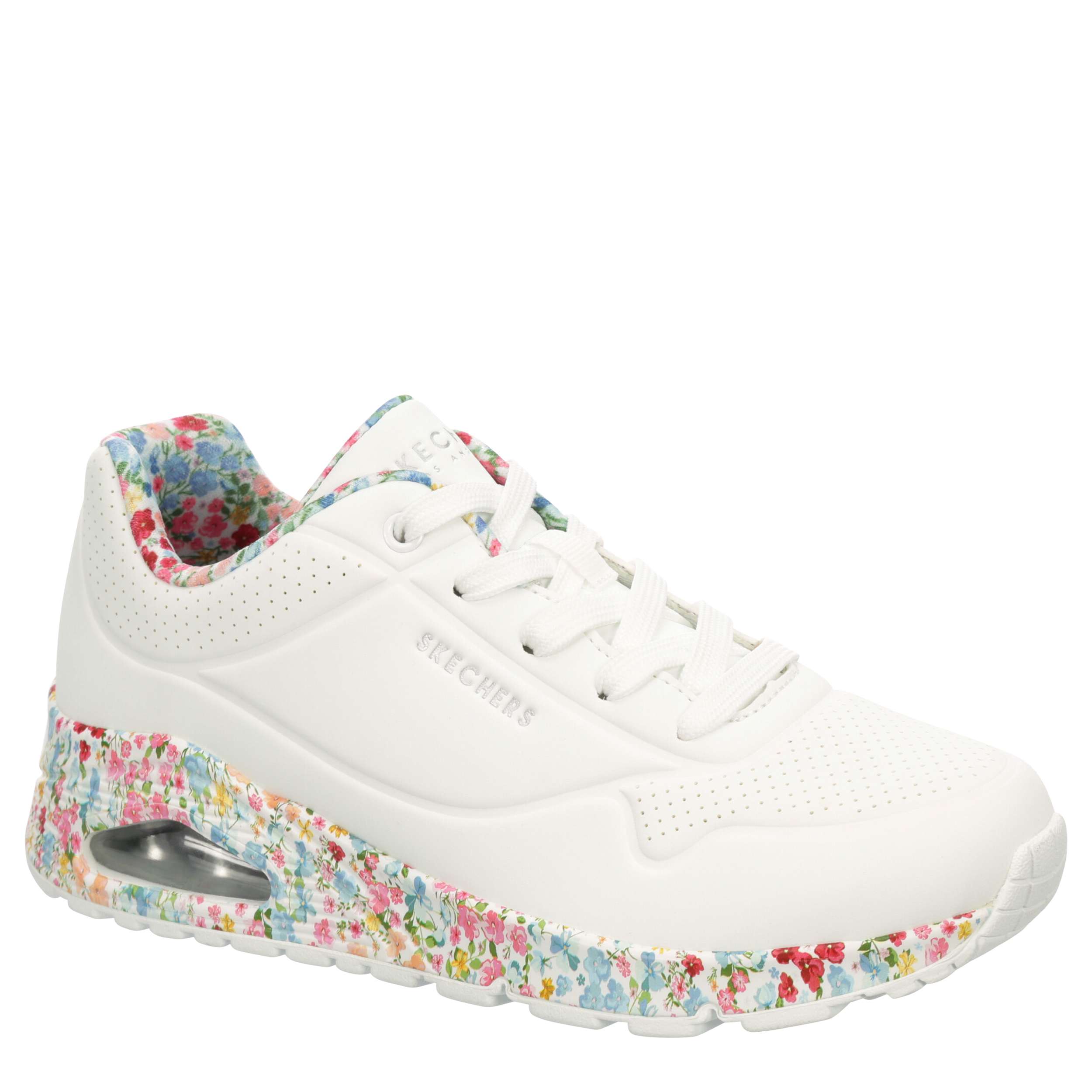 Enhance your style with nature in the Skechers Street™ Uno - Majestic Garden sneaker. With a durabuck upper featuring floral print trim, this lace-up sneaker blends fashion with art. The Skechers Air-Cooled Memory Foam® insole and Skech-Air® visible air-cushioned midsole comfort your foot, while the outsole provides flexible traction.
