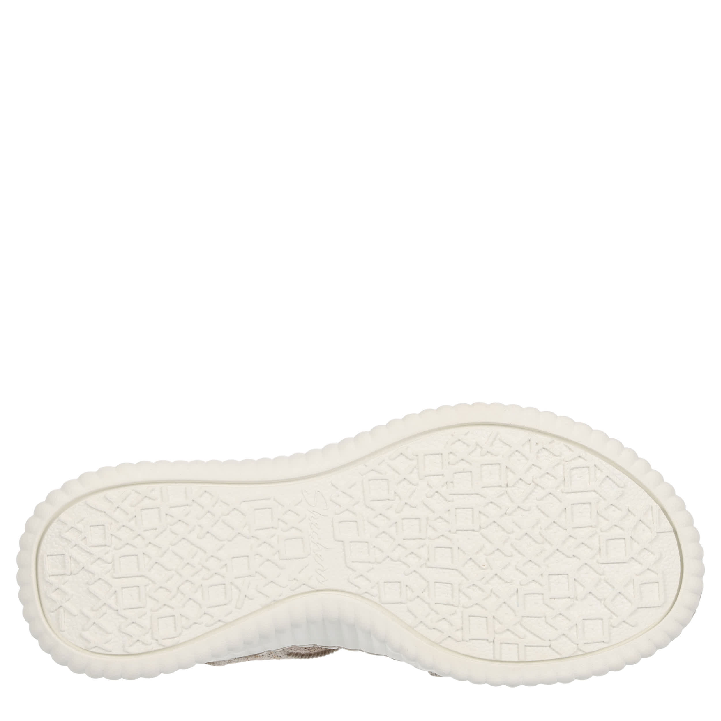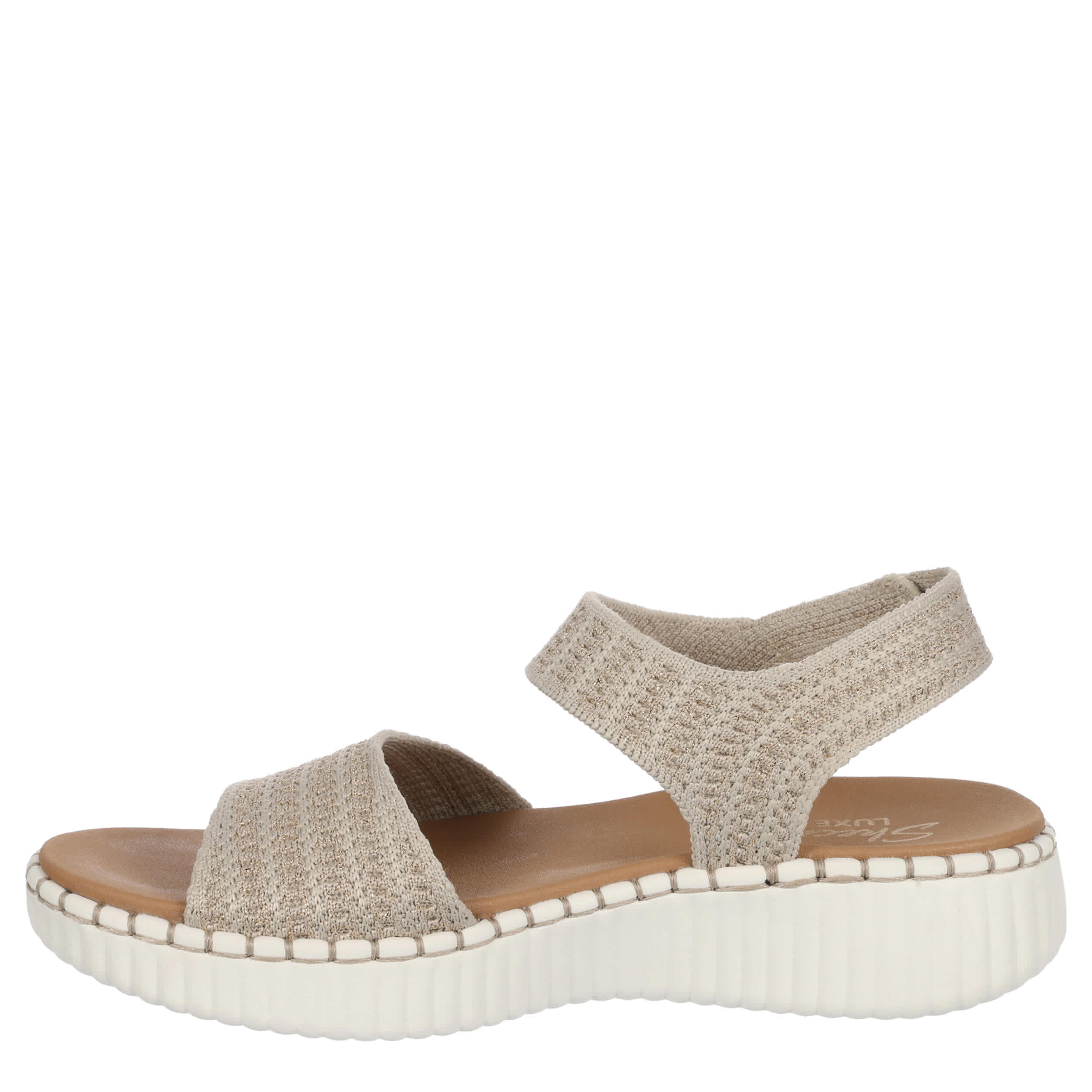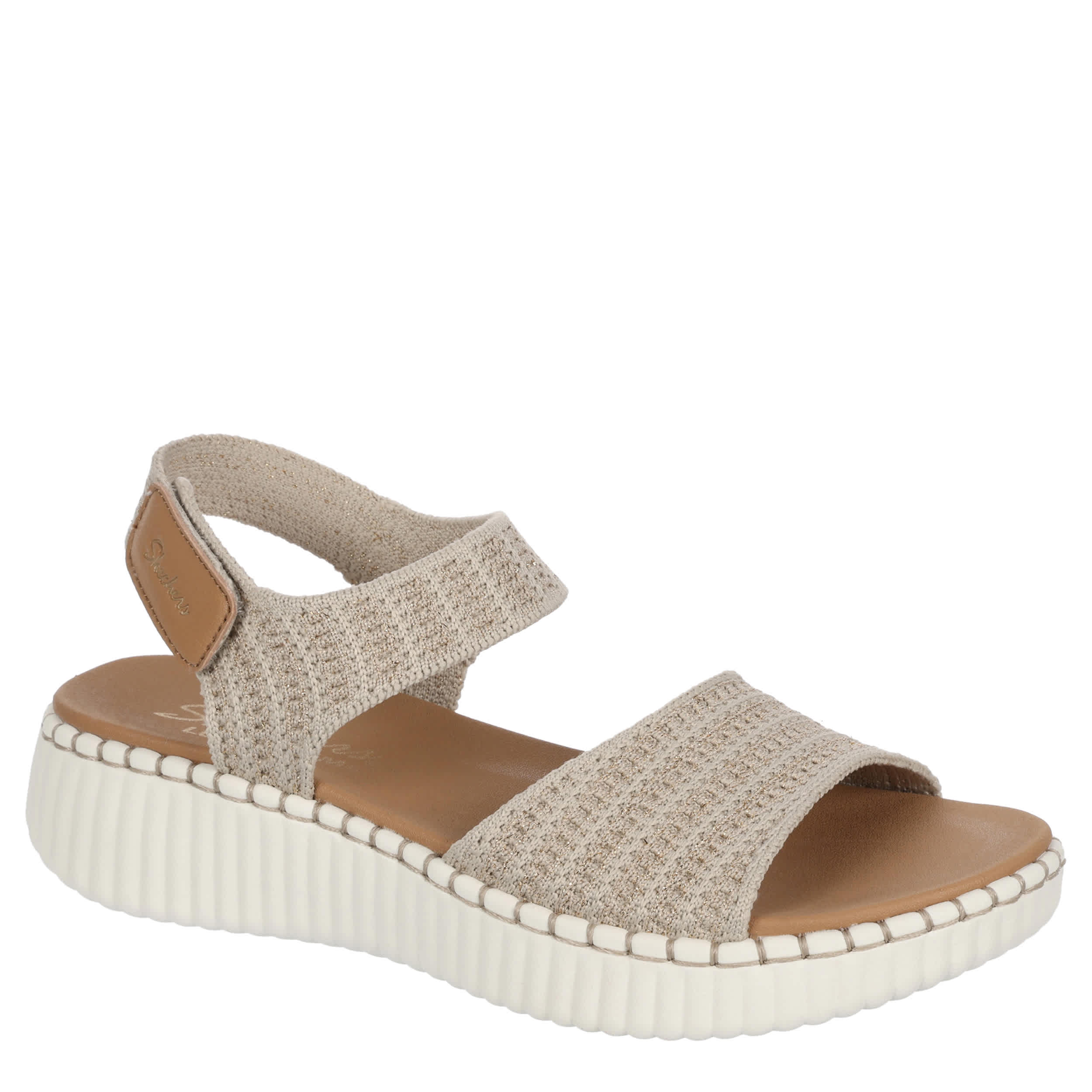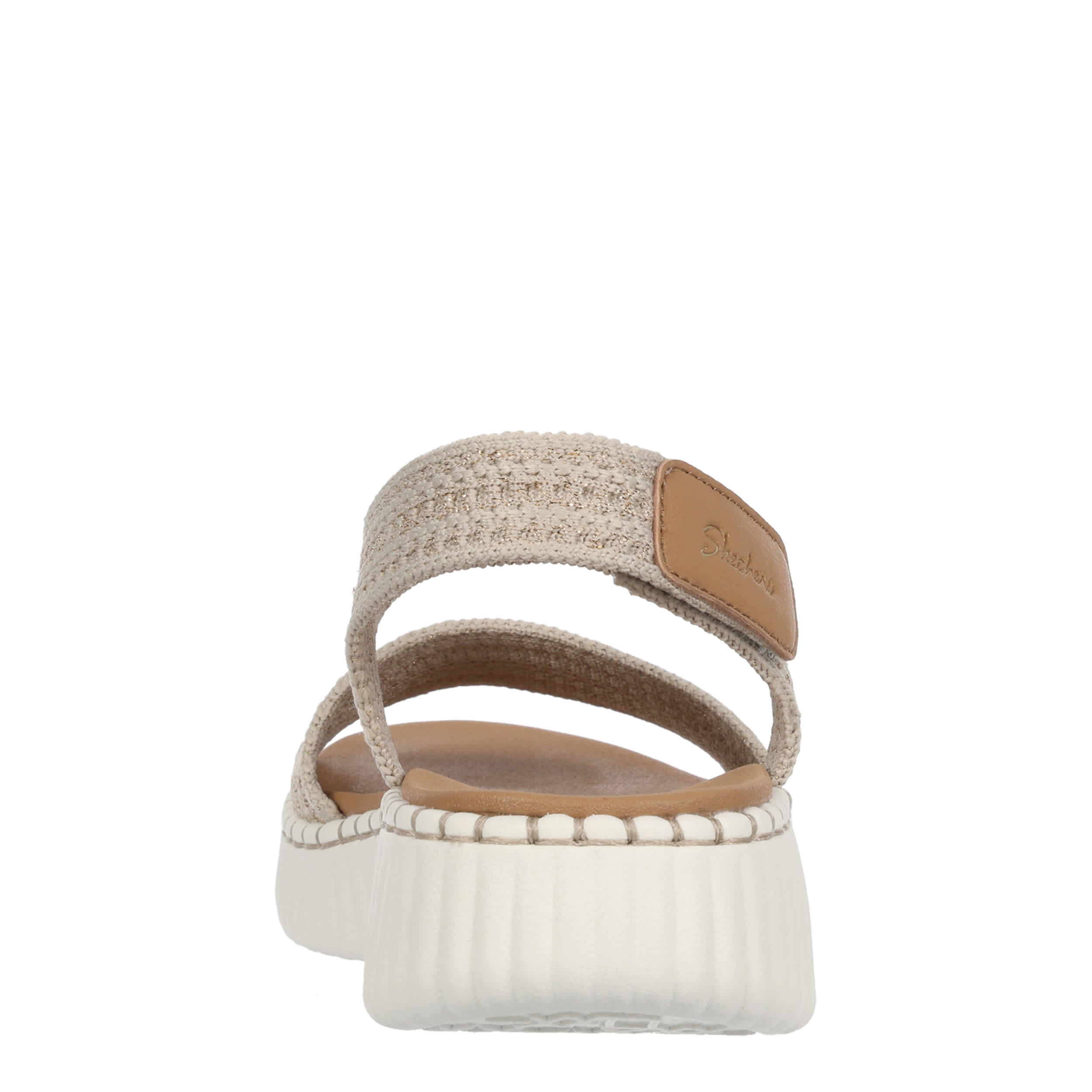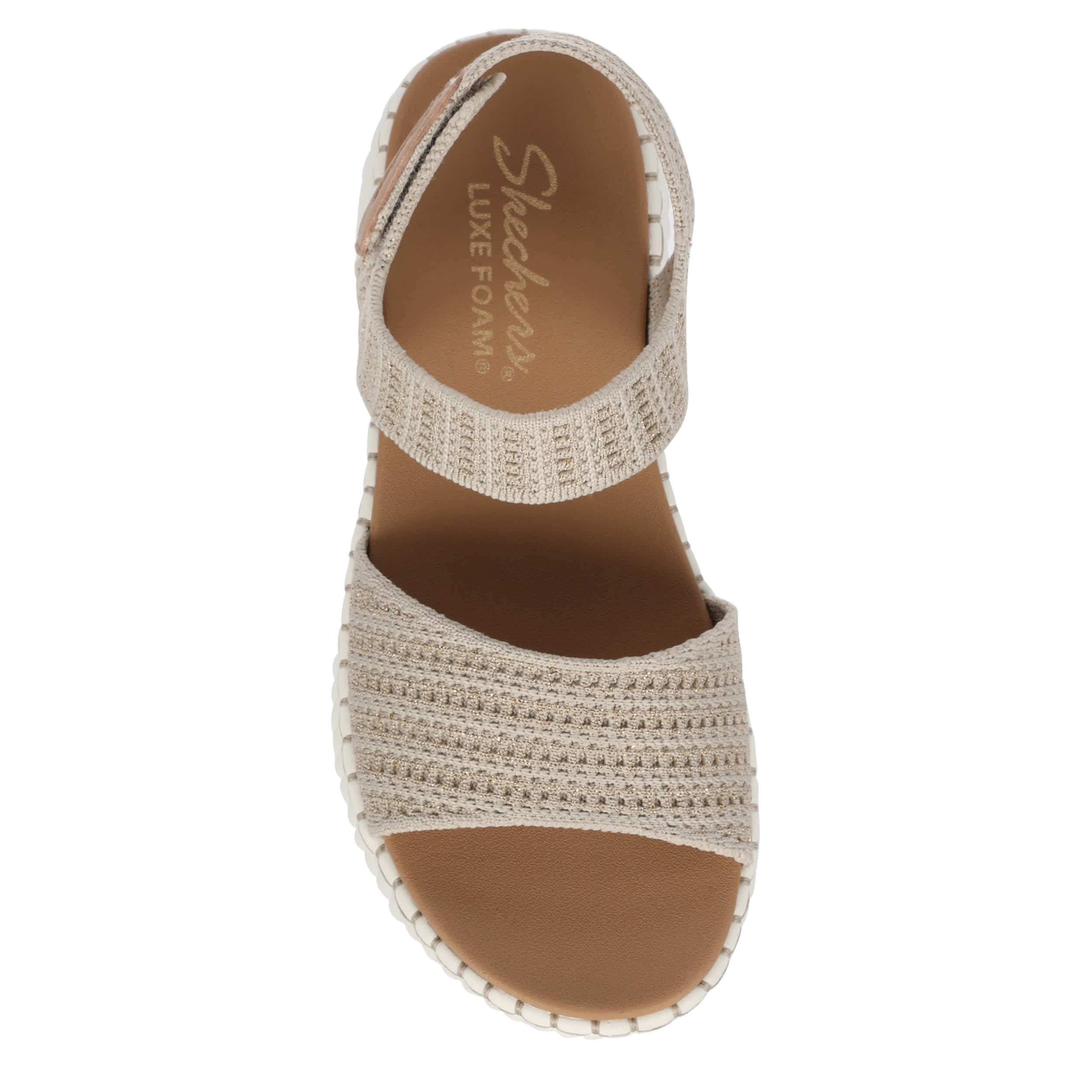 Sunny style inspires the Wilshire Blvd - Summertime Inspo women's sandal from Skechers. With a striped metallic knit upper featuring a fluted midsole with a jute trim, this vegan slingback is machine washable for easy maintenance. The Skechers Luxe Foam® cushions every step while the low heel adds just enough lift.