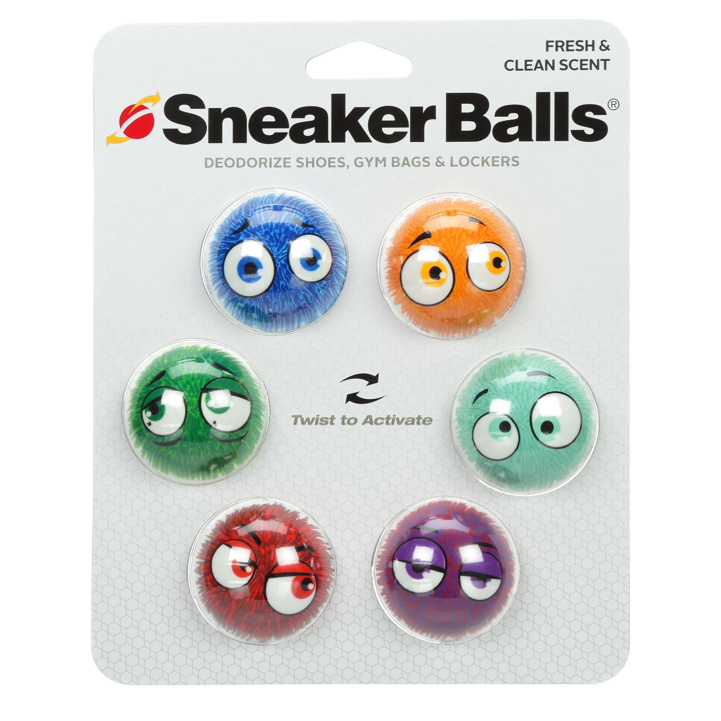 Fight smelly odors with the Sof Sole Monster Faces Sneaker Balls unisex 6 Pack. These compact shoe deodorizers can freshen up shoes, gym bags, lockers, and closets. Activate with a simple twist and enjoy the fresh and clean scent for over 2000 hours.