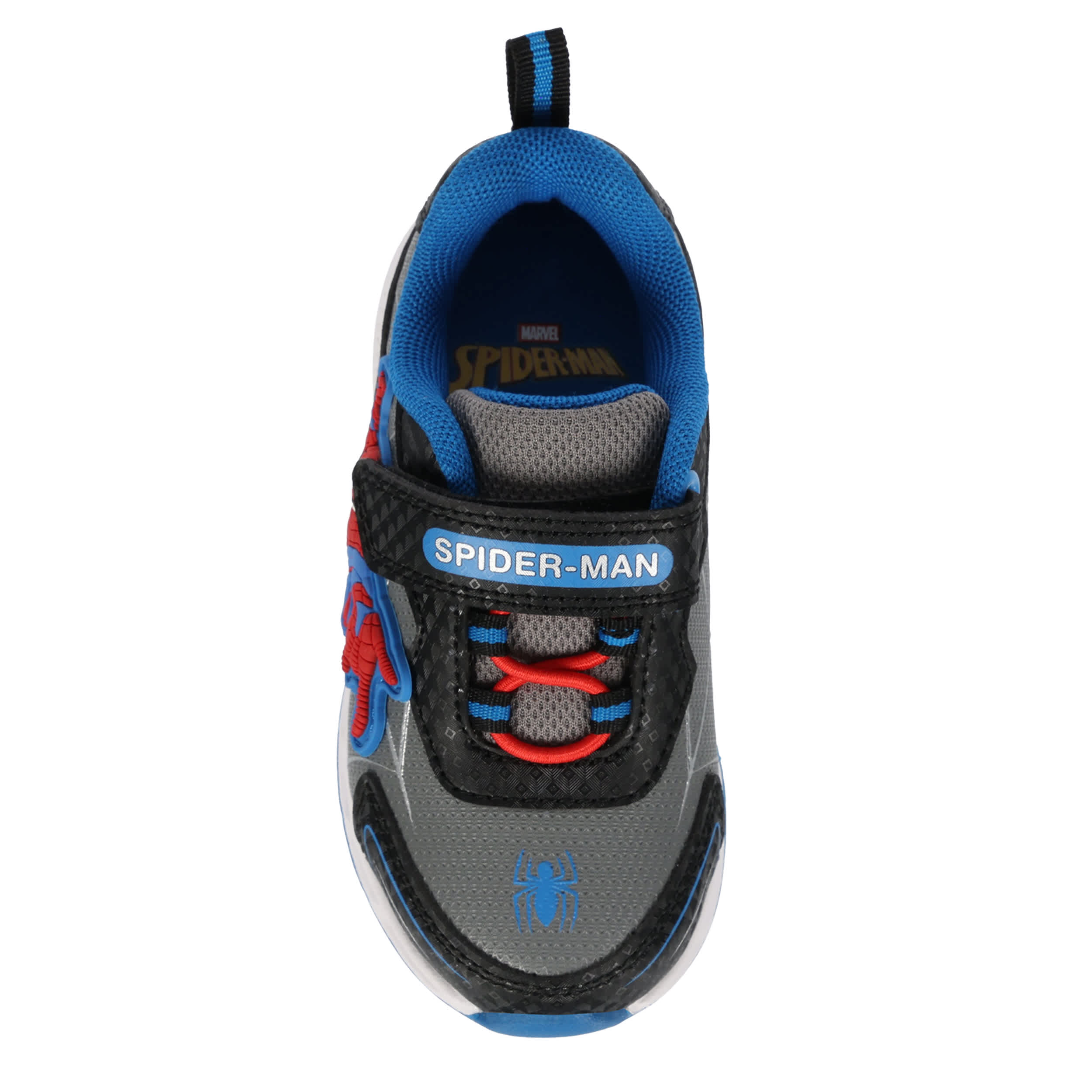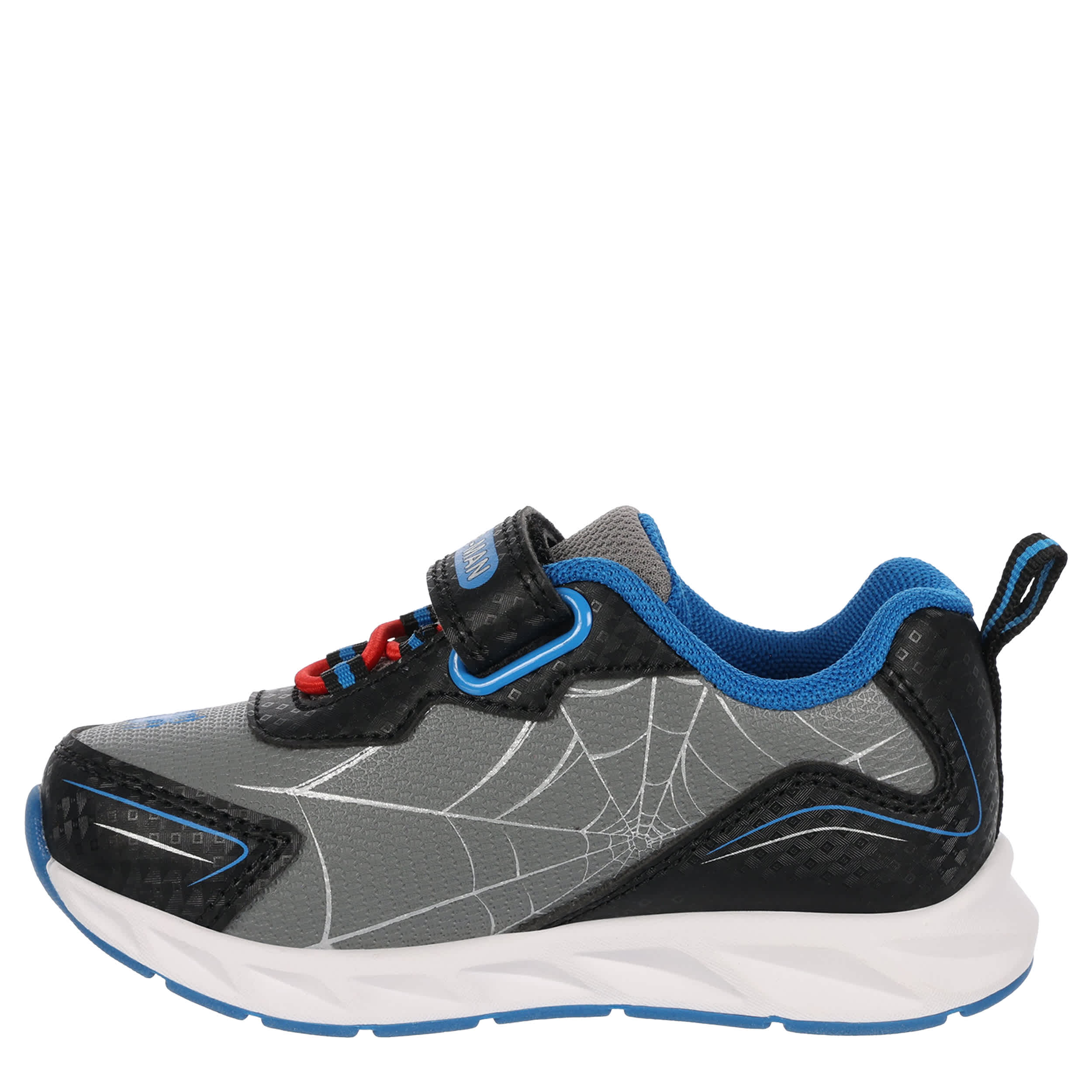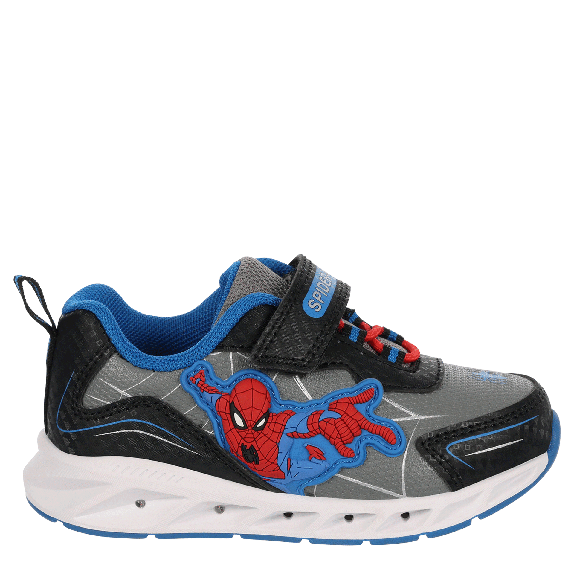 Join Spidey scaling walls with the Spider-Man infant boys' light up sneaker. Featuring a web-accented upper with a secure ankle strap, this sneaker also has a side Spider-Man graphic as well as sole lights for a cute finish. The insole cushions his foot, while the traction outsole provides a durable grip.