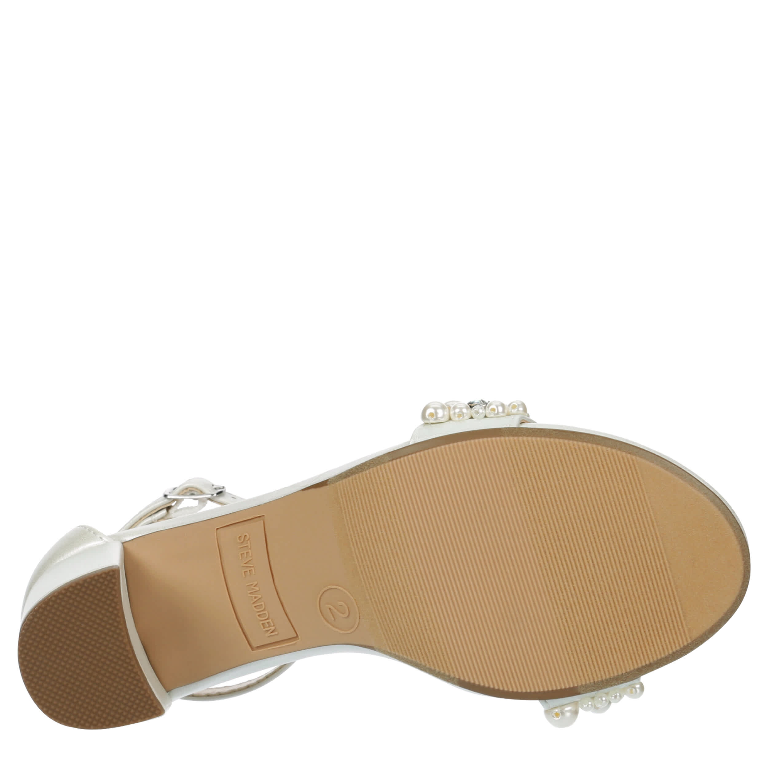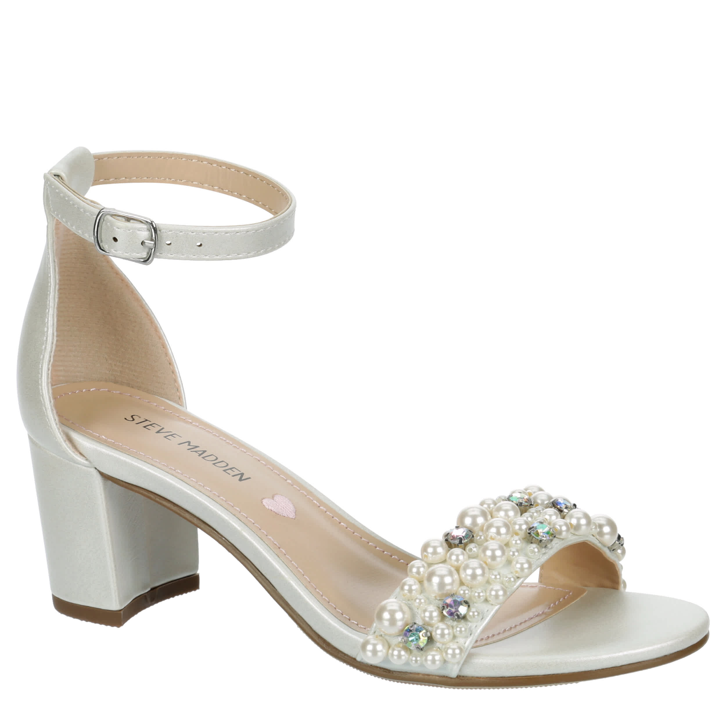 Get ready for next sandal season with the Jcarrson girls' dress shoe from Steve Madden. Featuring a faux leather upper with faux pearls along the vamp, this ankle buckle strap heel is great for a special event. The stretch lining soothes her foot while she balances on the sturdy 2½" block heel.