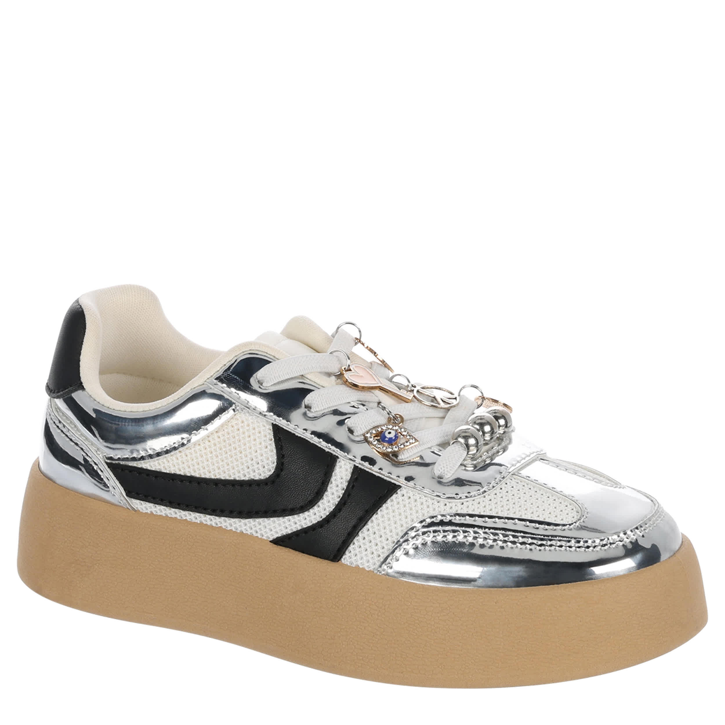Trendy and sleek, the Steve Madden JJerseyC girls' sneaker brings the charm. With a vegan leather upper featuring metallic accents and lace charms, this platfom shoe is still functional under all that style. A soothing lining and durable sole equal plenty of room for fun.