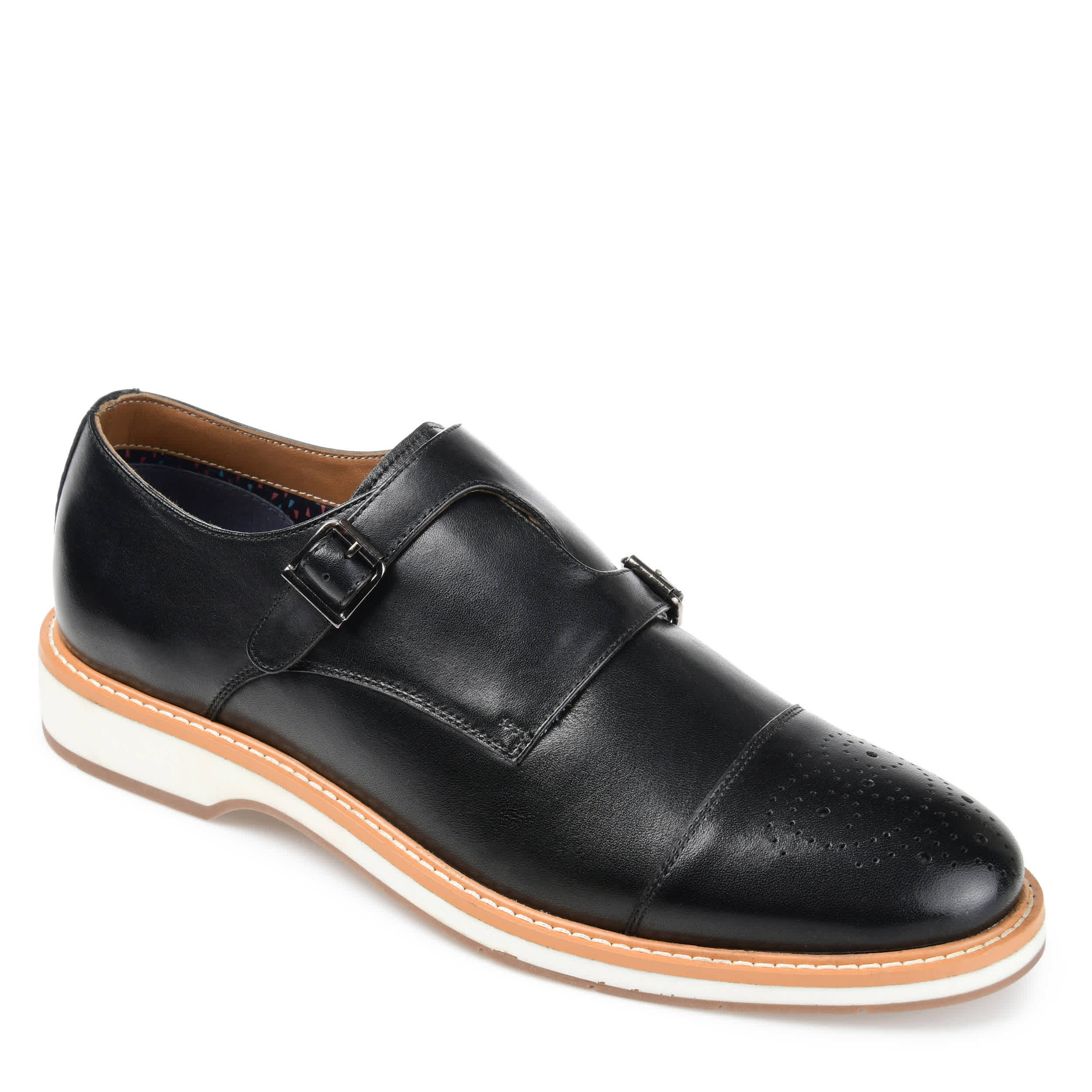 No one can deny you have impeccable taste when you step out in the Ransom men's dress shoe from Thomas & Vine. The interlocking buckle strap, medallion toe and contrasting white sole serve as statement pieces, complementing suits, dress pants, sport coats and more. The genuine leather upper shapes the look and the Tru Comfort Foamâ„¢ footbed offer the perfect amount of support.