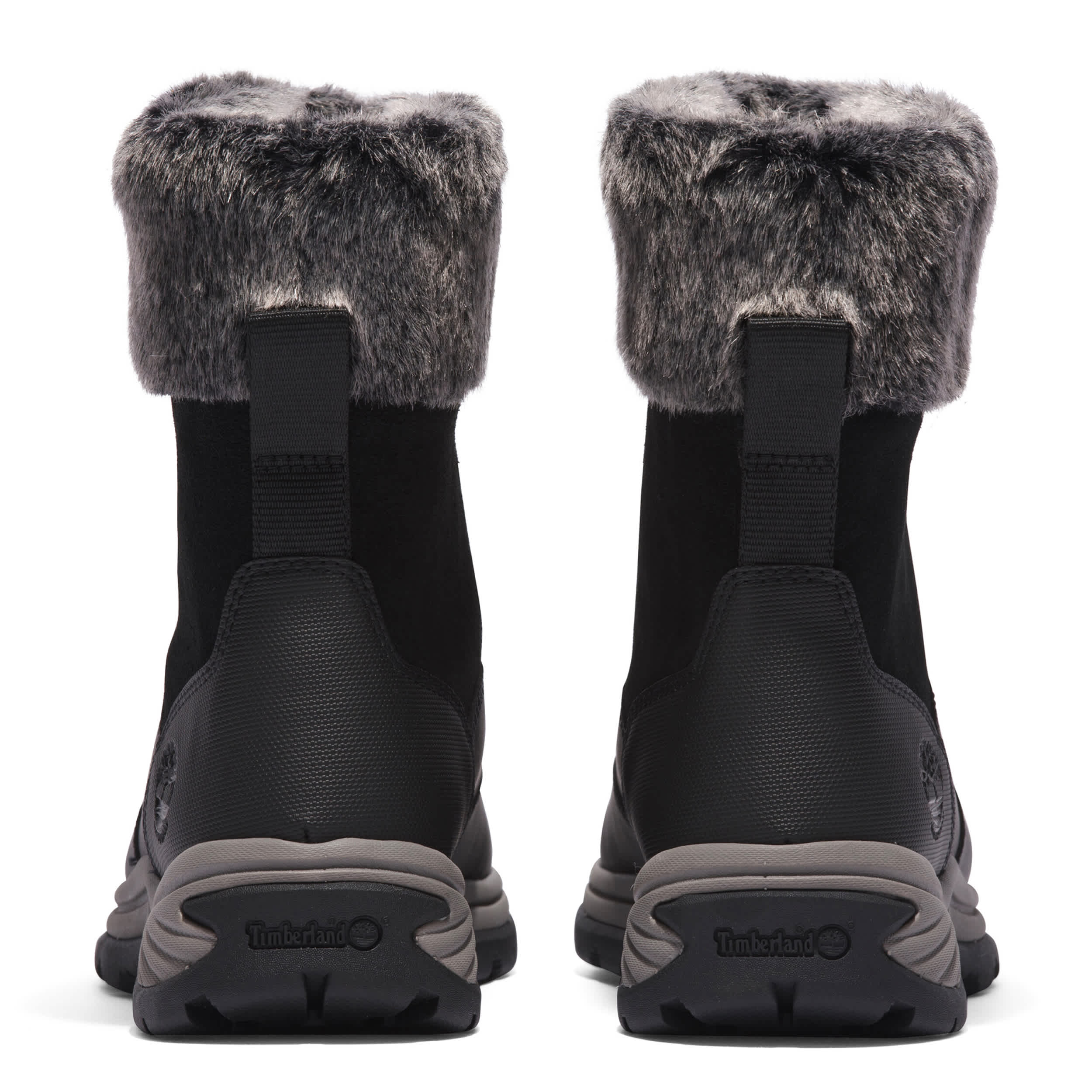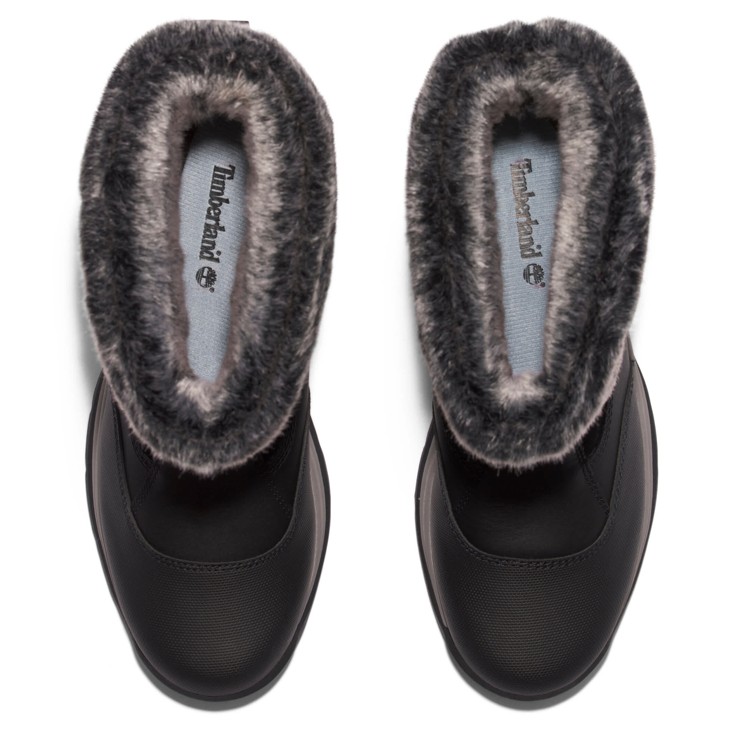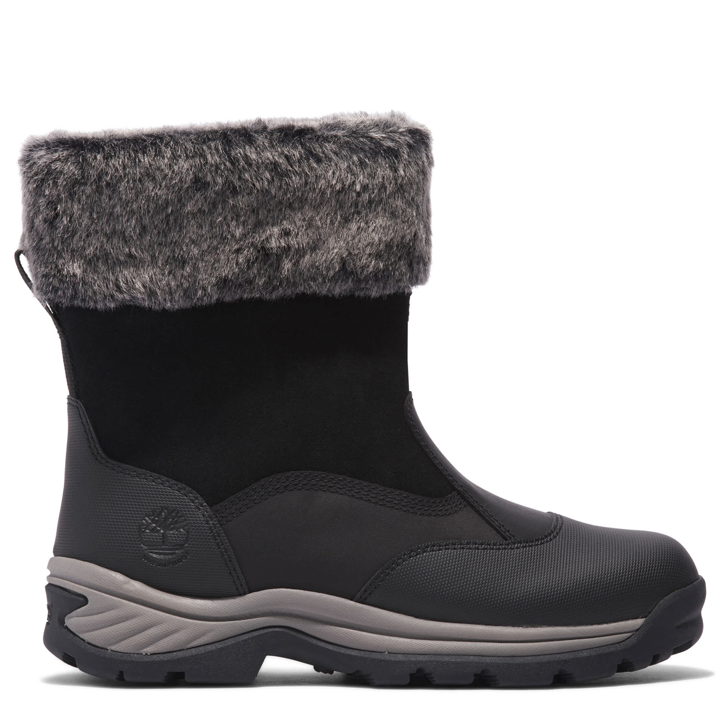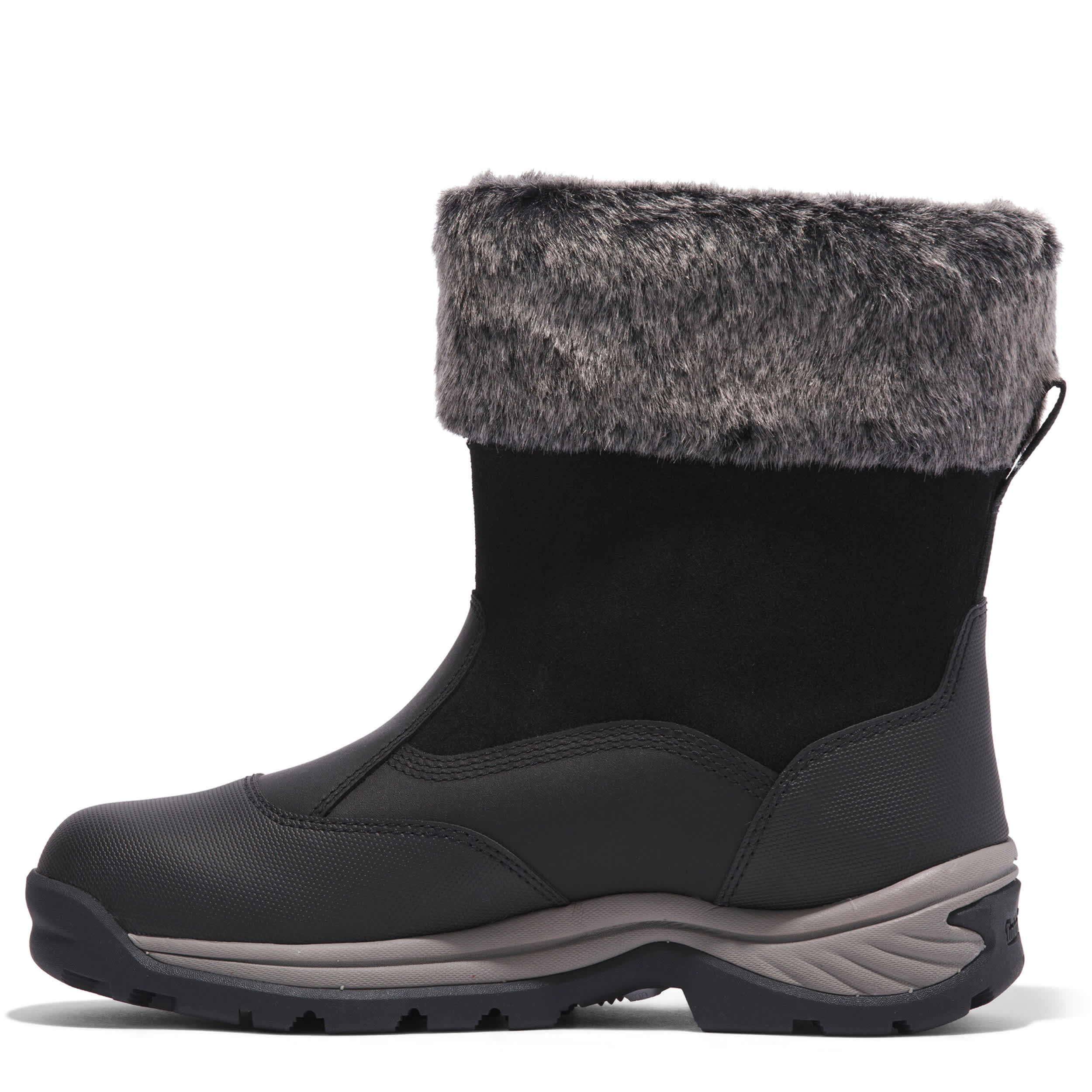 Go beyond the style of a basic rain boot in the Timberland White Ledge Pull On WP women's boot. With a leather upper featuring faux fur collar for extra warm style, this calf-length boot has a recycled ReBOTL fabric lining and lightweight insulation. The OrthoLite footbed offers lightweight cushioning while the lug outsole has traction to power through inclement weather.
