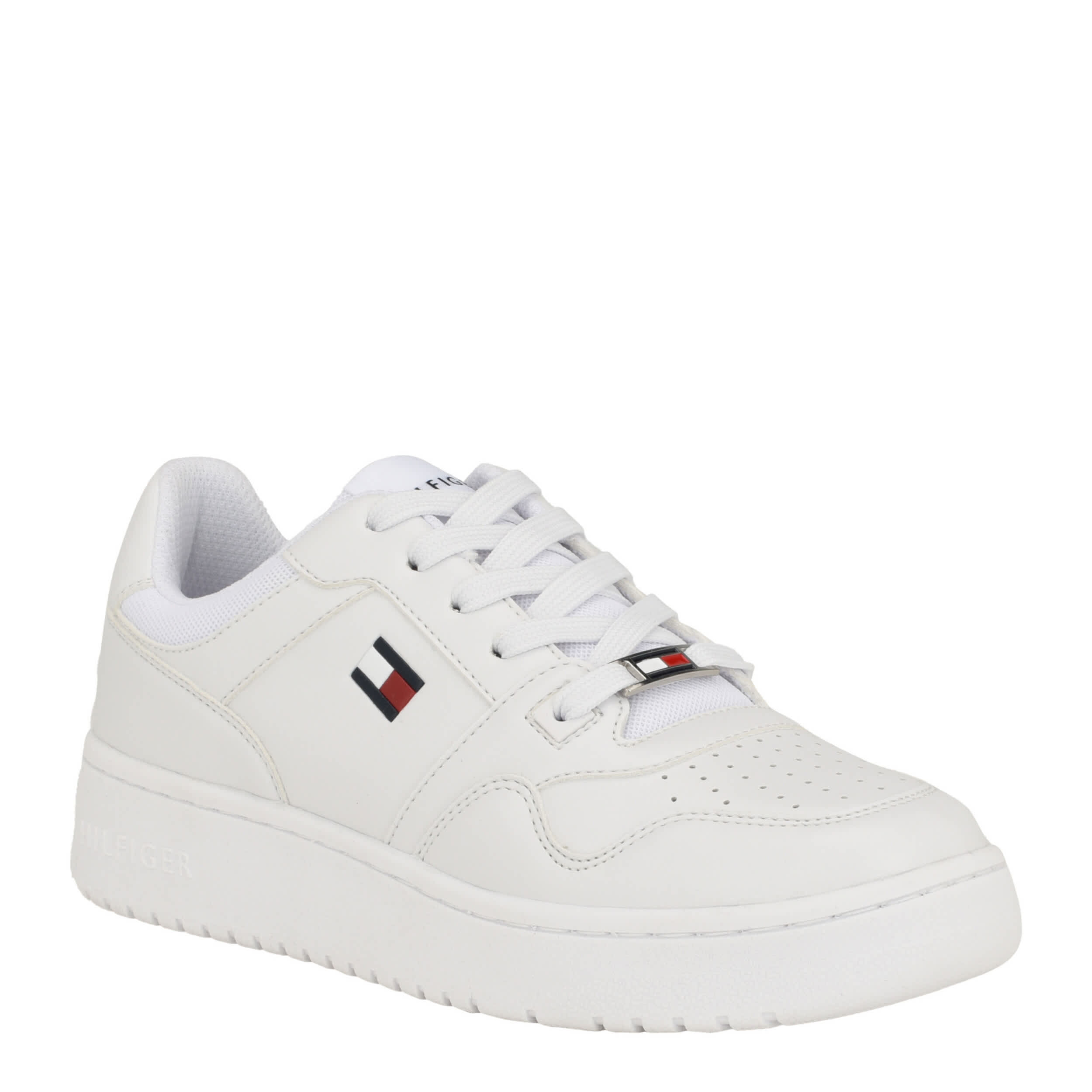 Retro athletic styling with classic Hilfiger elements - the Twigye women's sneaker. Featuring a faux leather upper with a perforated toe and padded collar for comfort, this chic lace-up is clean in all-white. The textile lining soothes your foot, while the durable outsole adds traction.
