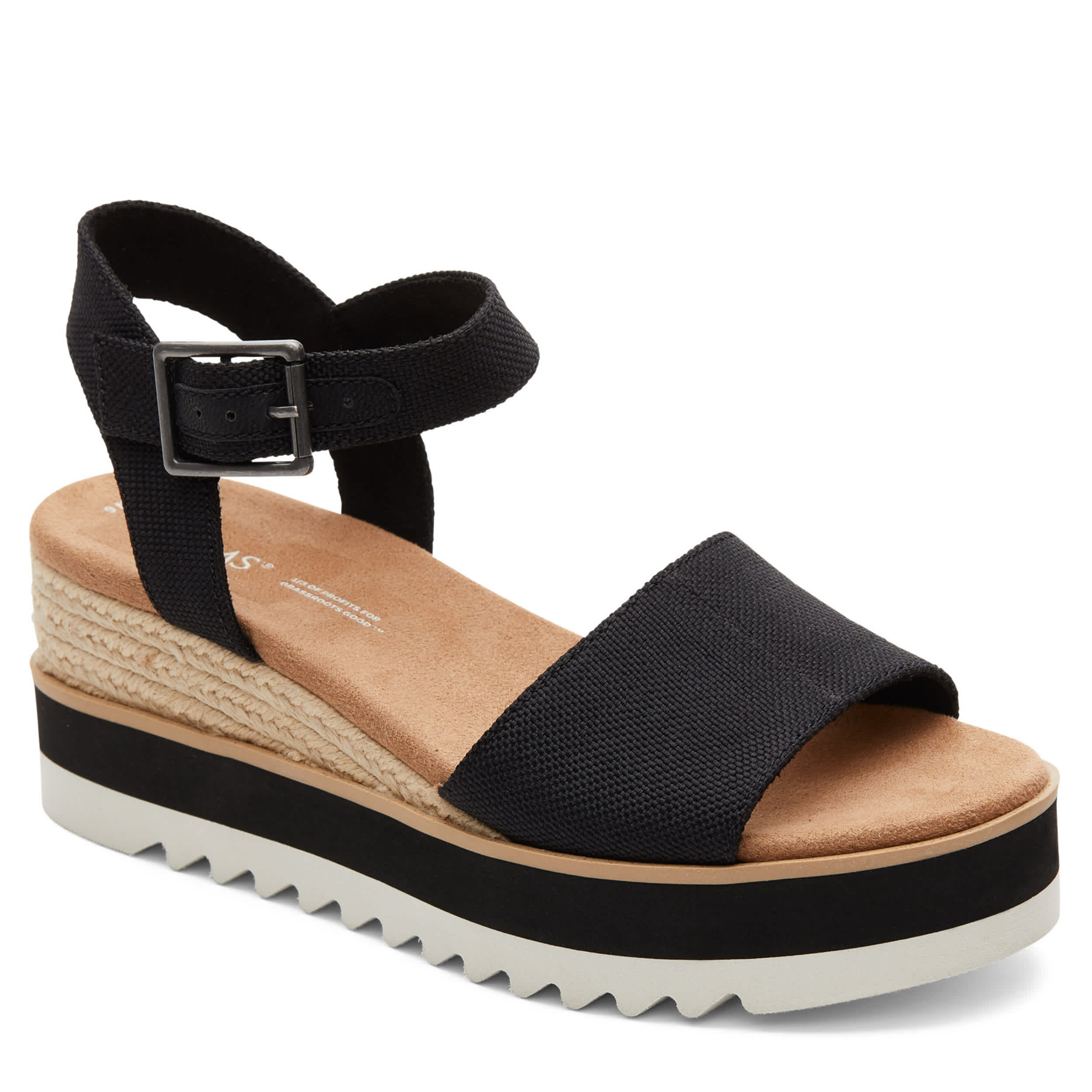 Lift your comfort, stylishly, in the TOMS Diana women's wedge sandal. With a canvas upper featuring a rope wrap espadrille-inspired wedge midsole for extra flair, this ankle buckle strap sandal works day or night. The OrthoLite Eco X40 Hybrid insole, made from recycled materials, offers high-rebound cushioning, while the platform EVA outsole offers stable height with sawtooth traction.