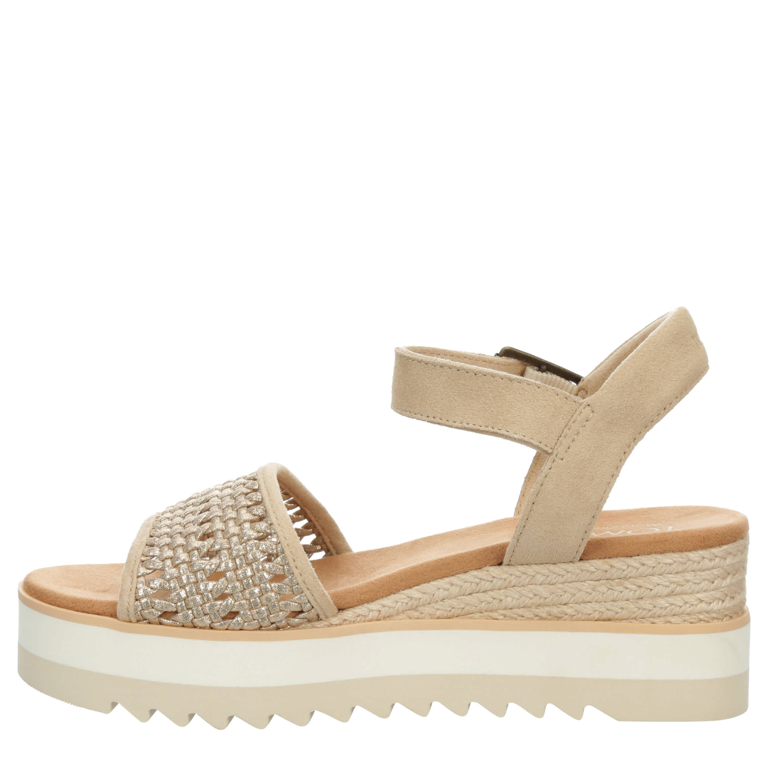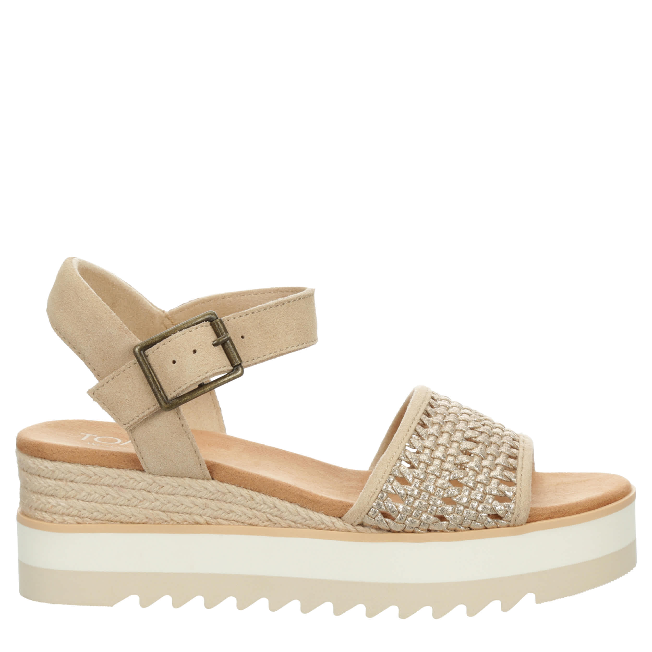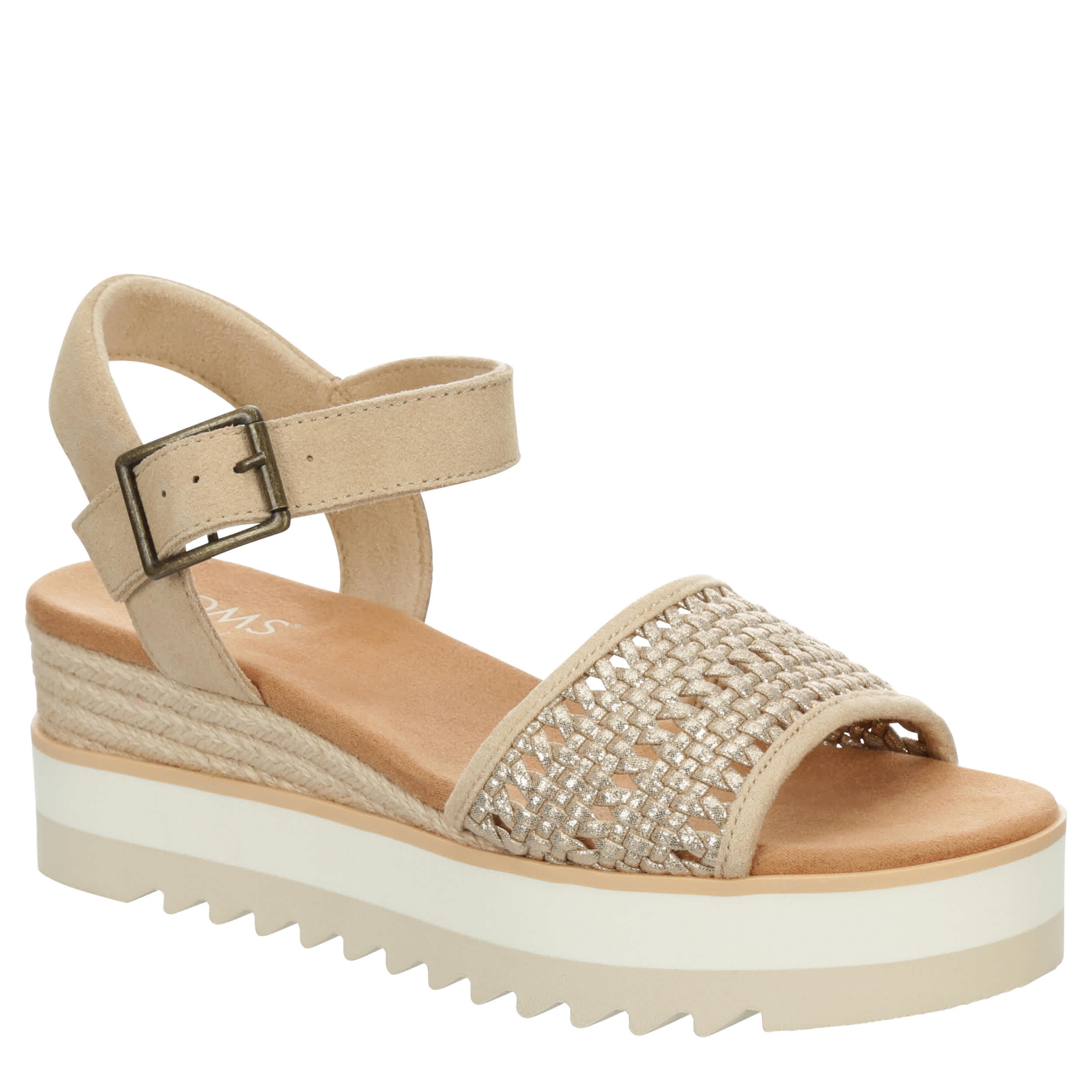 Lift your comfort, stylishly, in the TOMS Diana women's wedge sandal. With a basket weave upper featuring a rope wrap espadrille-inspired wedge midsole for extra flair, this ankle buckle strap sandal works day or night. The OrthoLite Eco X40 Hybrid insole, made from recycled materials, offers high-rebound cushioning, while the platform EVA outsole offers stable height with sawtooth traction.