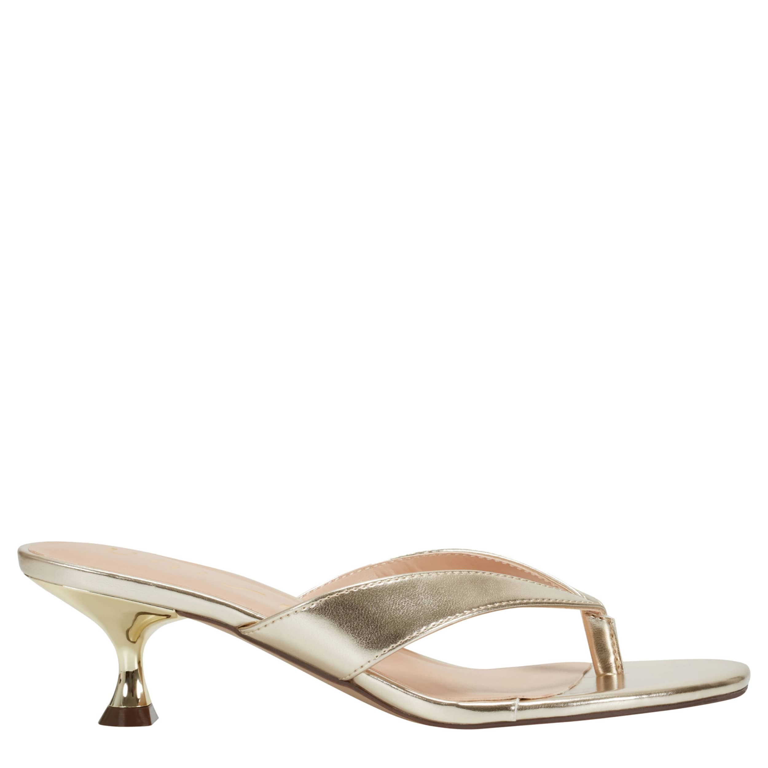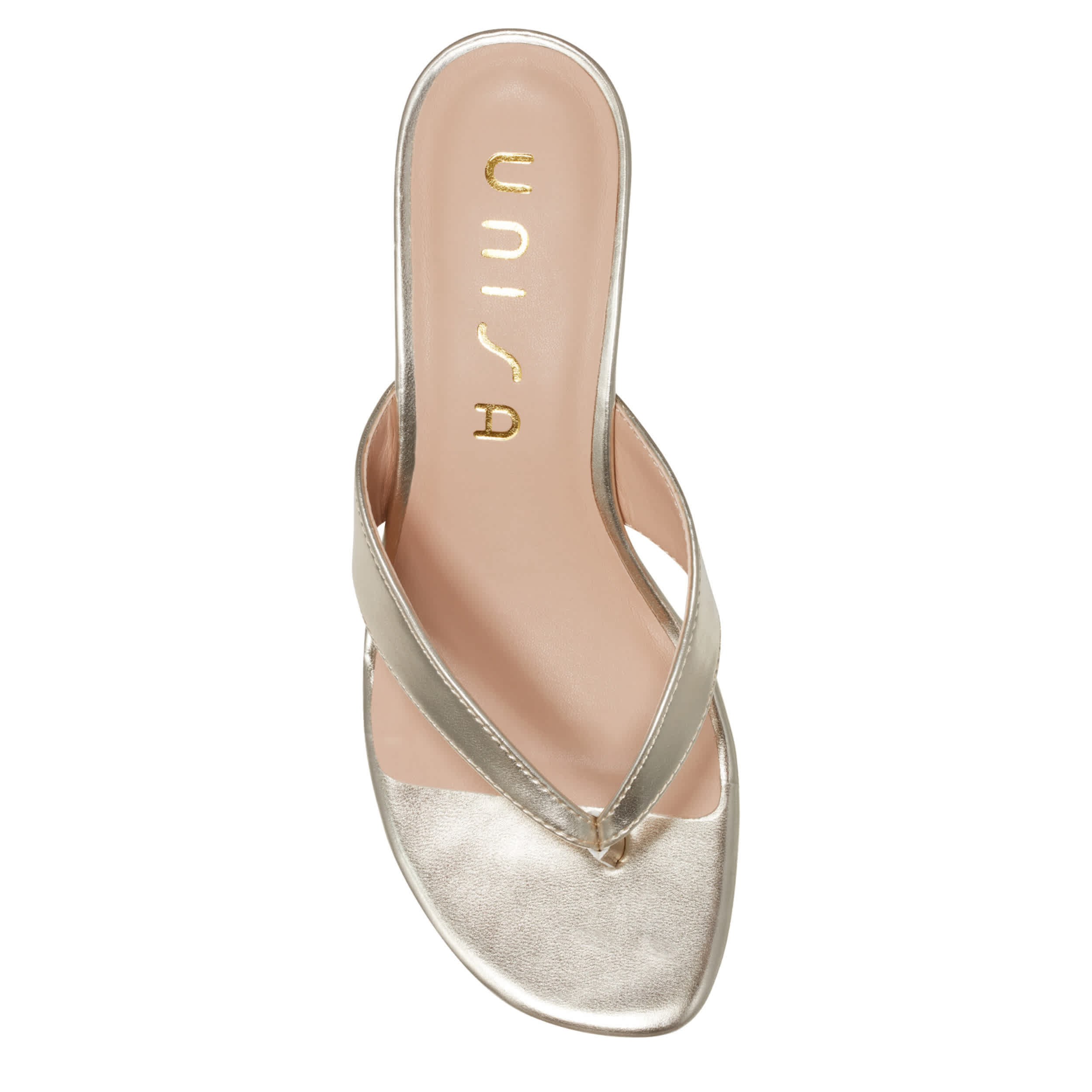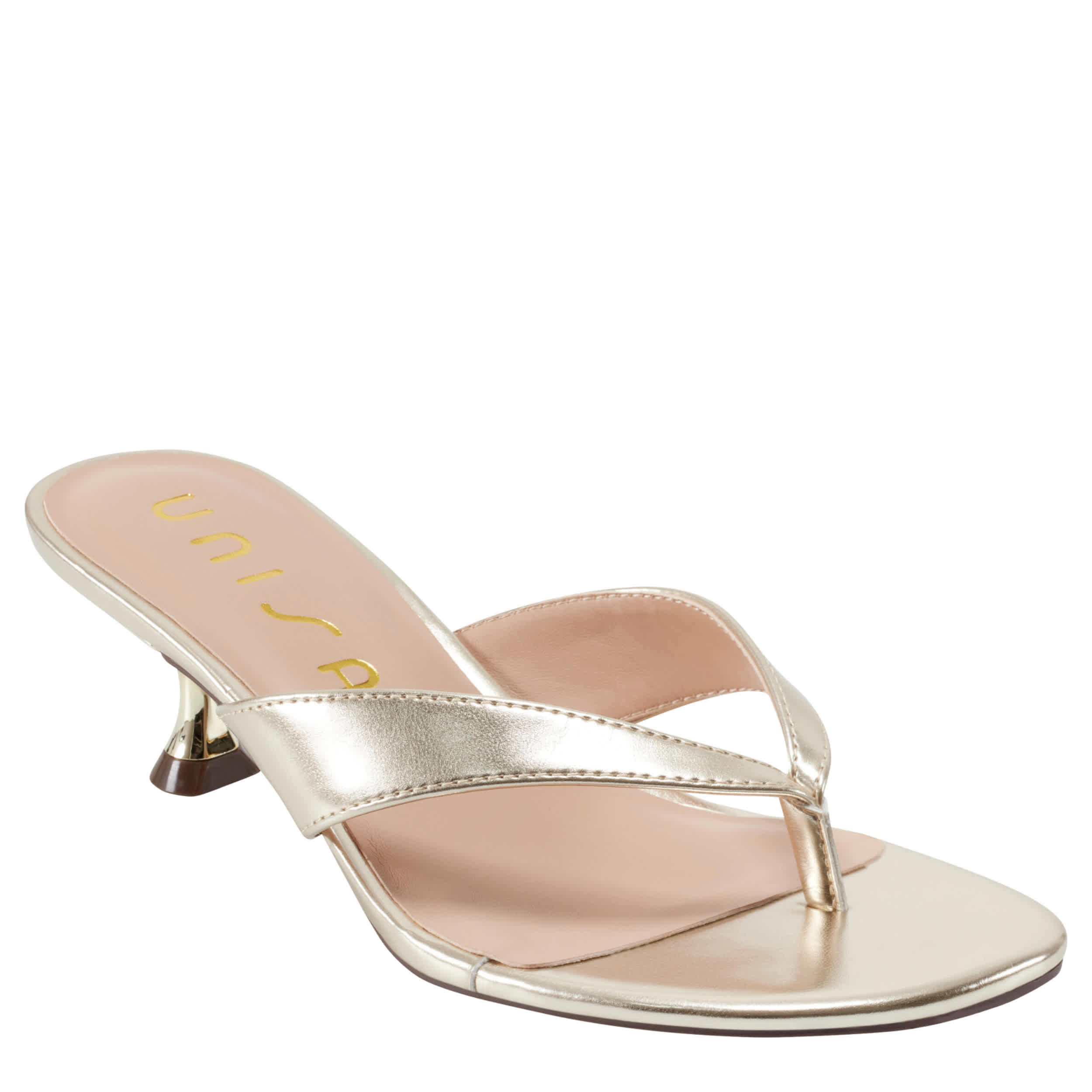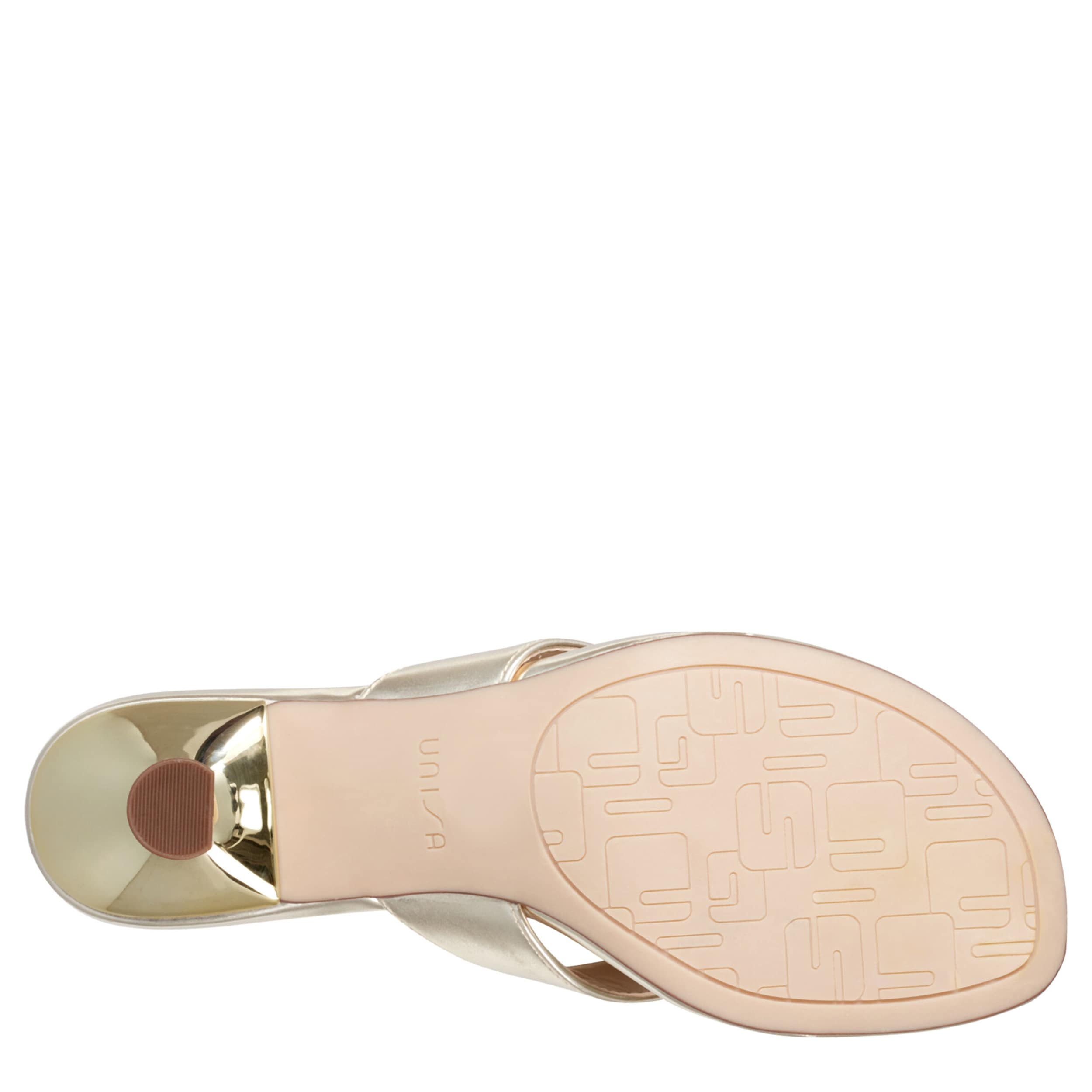 Simple style trends high this summer with the Unisa Aliane sandal. Featuring a metallic faux leather upper, this thong sandal slips on easily for a dressier event. The lightly padded insole soothes your foot, while the kitten heel gives a small, but sturdy lift.