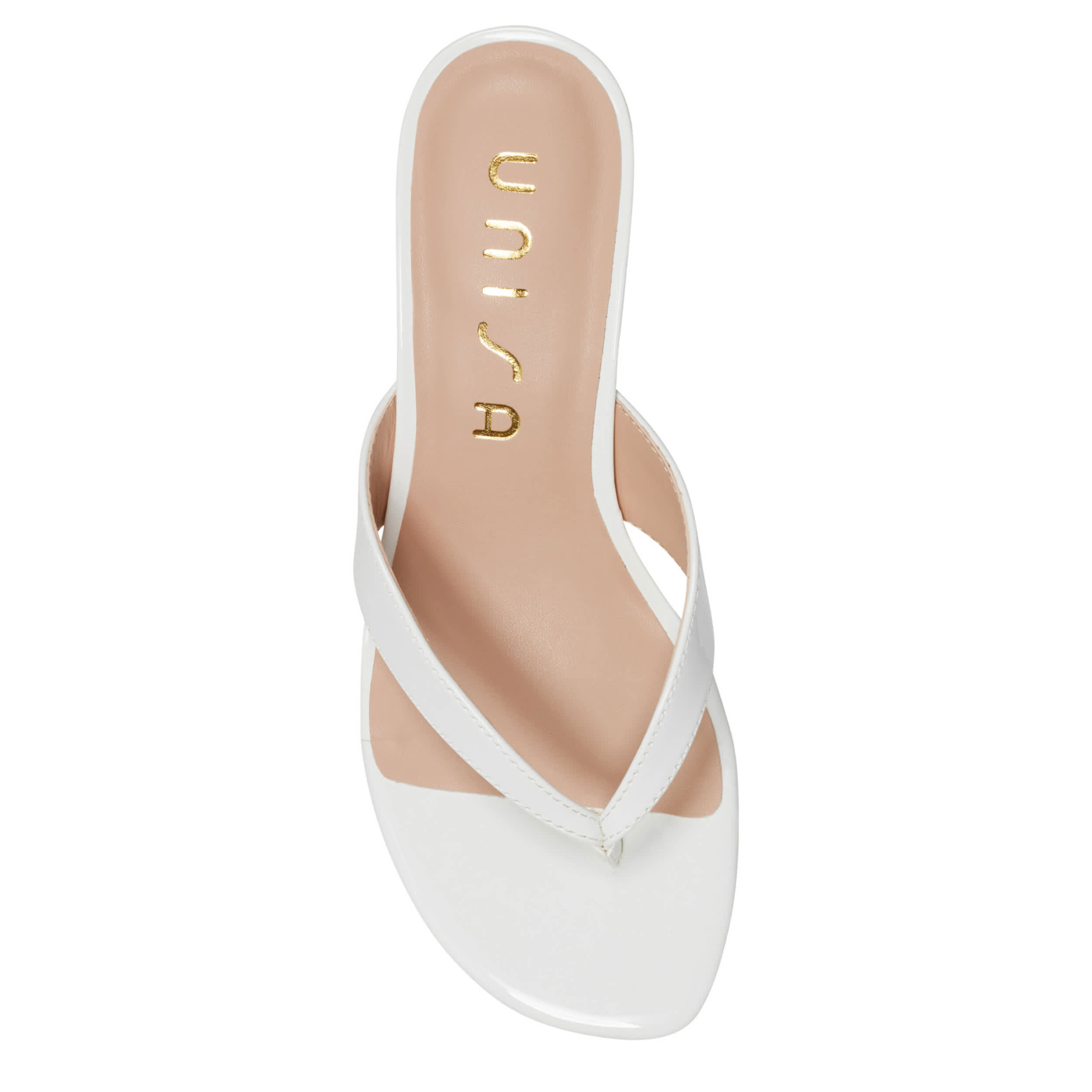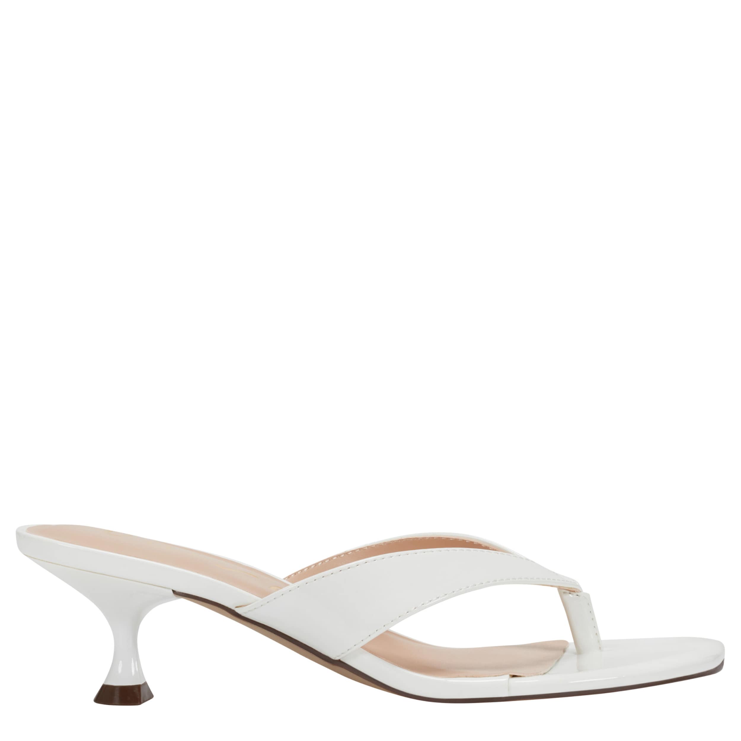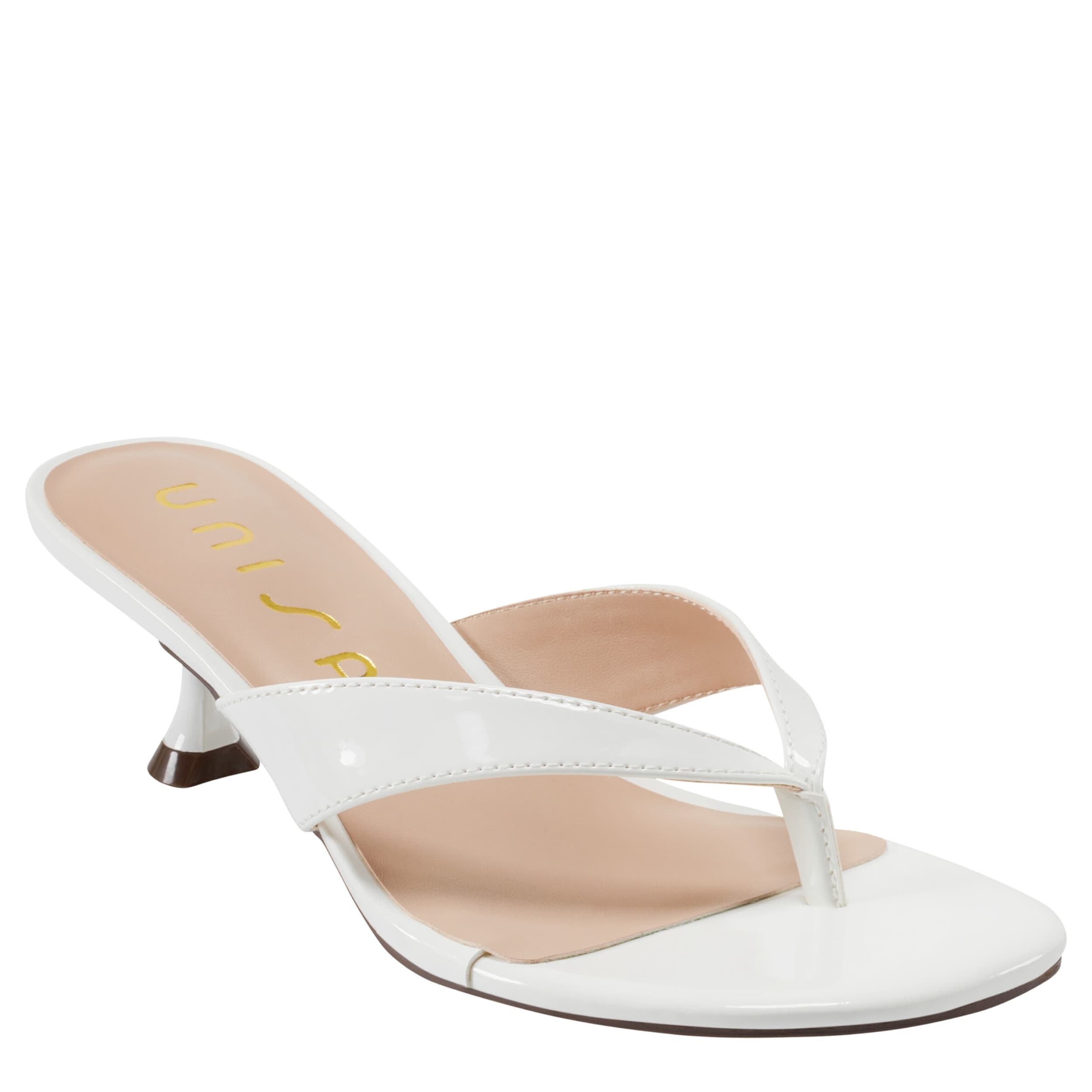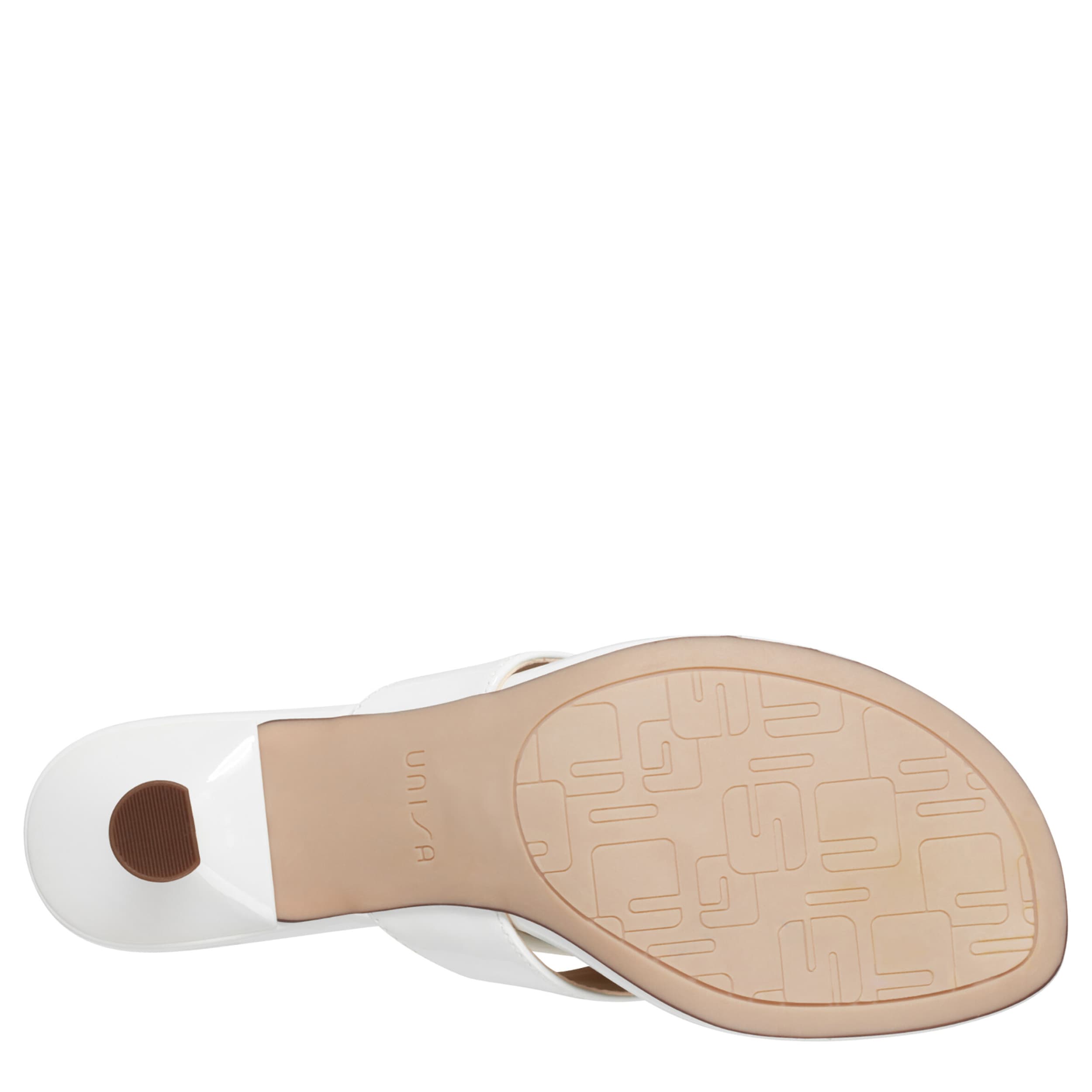 Simple style trends high this summer with the Unisa Aliane sandal. Featuring a glossy patent leather upper, this thong sandal slips on easily for a dressier event. The lightly padded insole soothes your foot, while the kitten heel gives a small, but sturdy lift.