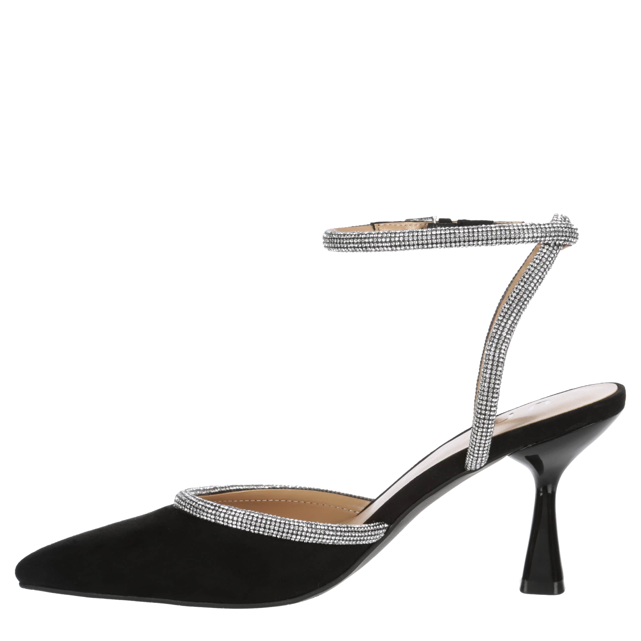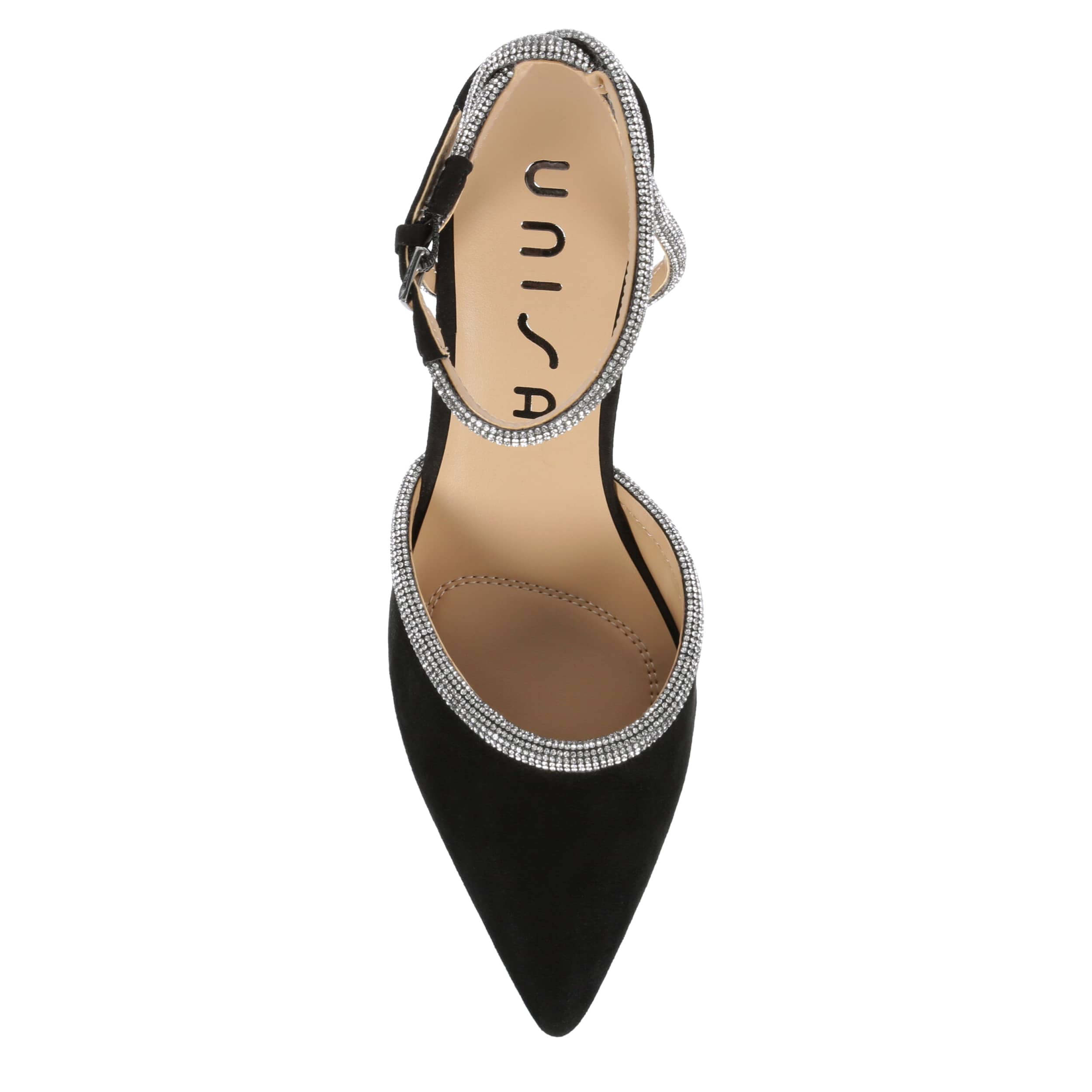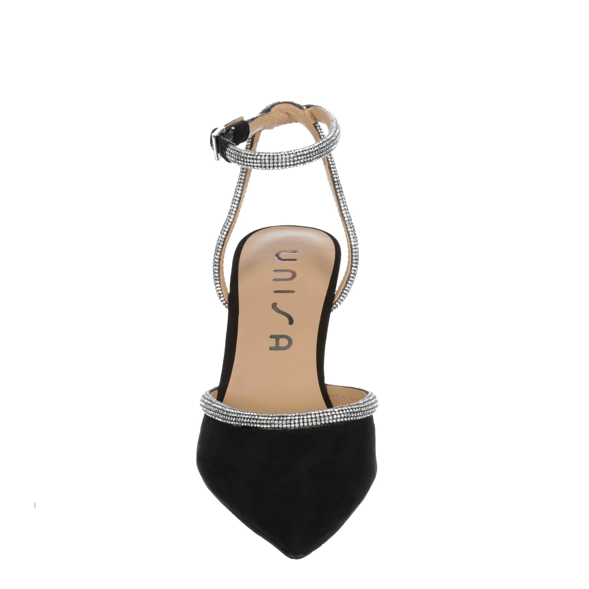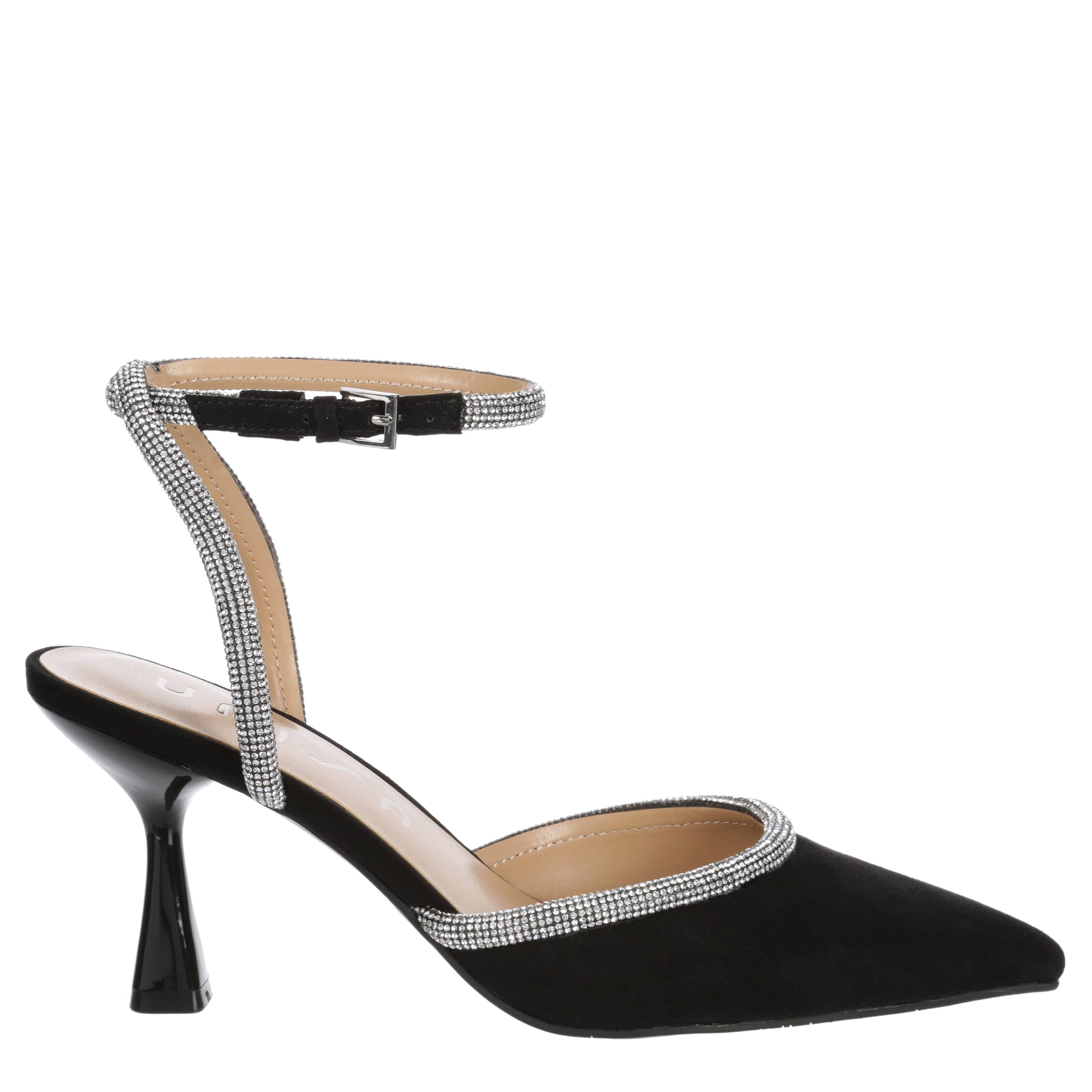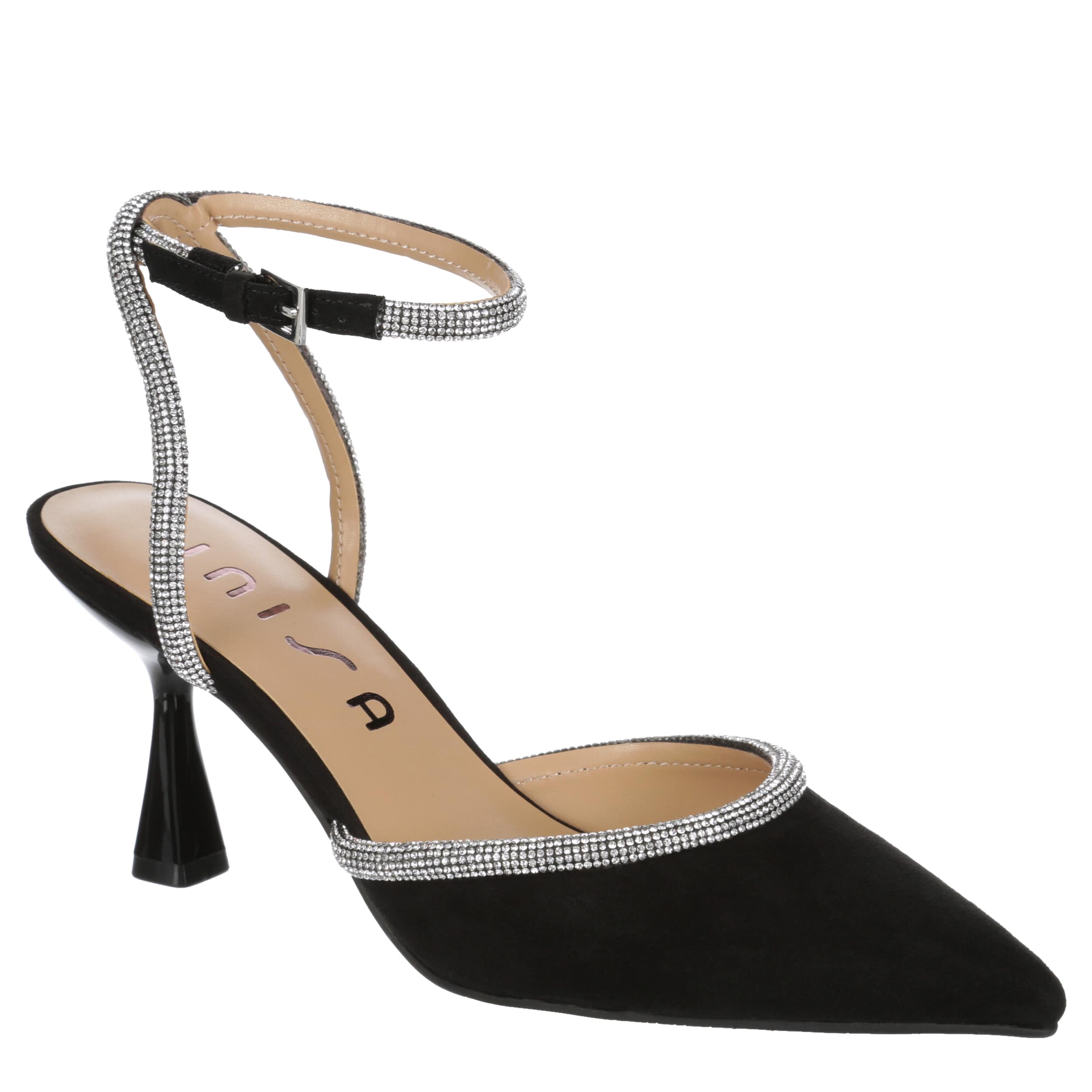 Keep striving and dressing in the Unisa Sebi pump. Featuring a faux suede upper with rhinestone detailing along the vamp and on the halo buckle strap, this shoe has a sleek pointed toe, adding a sophisticated finish to your style. The insole soothes, while the sculpted heel adds just enough lift.