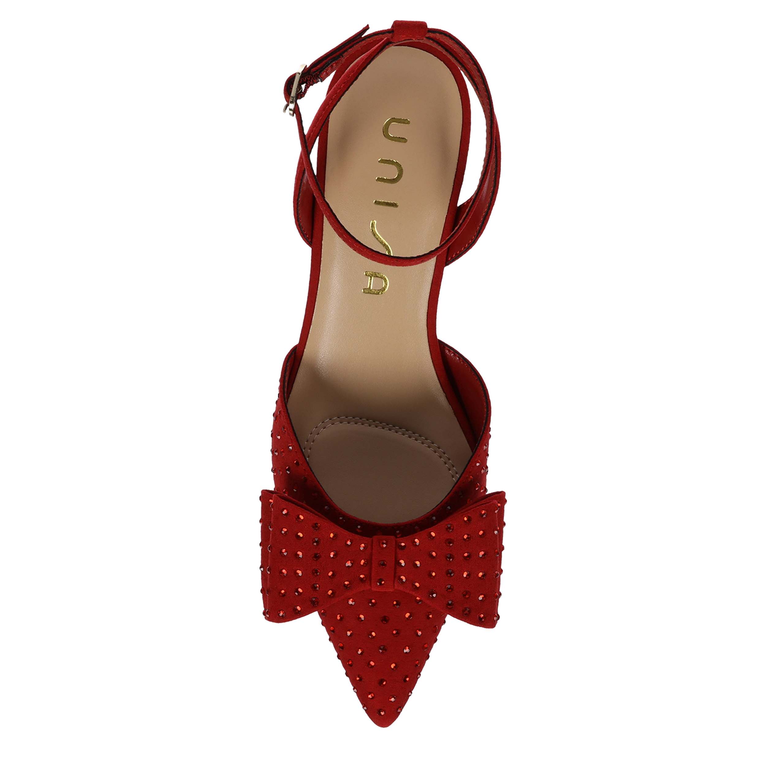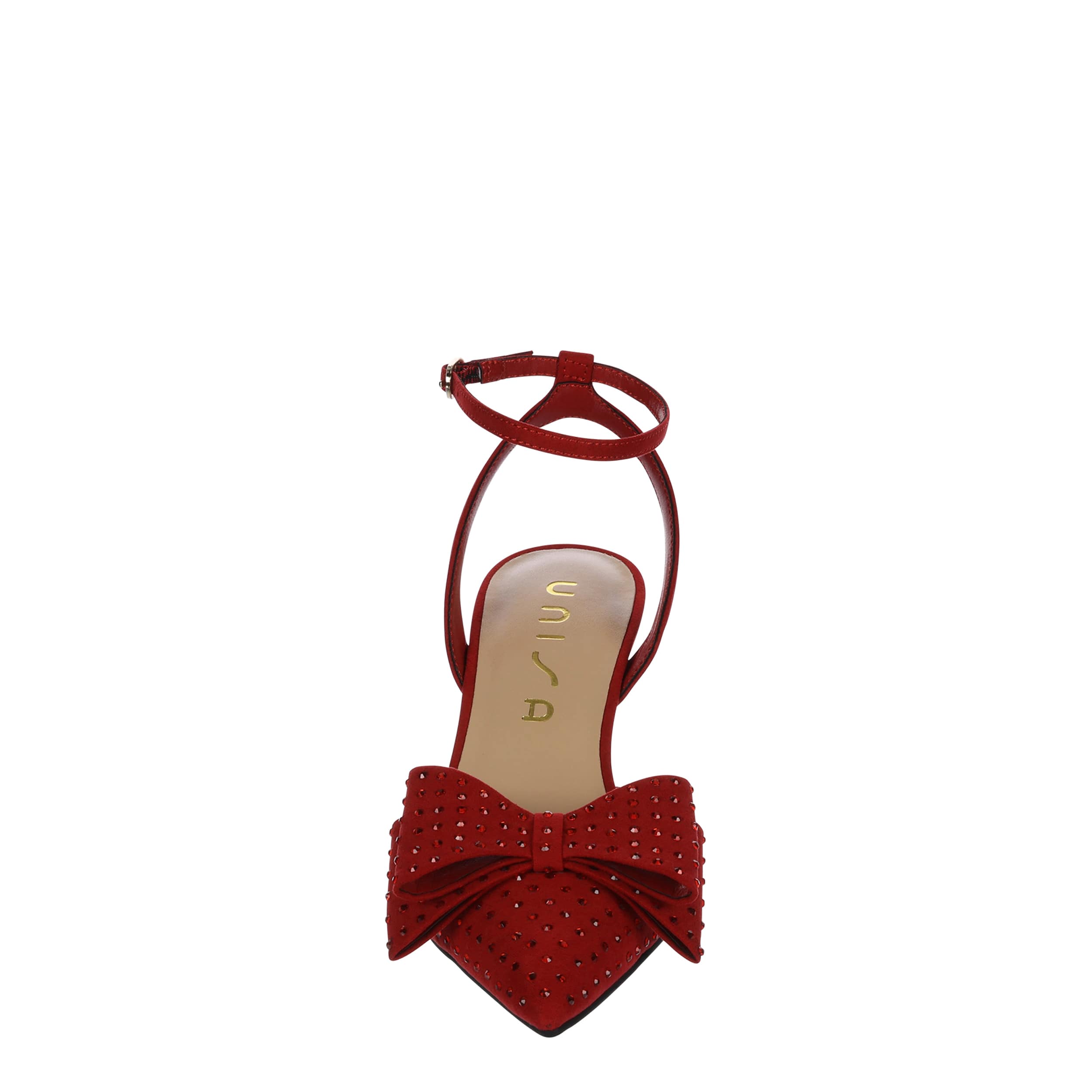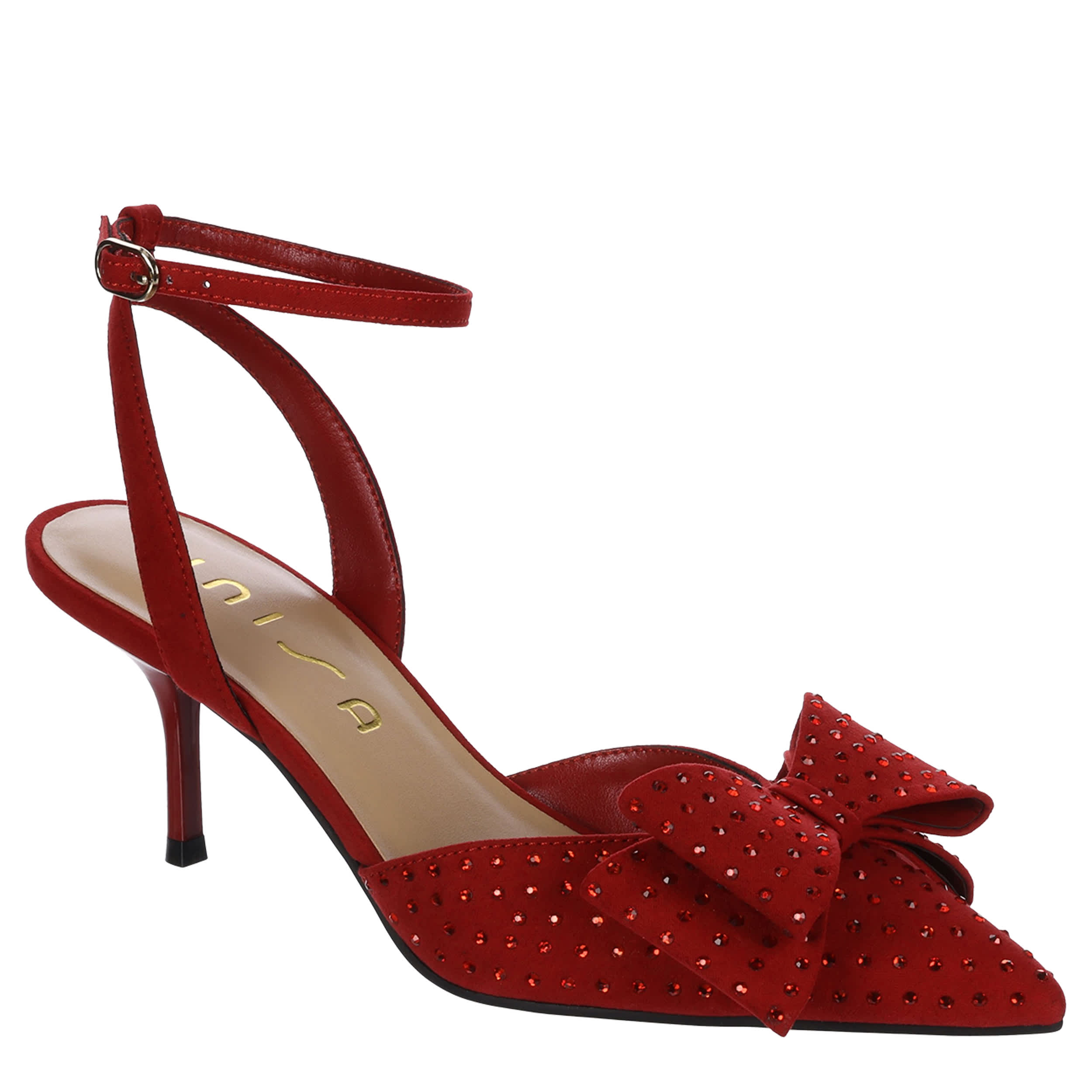 Spark conversation and shine in the Unisa Tilia pump. Featuring a faux suede upper with rhinestone detailing and a large bow on the vamp, this shoe has a sleek pointed toe and a deilcate halo strap for extra style. The insole soothes, while the heel adds just enough lift.