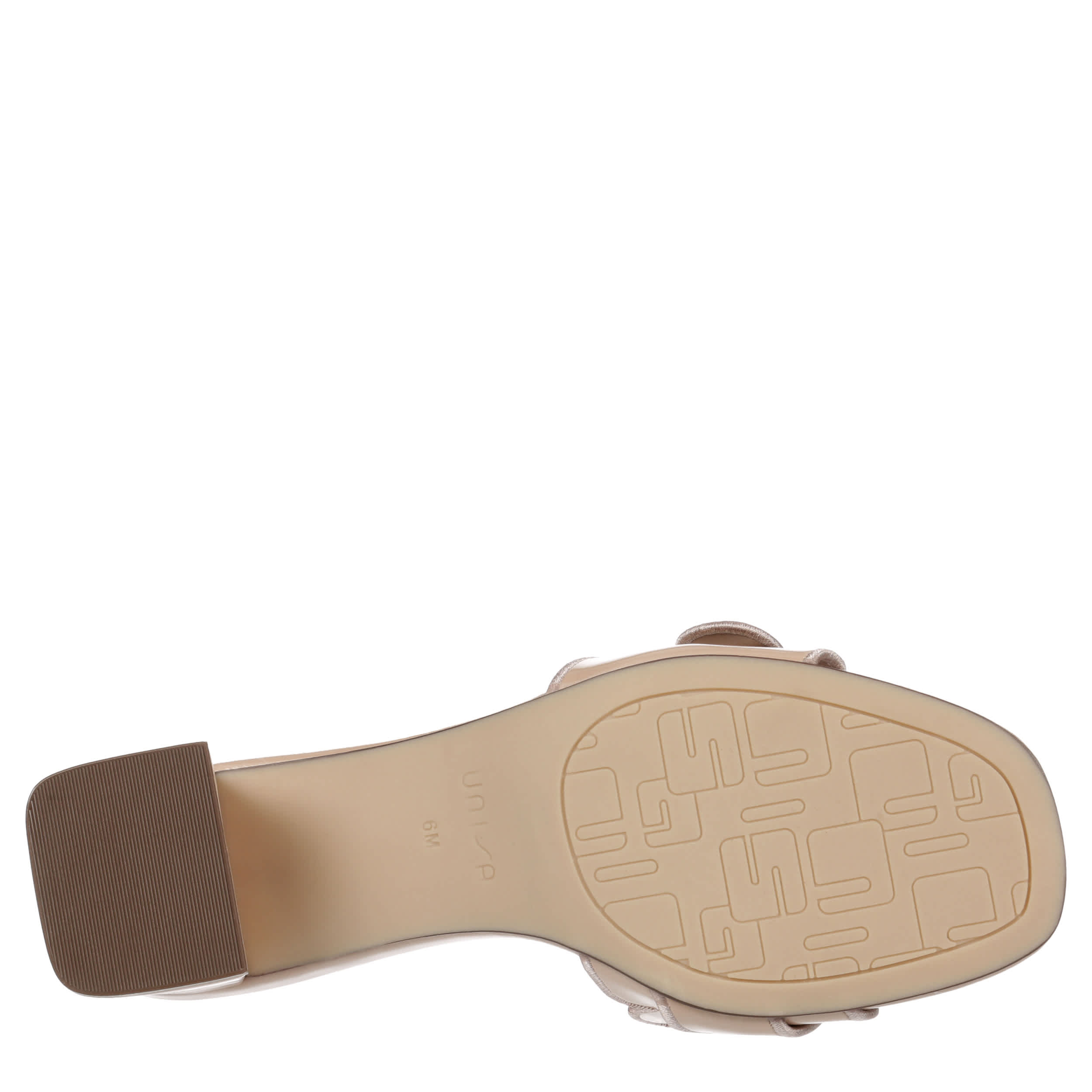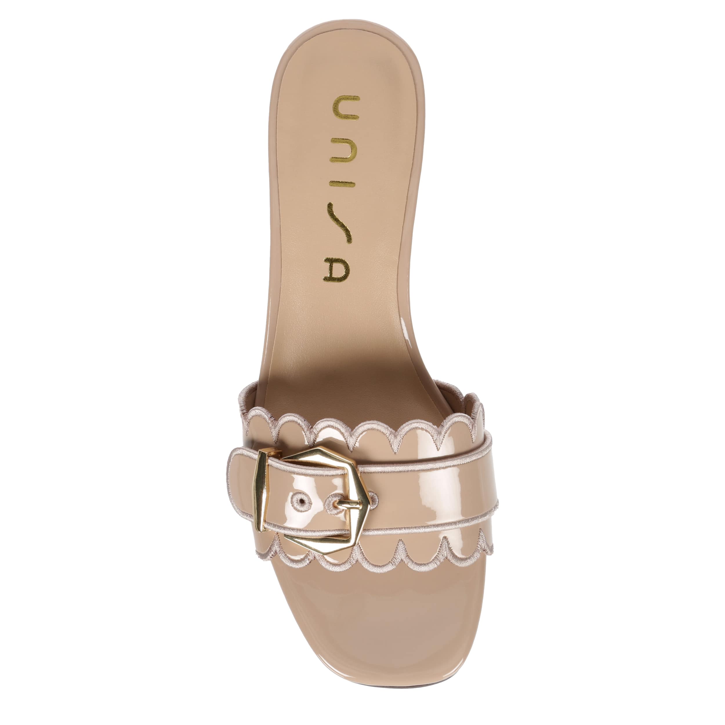 Style a chic, feminine look with the Unisa Vinley slide sandal. Featuring a glossy patent upper with a scalloped trim and buckle accent, this shoe has a square toe and sleek silhouette for extra charm. The padded insole soothes your foot, while the heel offers a stable lift.
