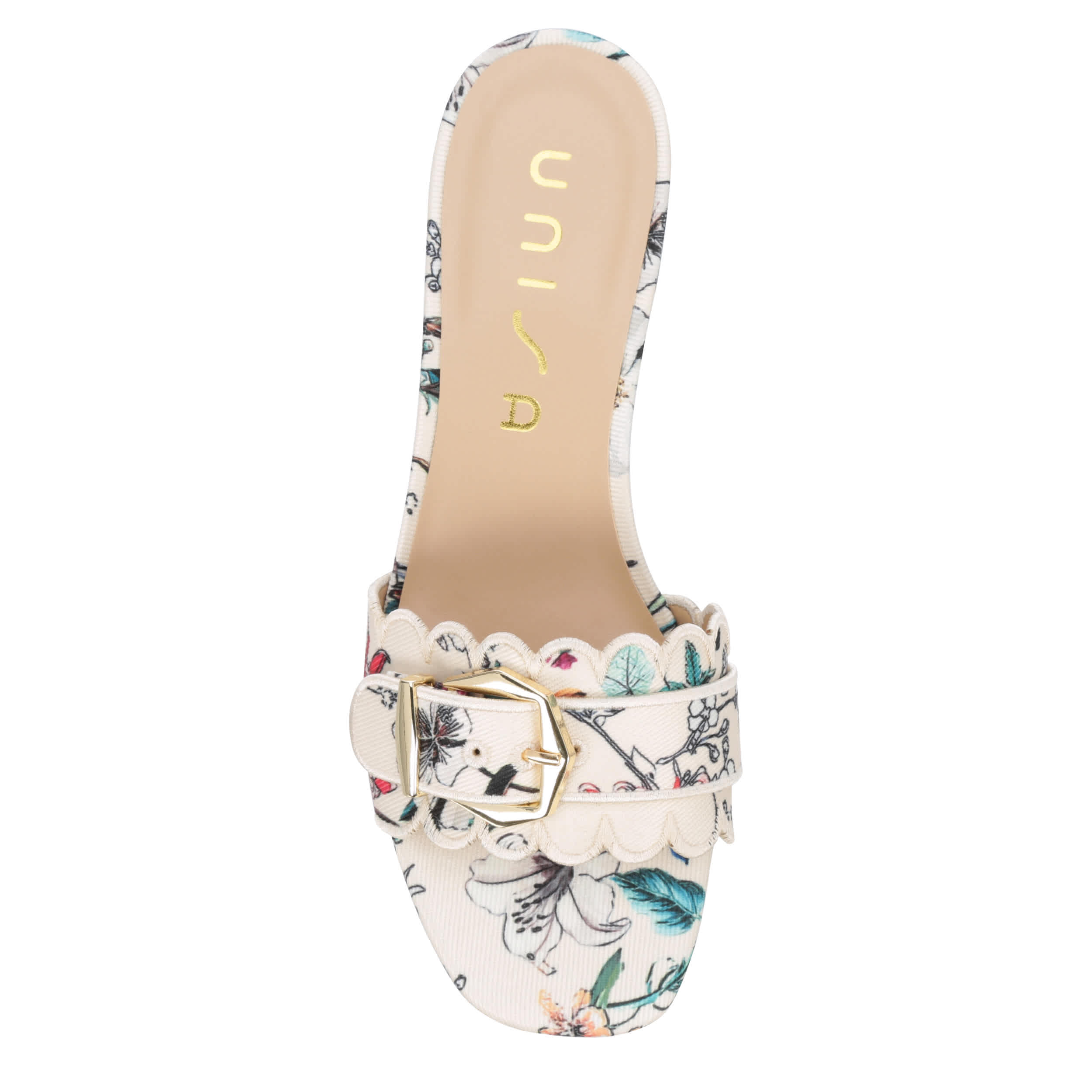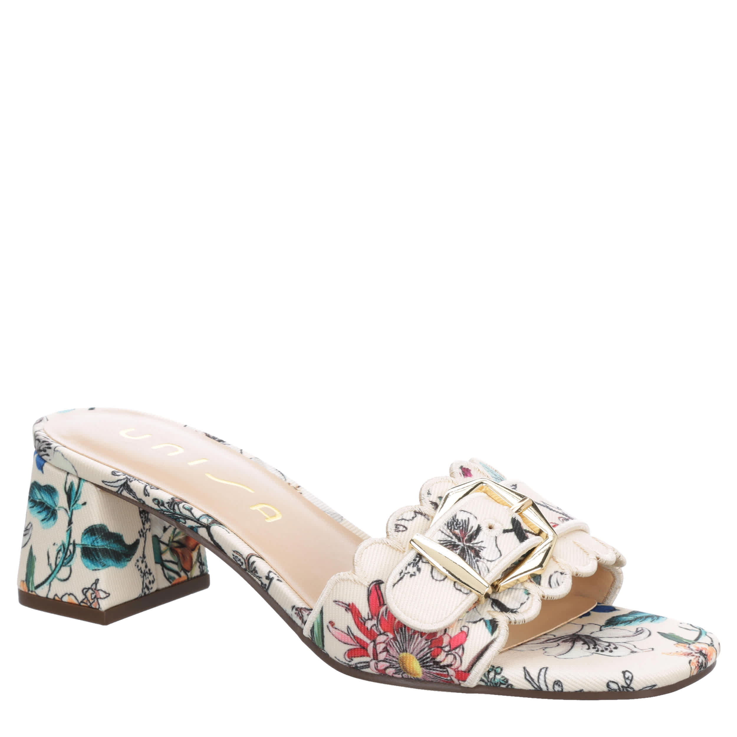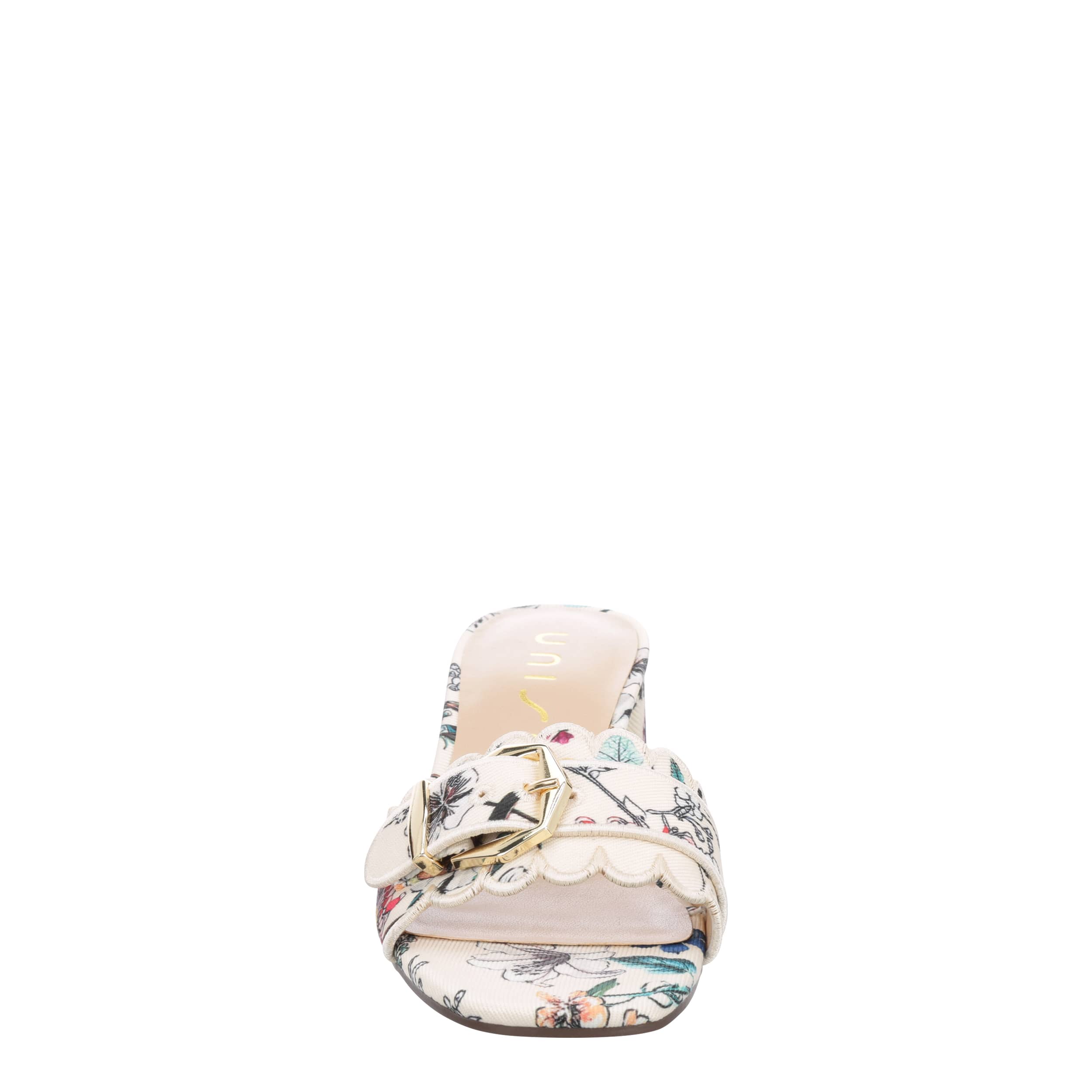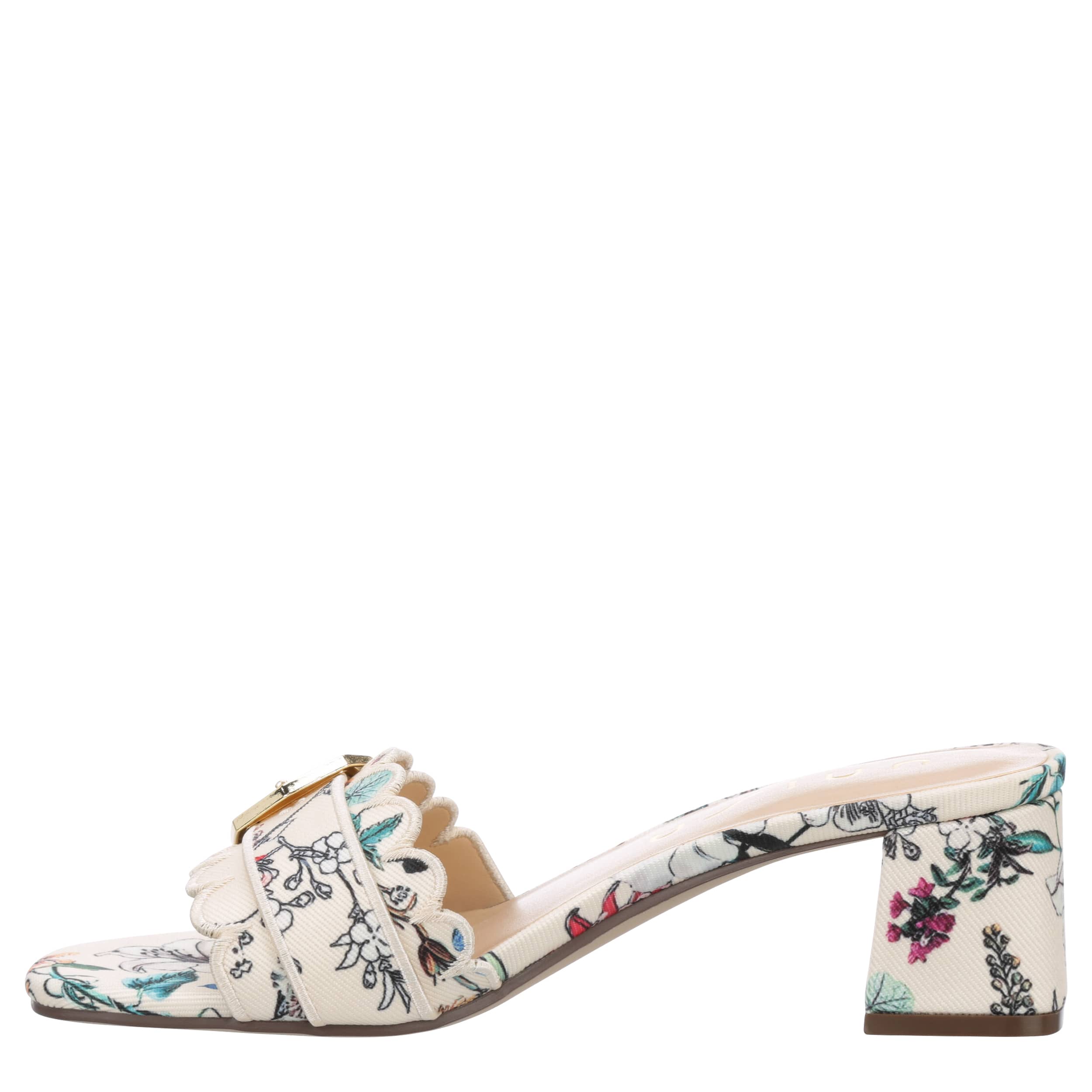 Style a chic, feminine look with the Unisa Vinley slide sandal. Featuring a fabric upper with a scalloped trim and buckle accent, this shoe has a square toe and sleek silhouette for extra charm. The padded insole soothes your foot, while the heel offers a stable lift.