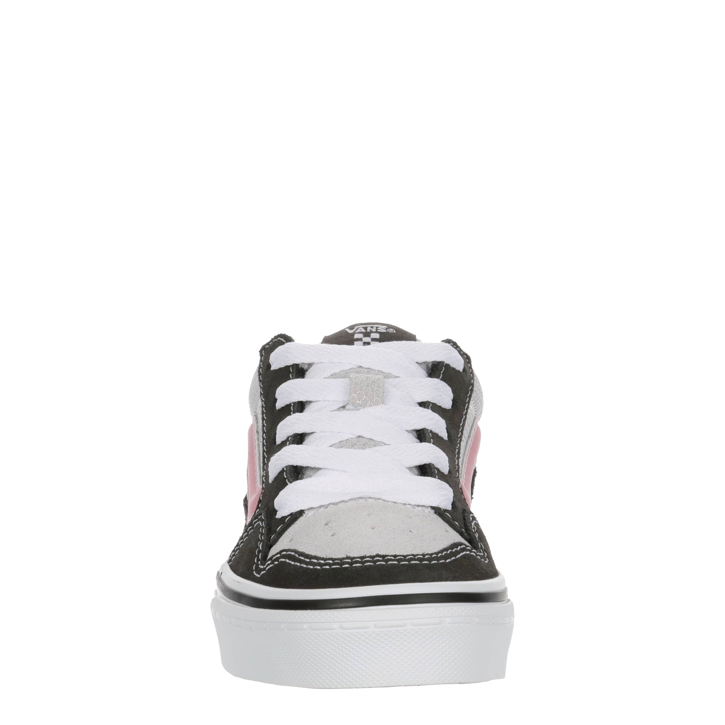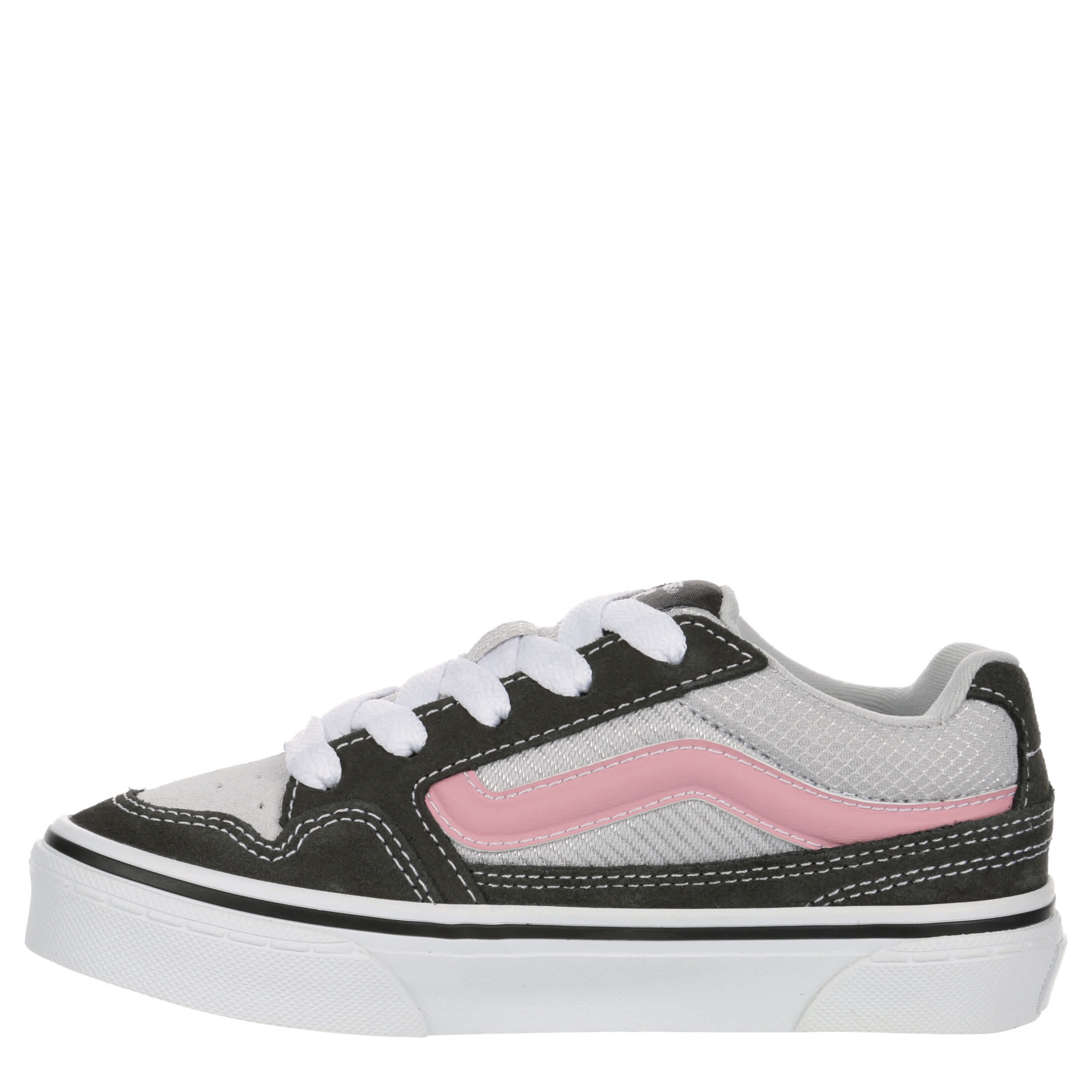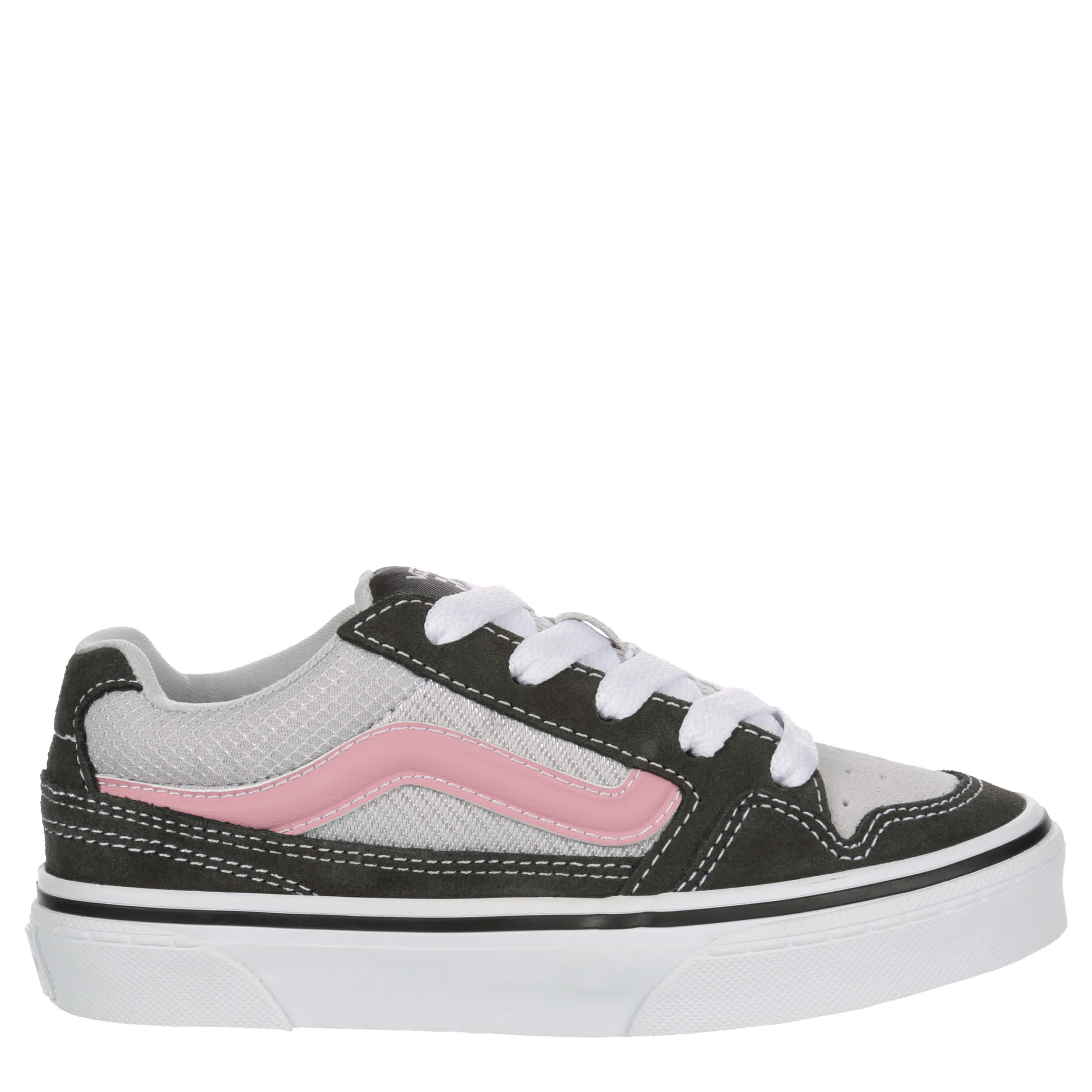 Boarding in the aughts was highlighted by the Caldrone girls' sneaker inspired by the Vans Knu Skool sneaker. With a canvas & suede upper featuring a padded collar & tongue for comfort, this lace-up shoe has a perforated toe for ventilation. The insole cushions while the signature, vulcanized outsole offers durable traction.