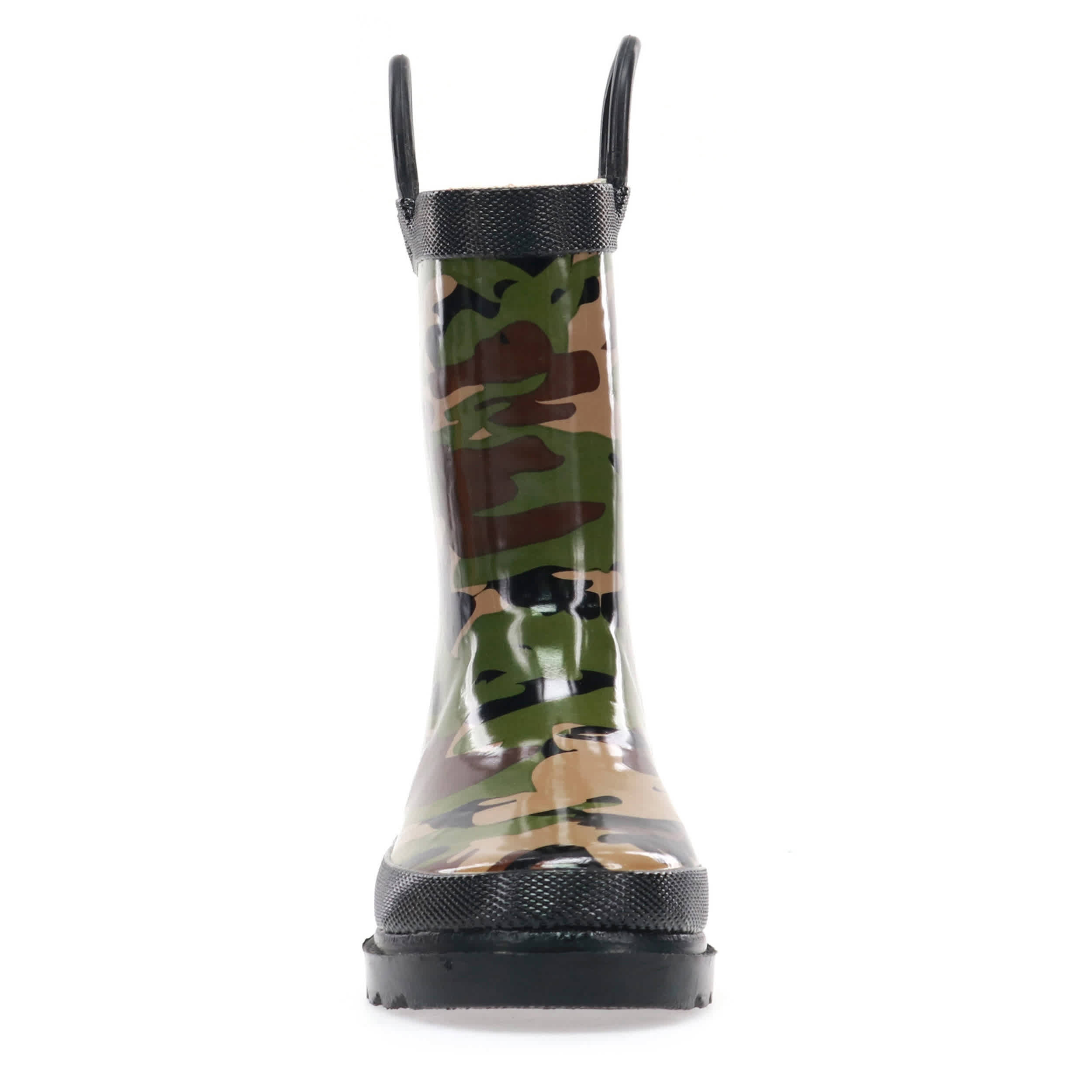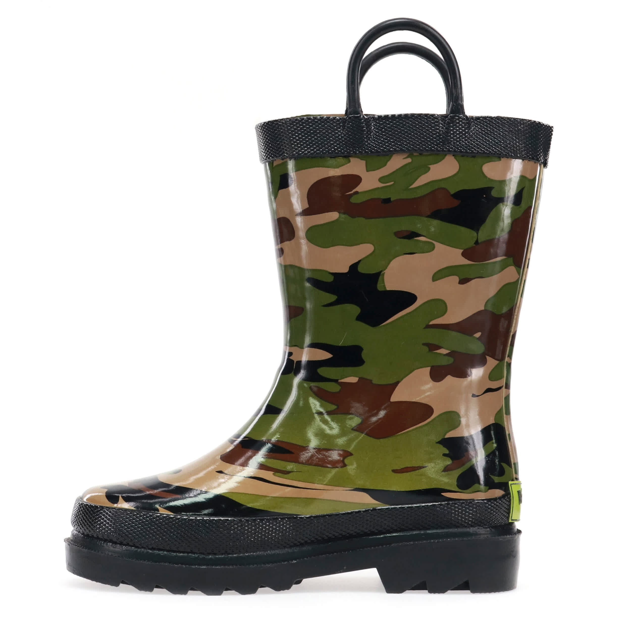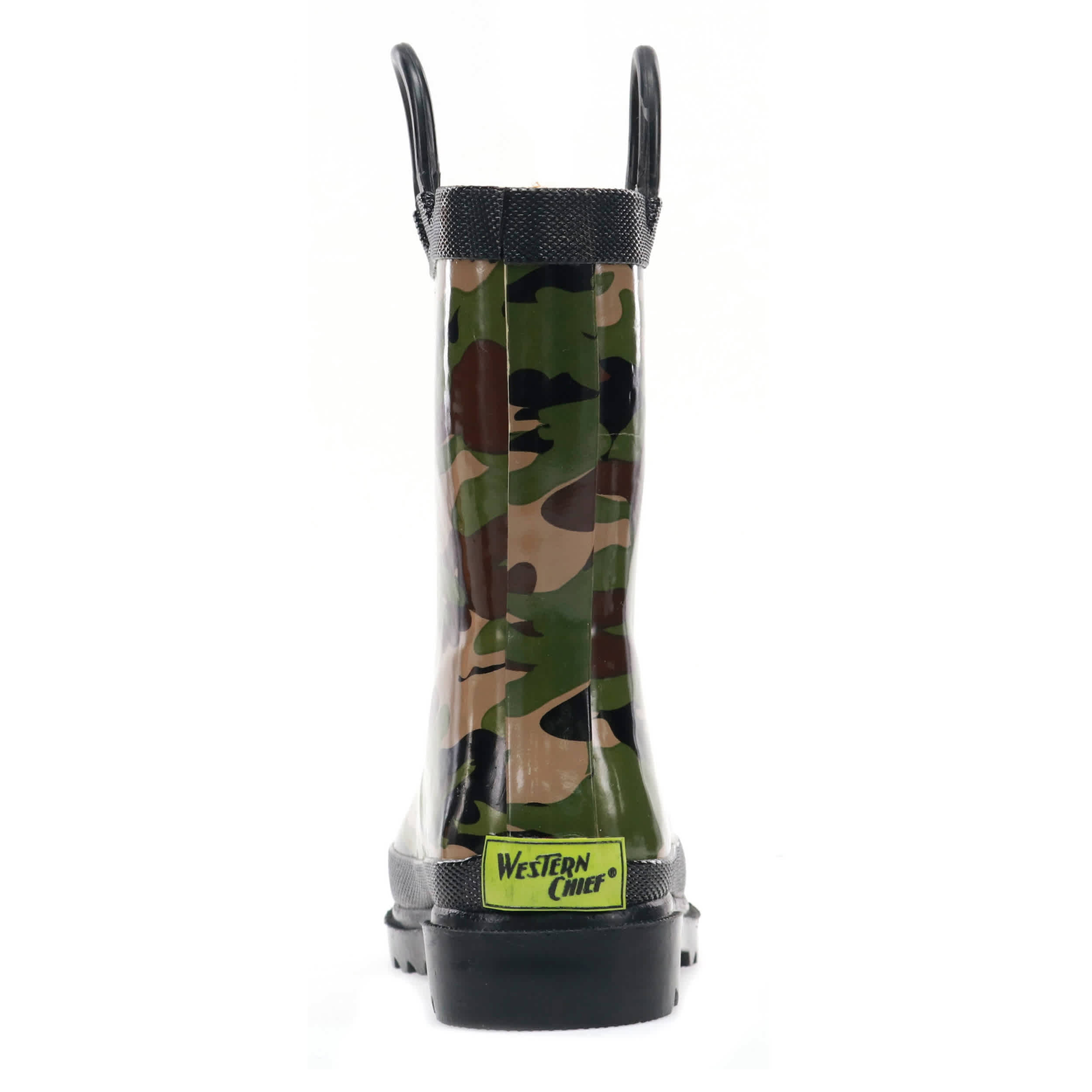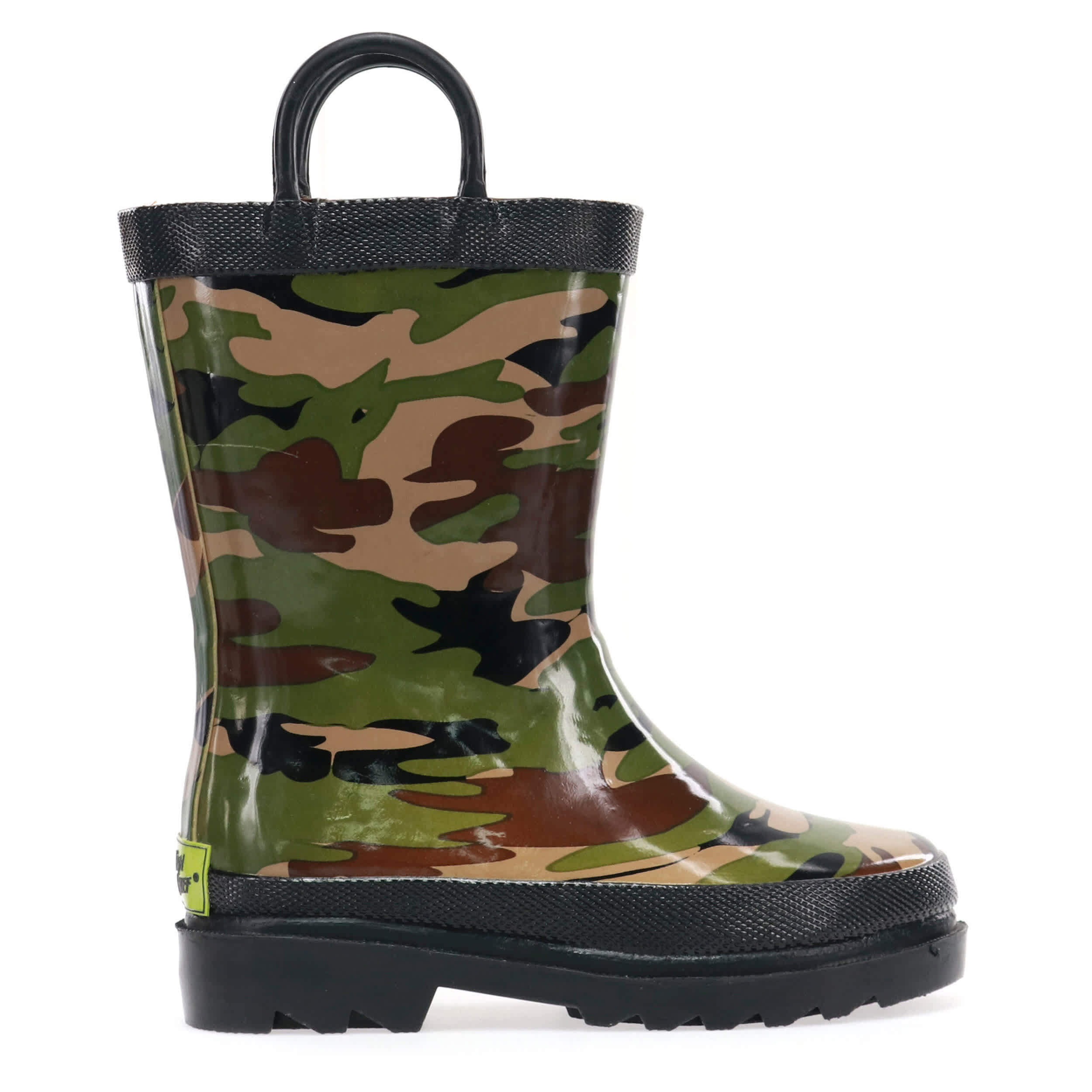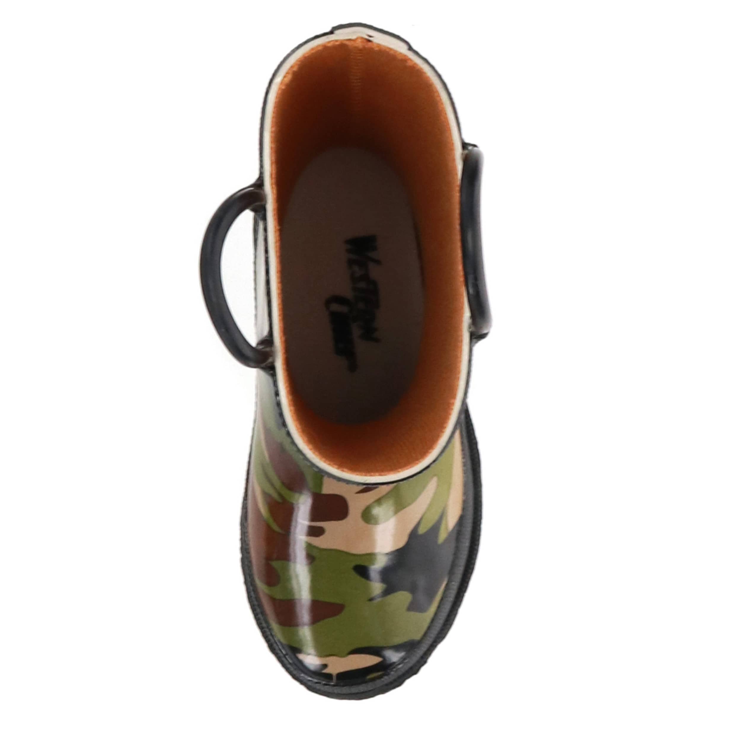 Your little one will be set for a rainy day in this mini-sized Western Chief Camo infant boys' rain boot. The green and charcoal camo graphic is printed on flexible, waterproof rubber to keep toes dry. The two side handles are handy for getting ready and the polyester/cotton blend lining is soft and moisture-absorbent, so your little camper is comfy and content before and after the rain.
