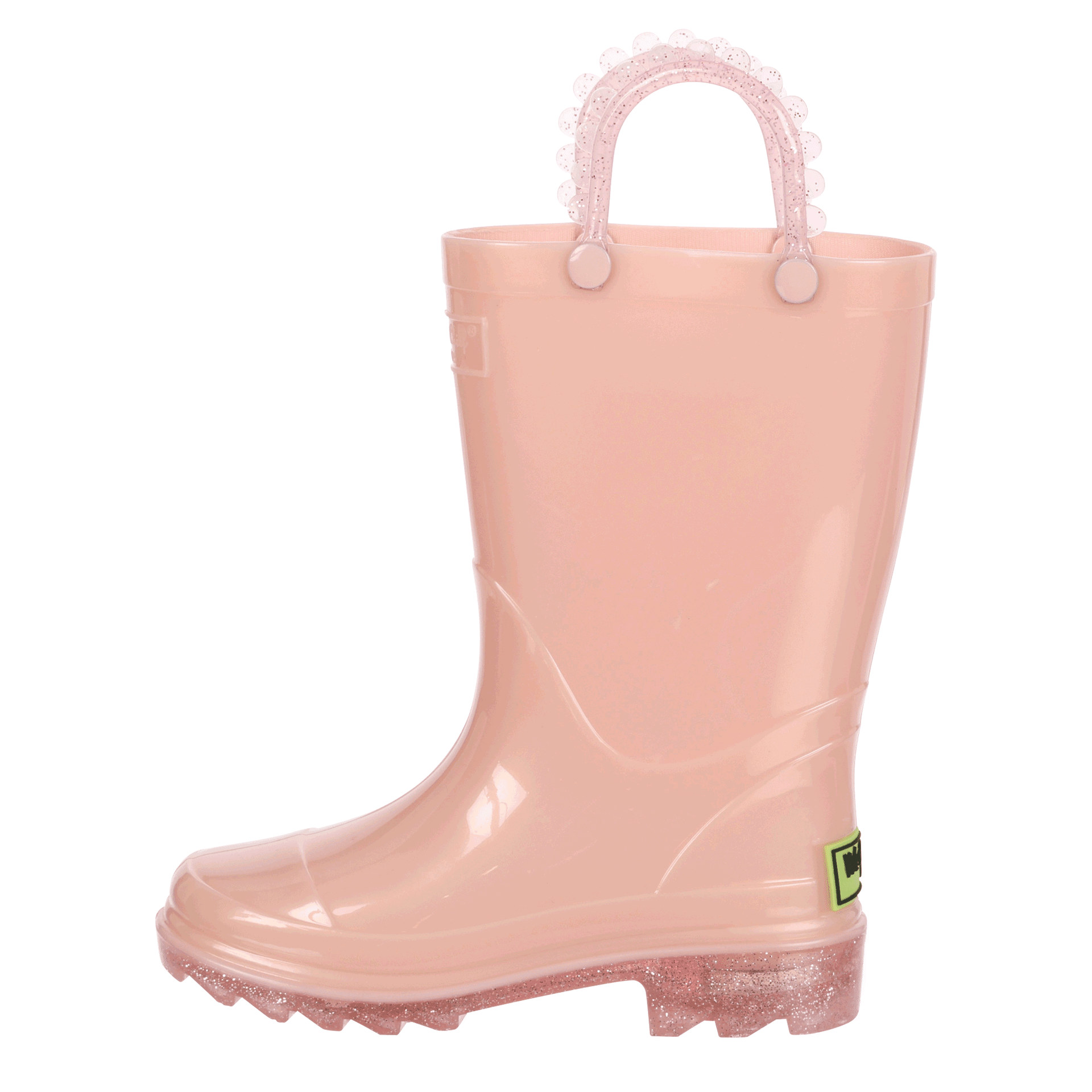 Let her brighten up those overcast skies when the rain hits in the Western Chief Rainbow toddler girls' rain boot. She'll love the design but even more, the lighted PVC heel that flashes with every step, perfect for darker days and an added safety feature. The flexible, waterproof rubber boot and cotton lining keep toes dry while the two side handles are handy for getting ready for those puddles.