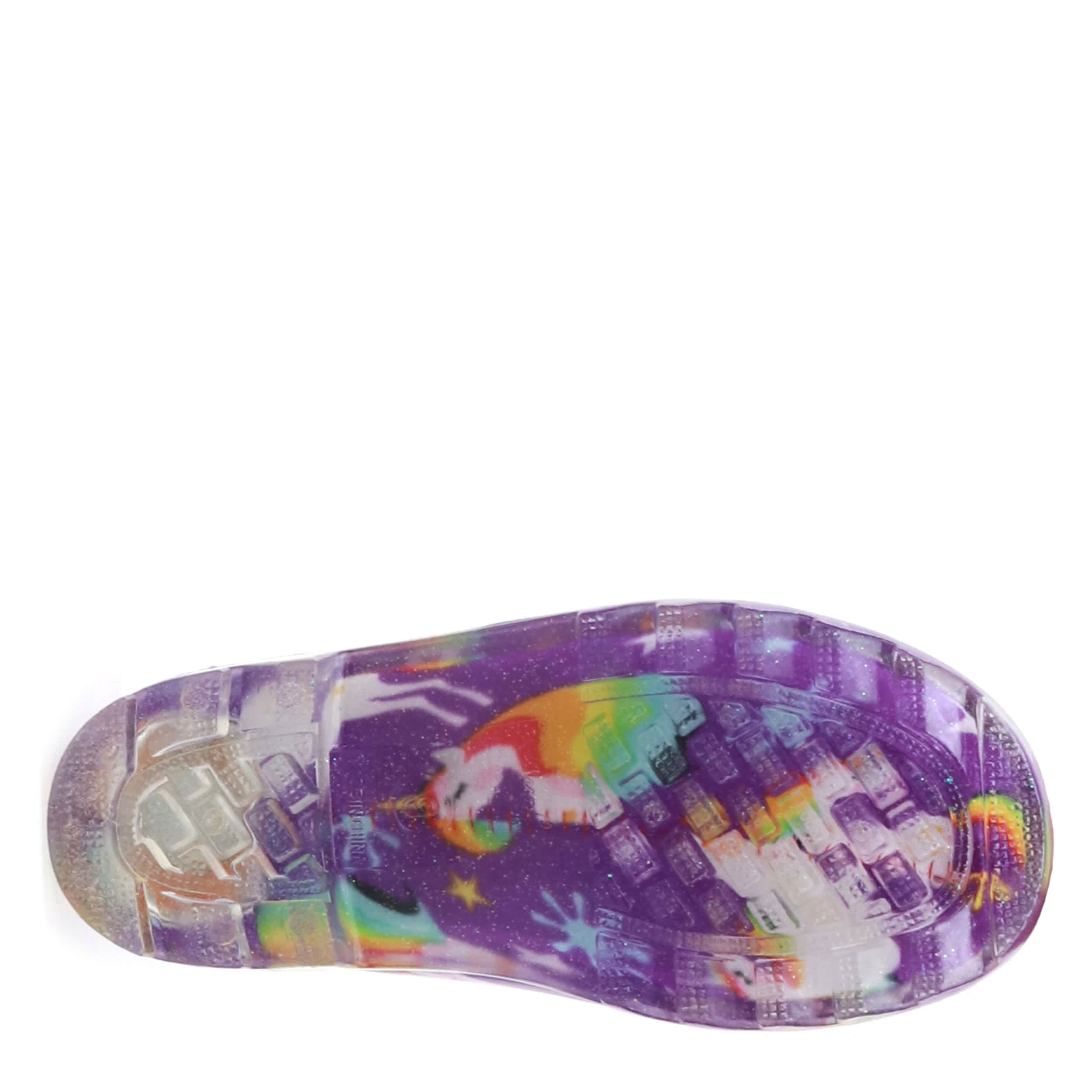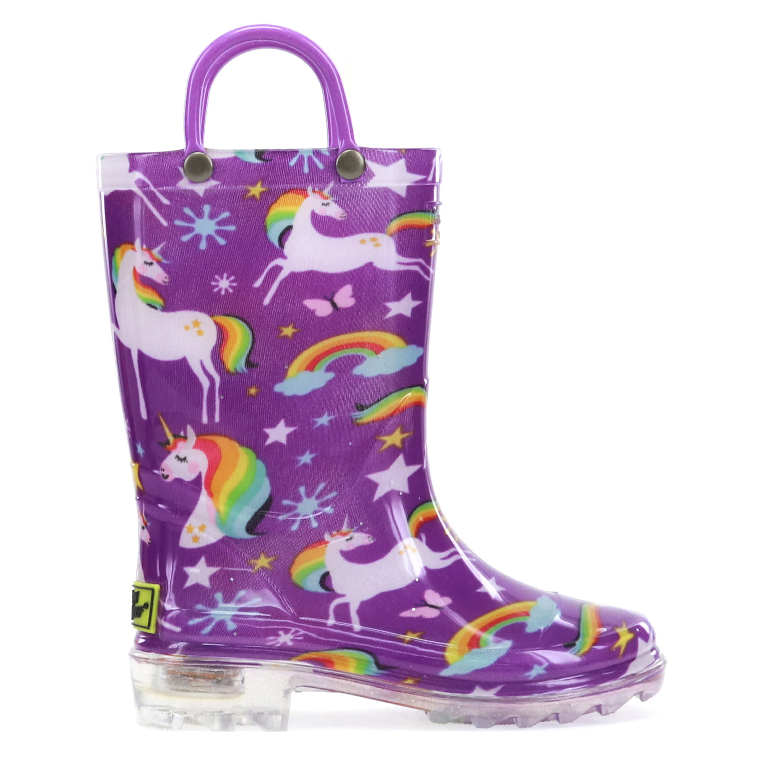Your little princess will look precious in the Western Chief Rainbow Unicorn Lighted infant girls' rain boot. The fun unicorn print in waterproof rubber keeps toes dry, plus gleams for all to see with the lighted feature in the heel of the boot. With two side handles for easy on and off and a treaded outsole for puddle jumping, you'll be happy when the next rainy day visits.