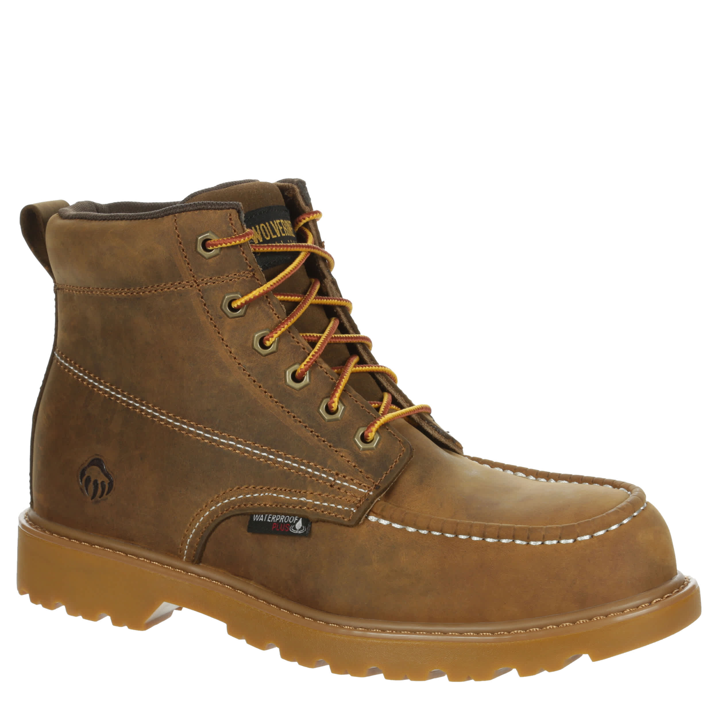 Hang in for the long haul with the Wolverine Floorhand Moc-Toe Steel-Toe work boot. You're protected by the nylon shank and steel toe, while the mesh lining and flexible midsole keep feet fresh. Waterproof leather means you don't break until the task is complete, come what may.