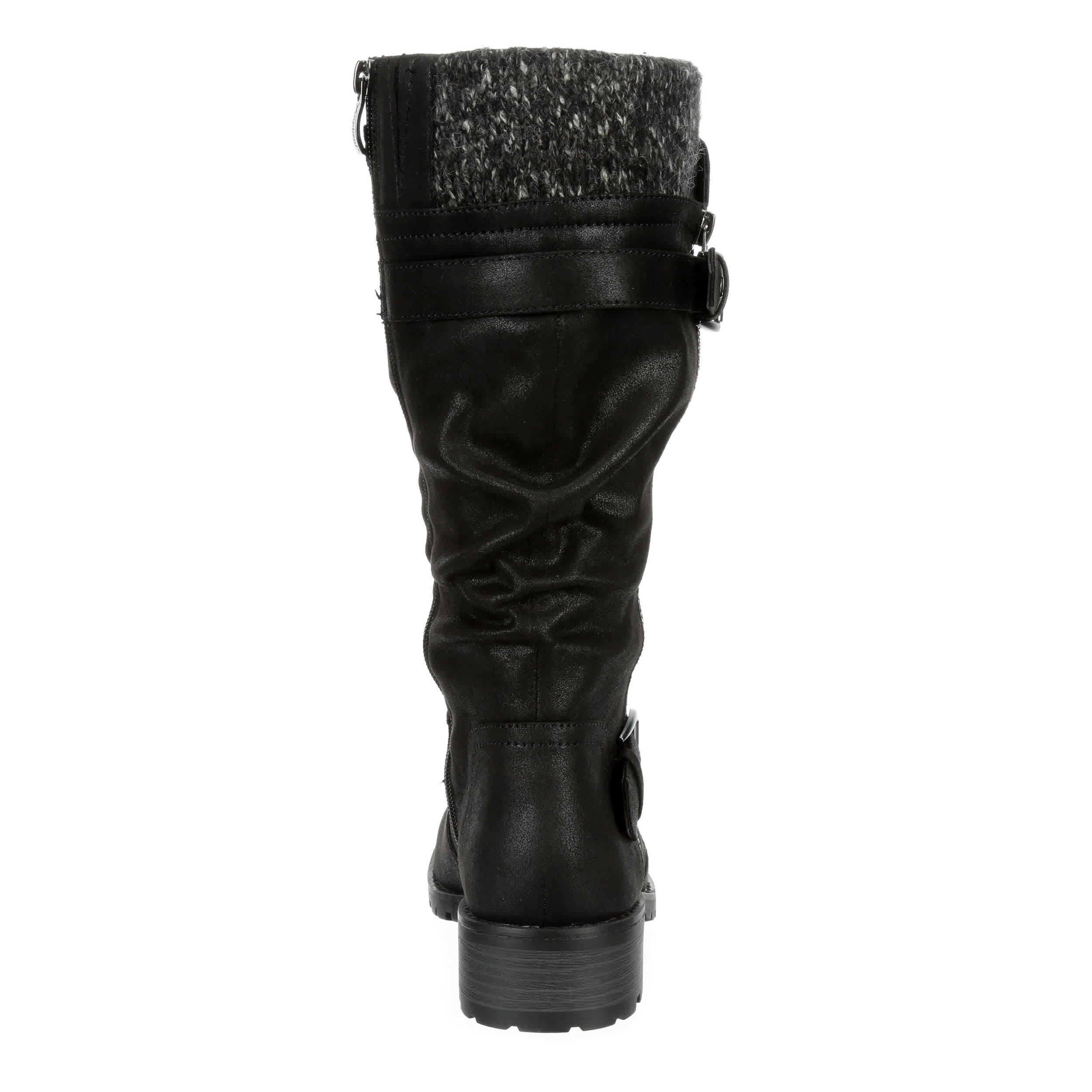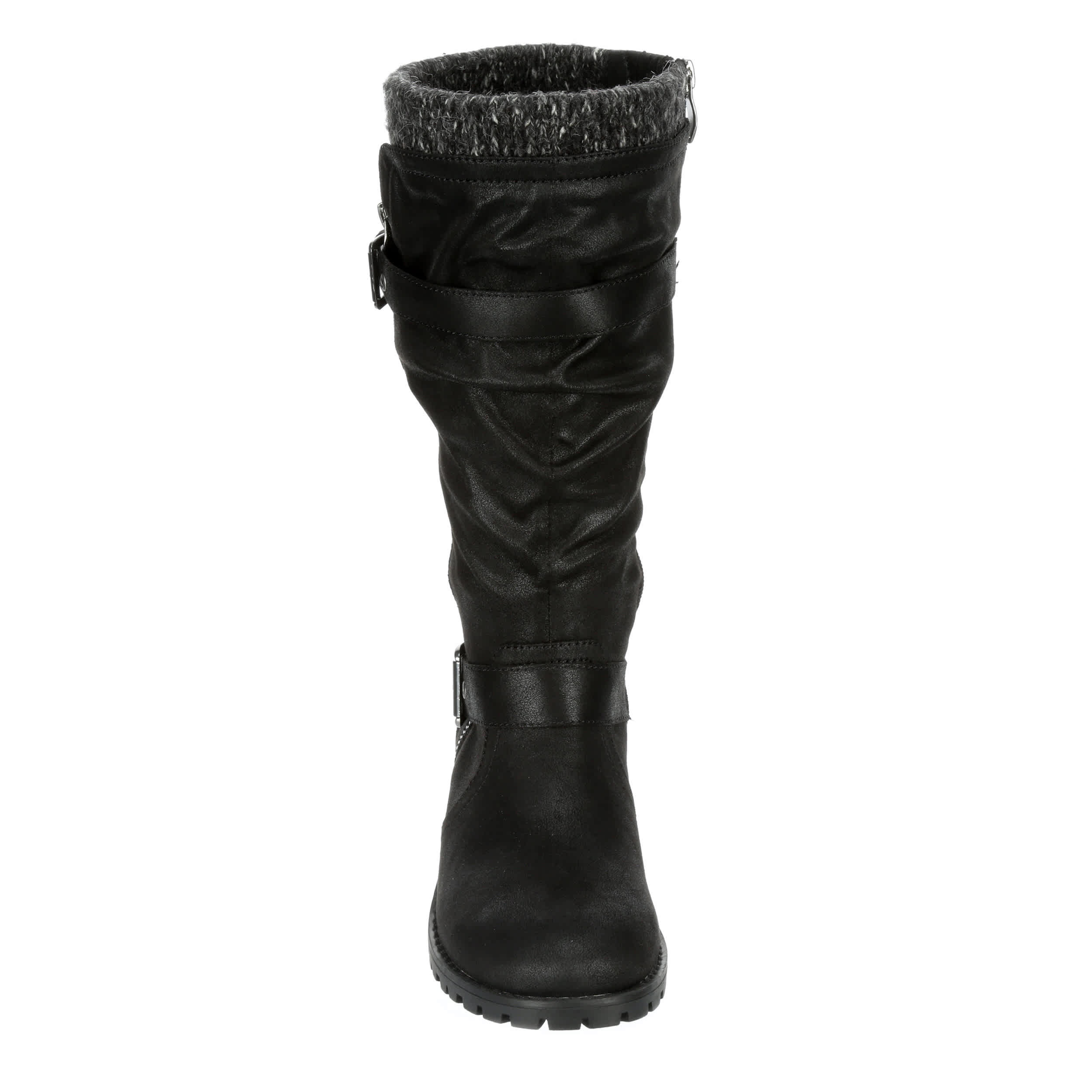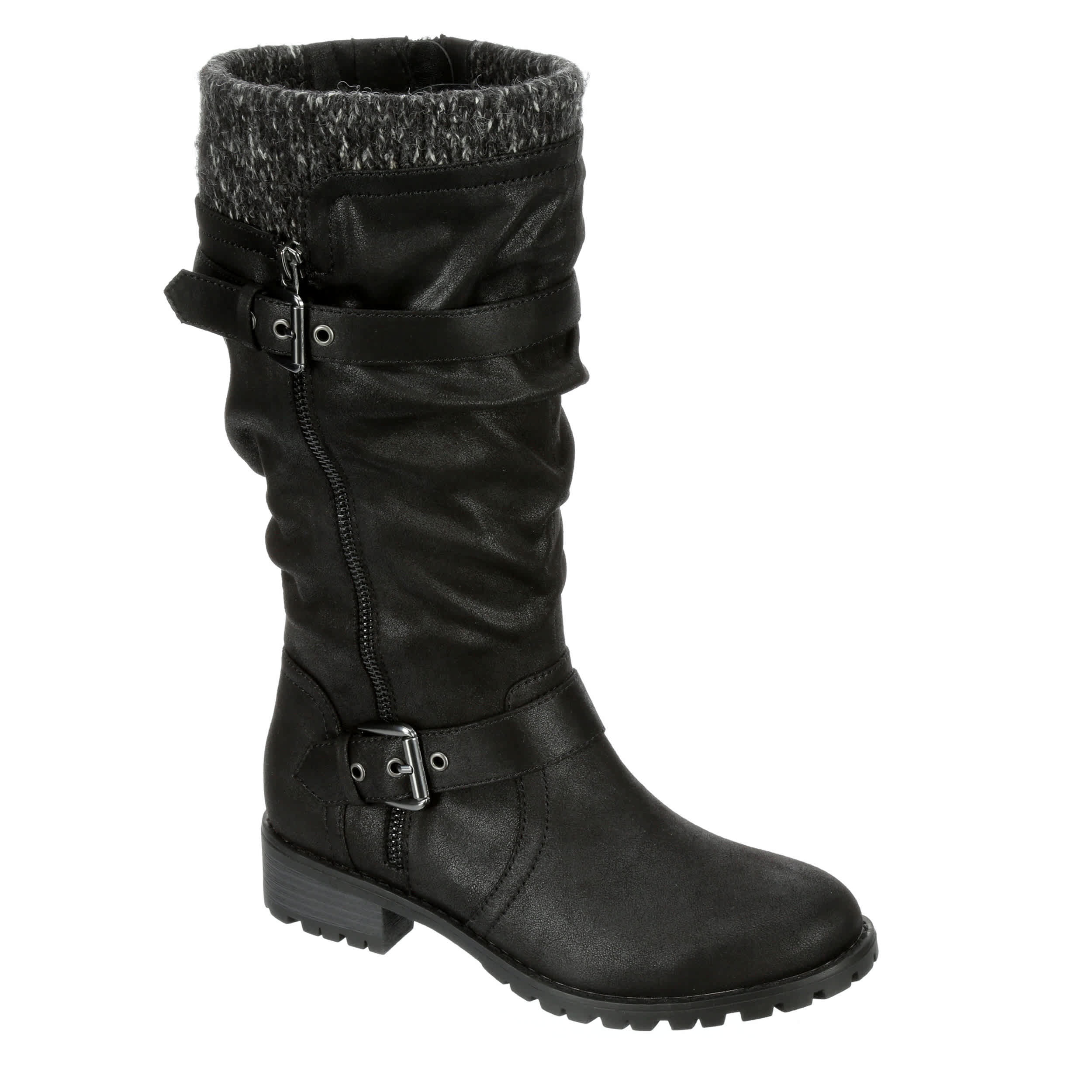 Look fashionable in the frosty air with the Chelsey boot from Xappeal. Featuring a faux suede upper with a sweater-inspired collar to for style, these black boots make your wardrobe pop. The durable lug-style outsole supports every step while the buckle details add cuteness.