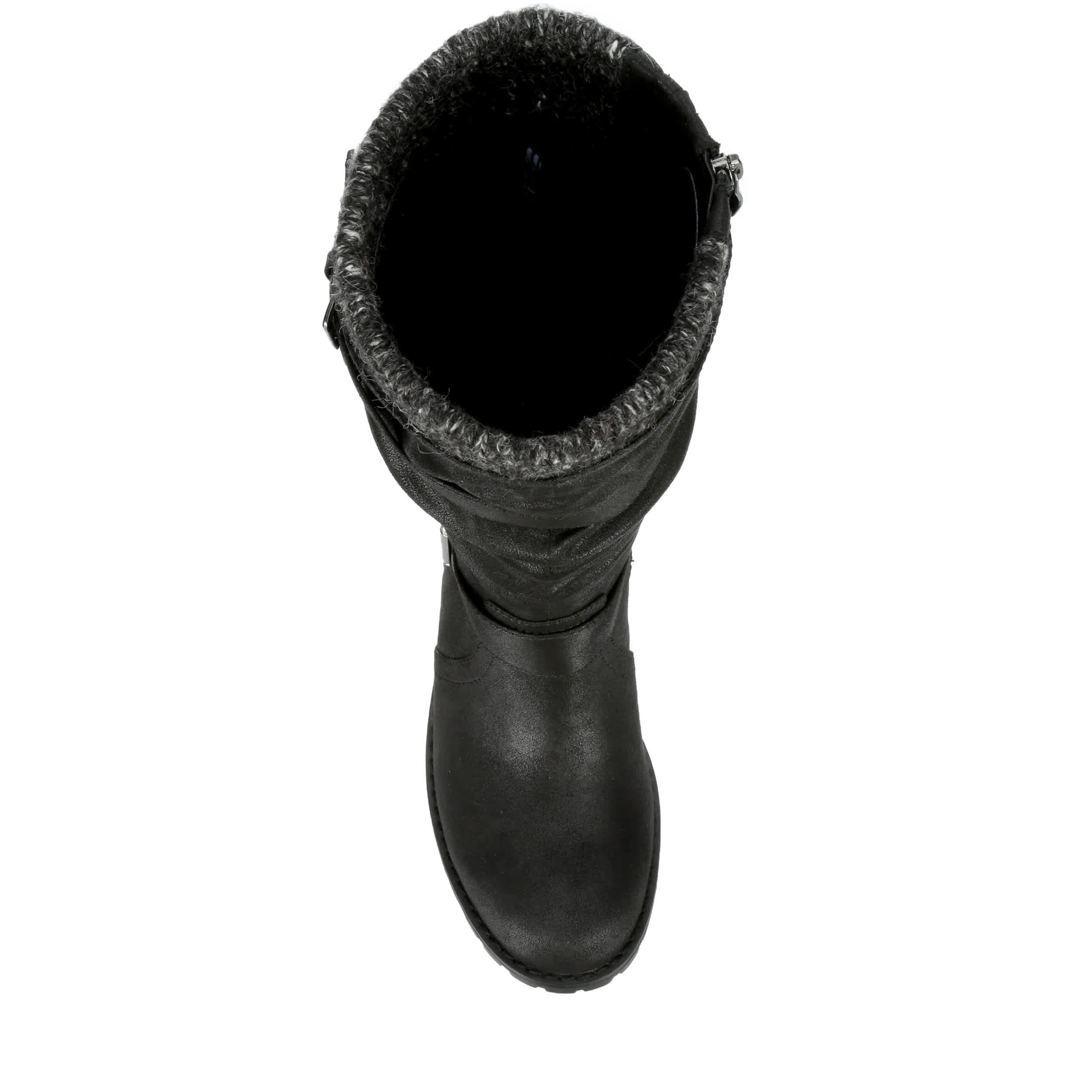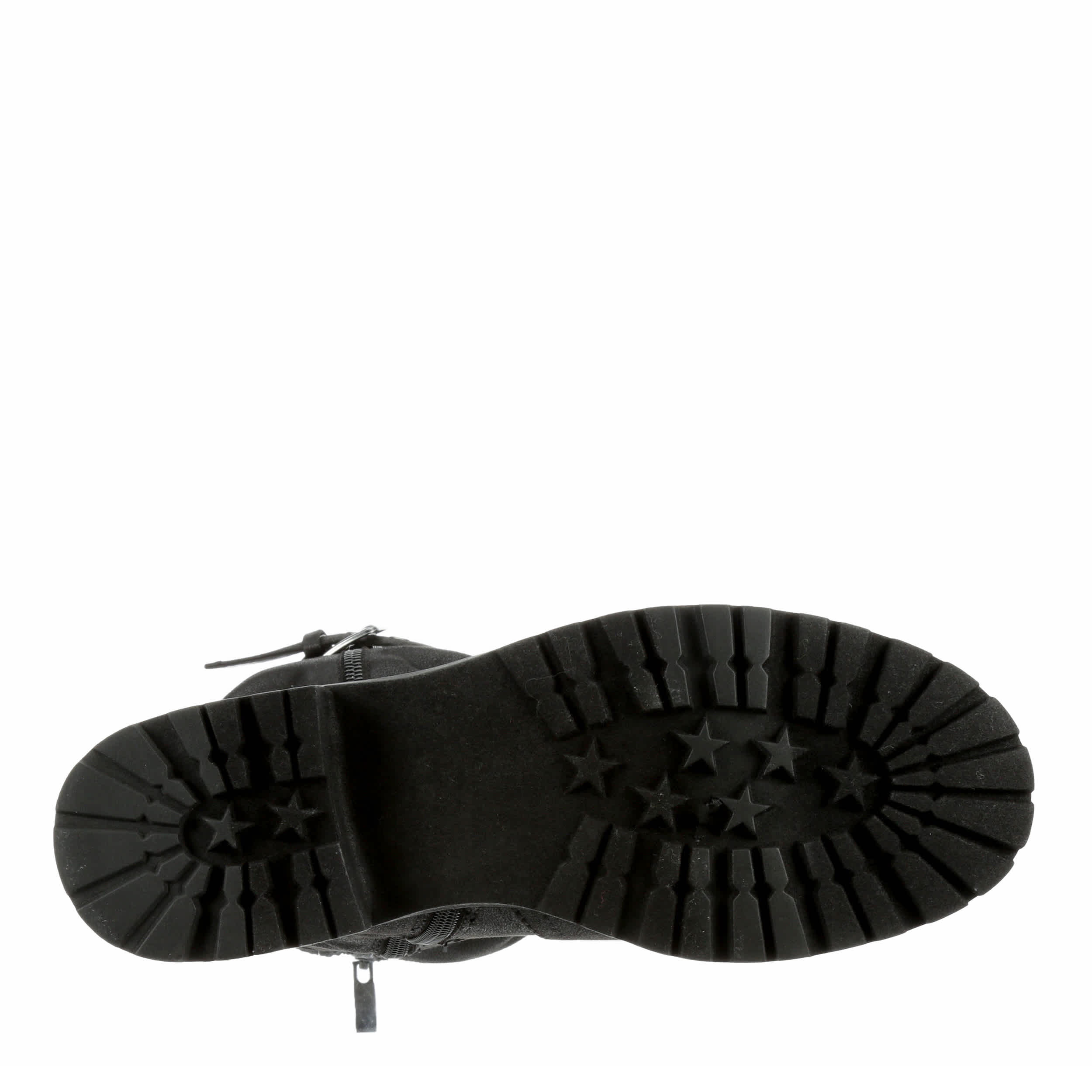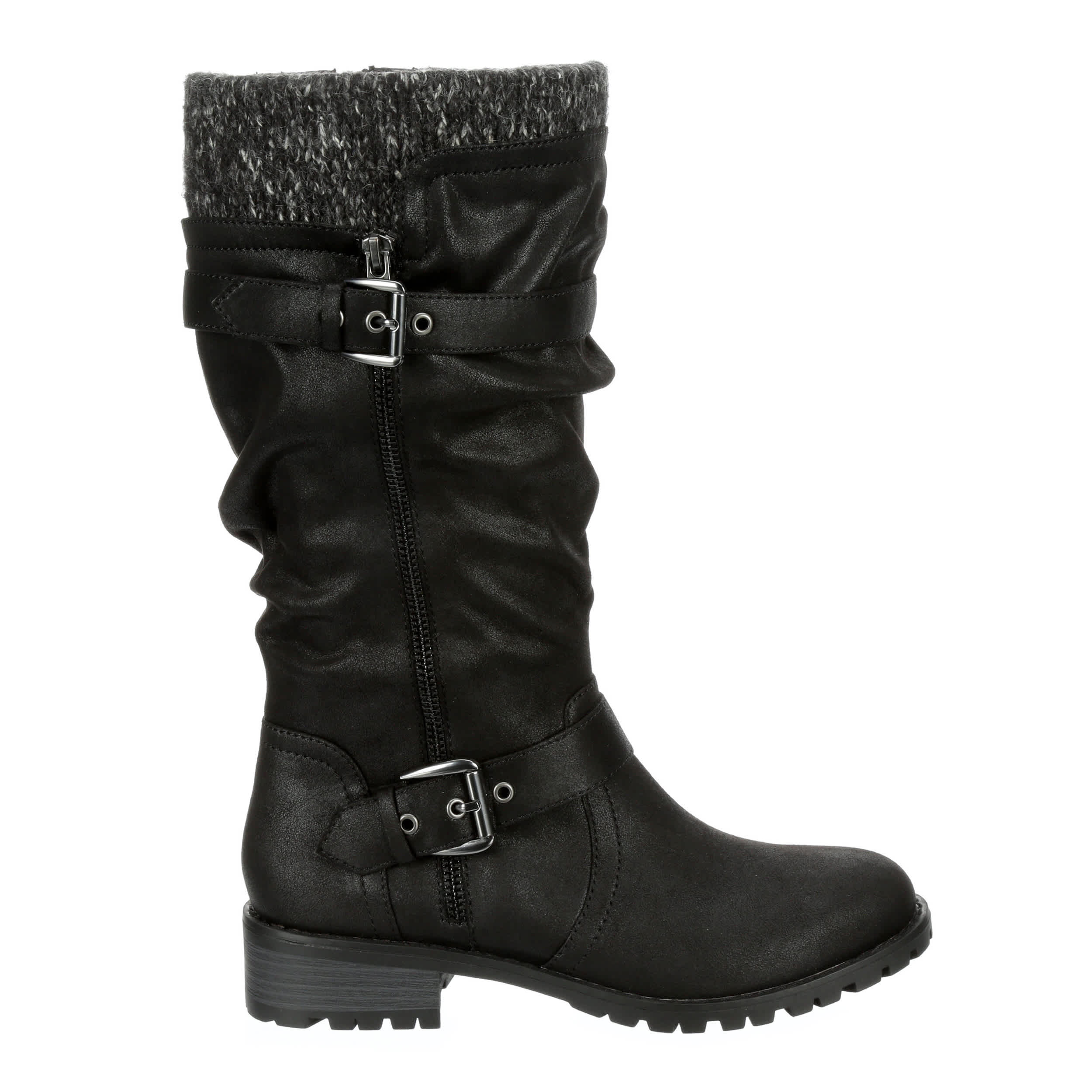 Look fashionable in the frosty air with the Chelsey boot from Xappeal. Featuring a faux suede upper with a sweater-inspired collar to for style, these black boots make your wardrobe pop. The durable lug-style outsole supports every step while the buckle details add cuteness.