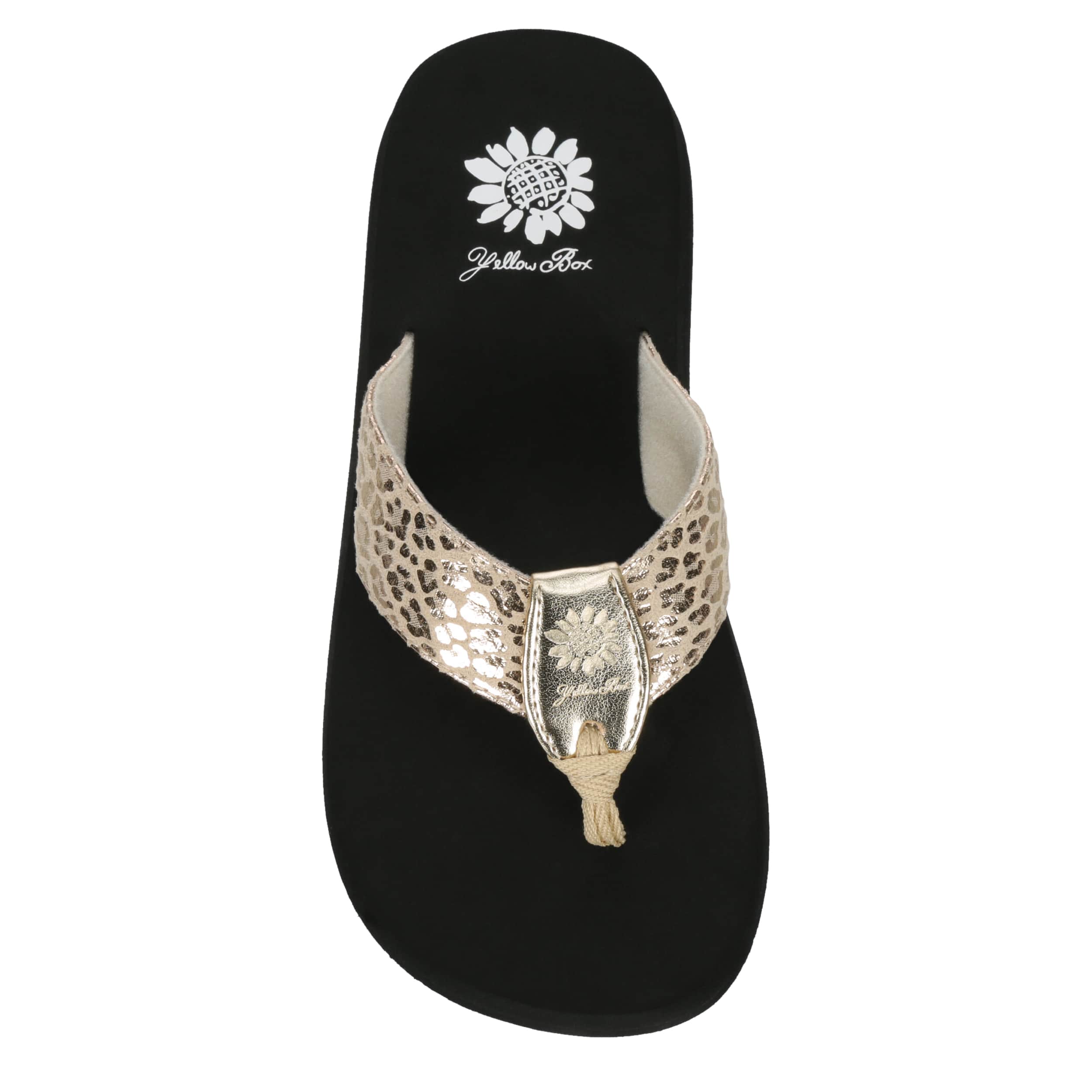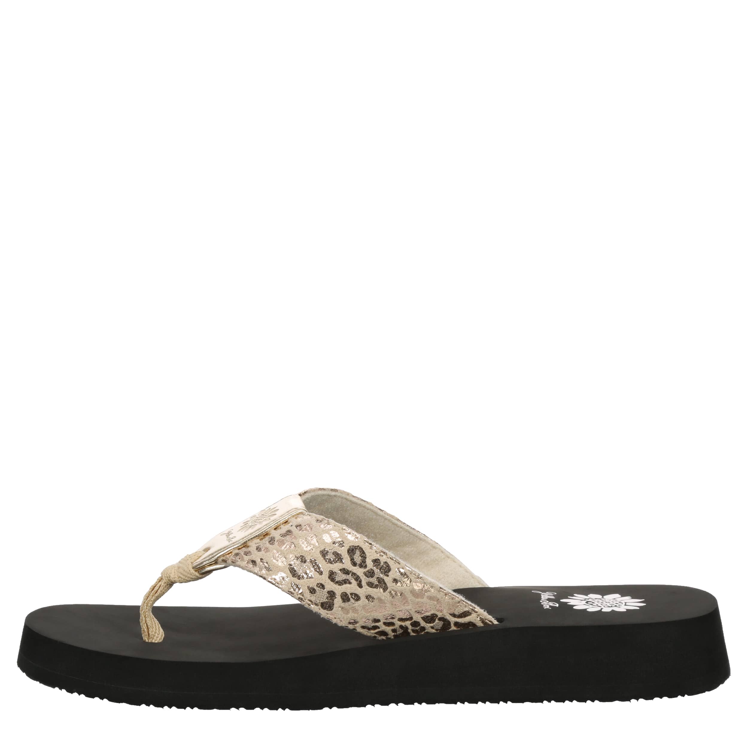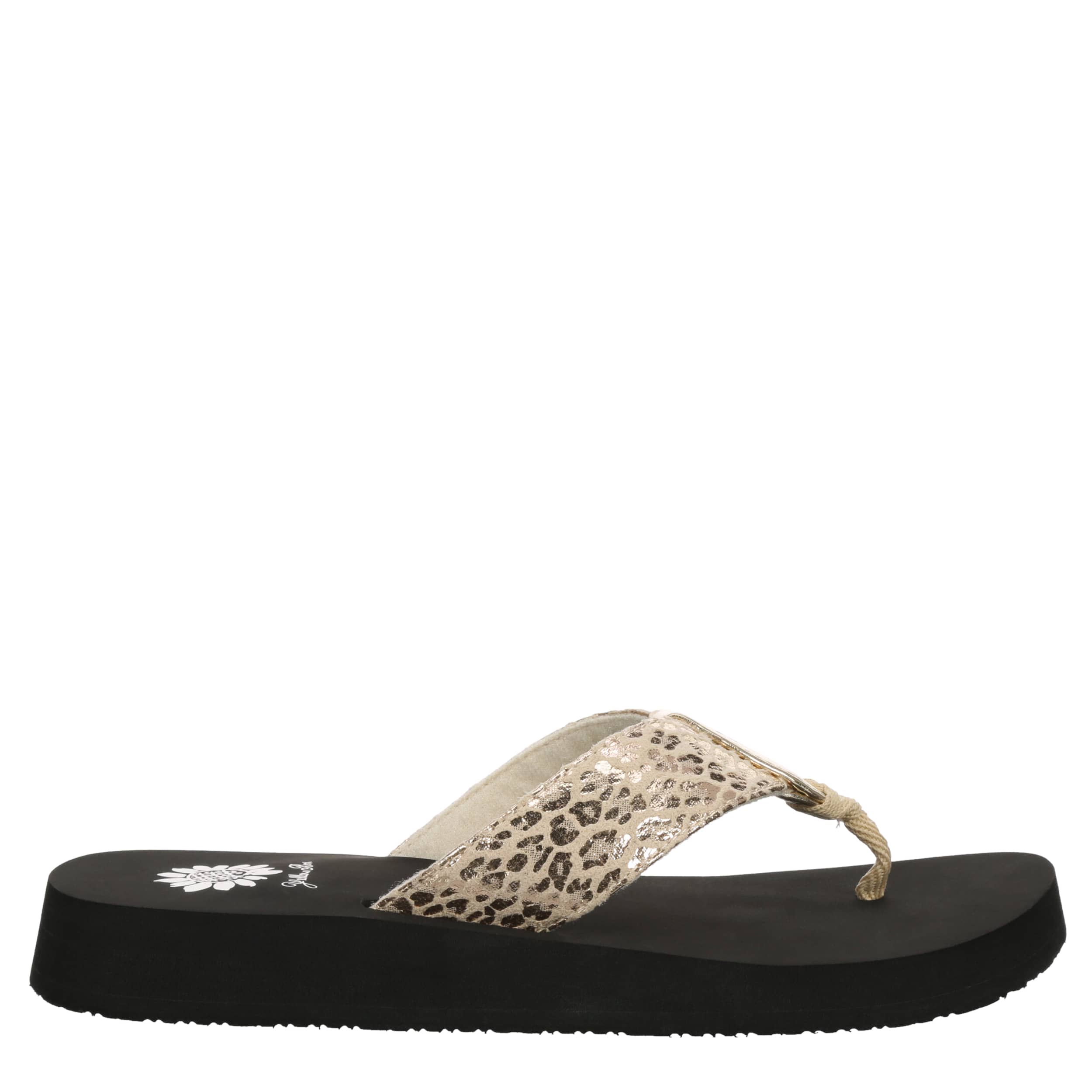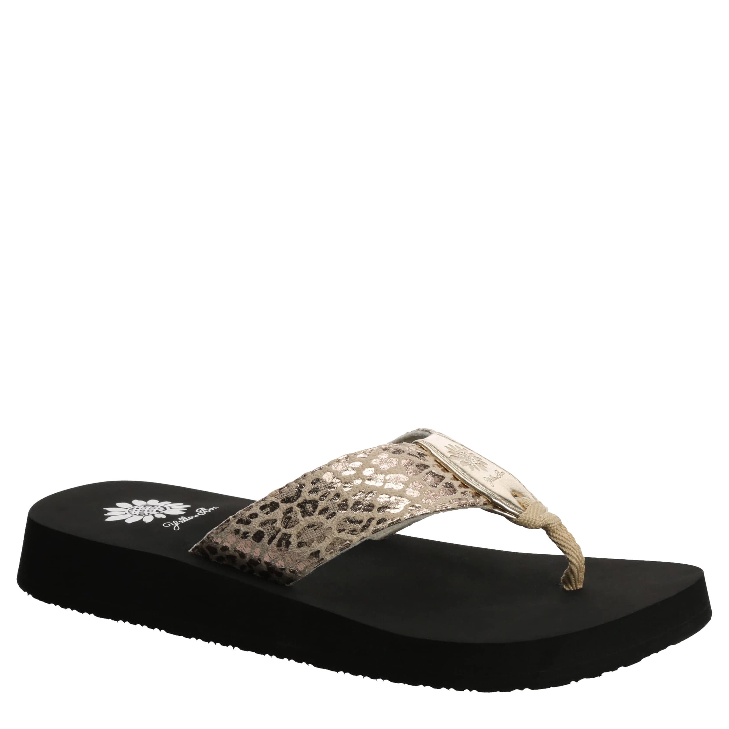 Lay low in the Ferrara women's flip flop sandal from Yellow Box. Featuring a leopard printed design with metallic accents, this fun thong works casually or dressy. The contoured footbed cradles your foot with comfort, while the heel adds subtle lift.