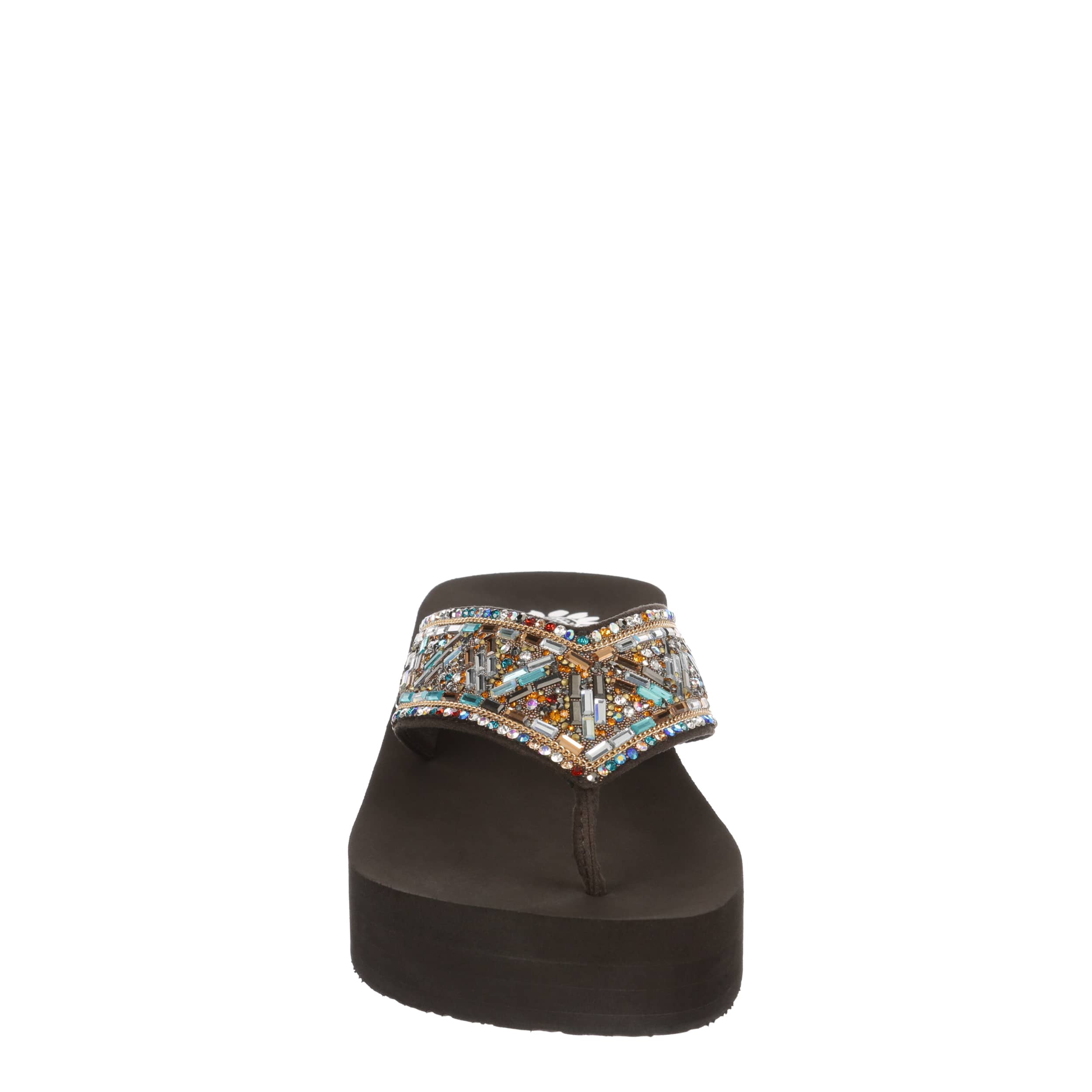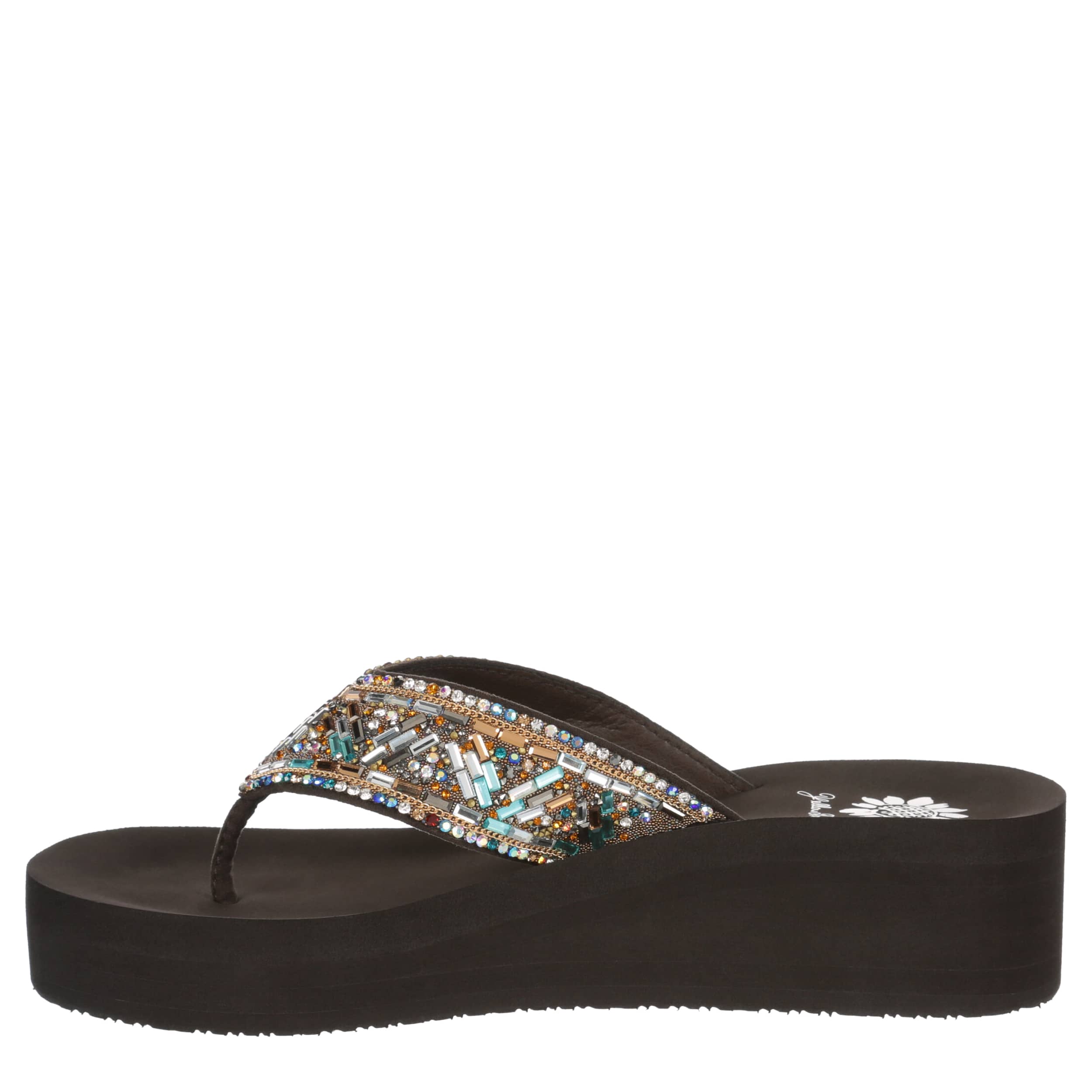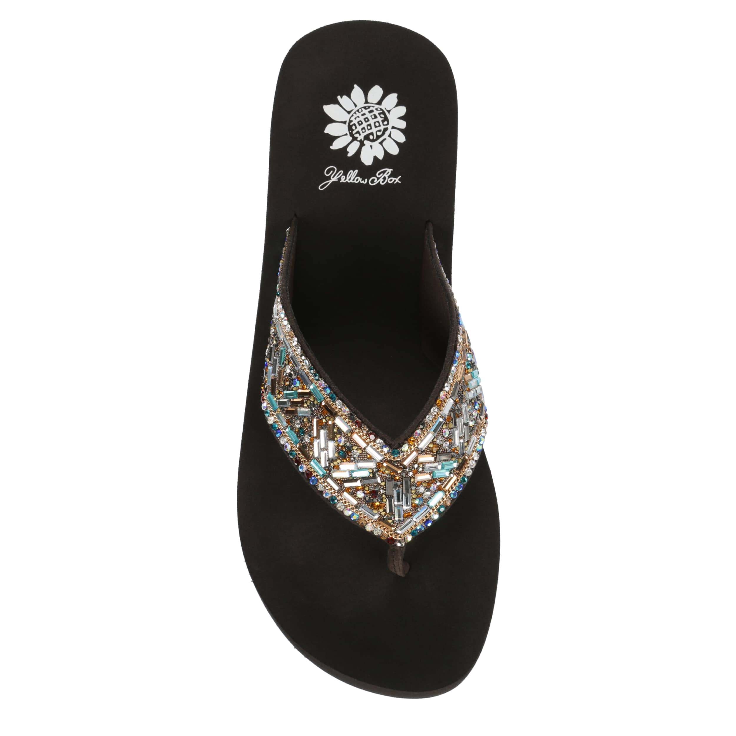 Feel the wind and delight in the colors on your toes in the Rosalie women's flip flop sandal from Yellow Box. Featuring a beaded overlay design, this beautiful thong can be dressed down or up. The contoured footbed cradles your foot with comfort, while the heel adds stable lift.